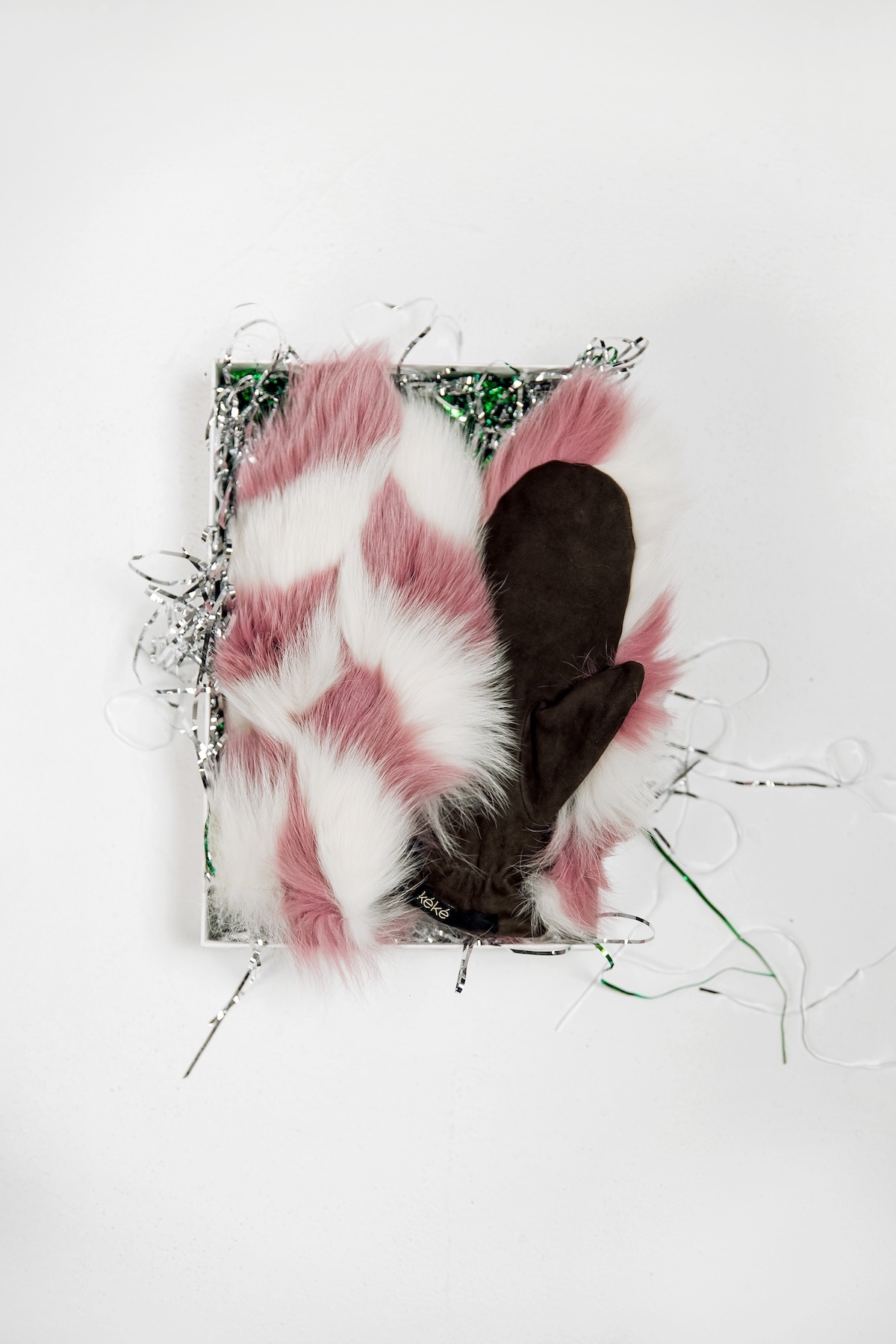 Тыльная сторона выполнена из белого и розового финского песца, узор «лесенка».