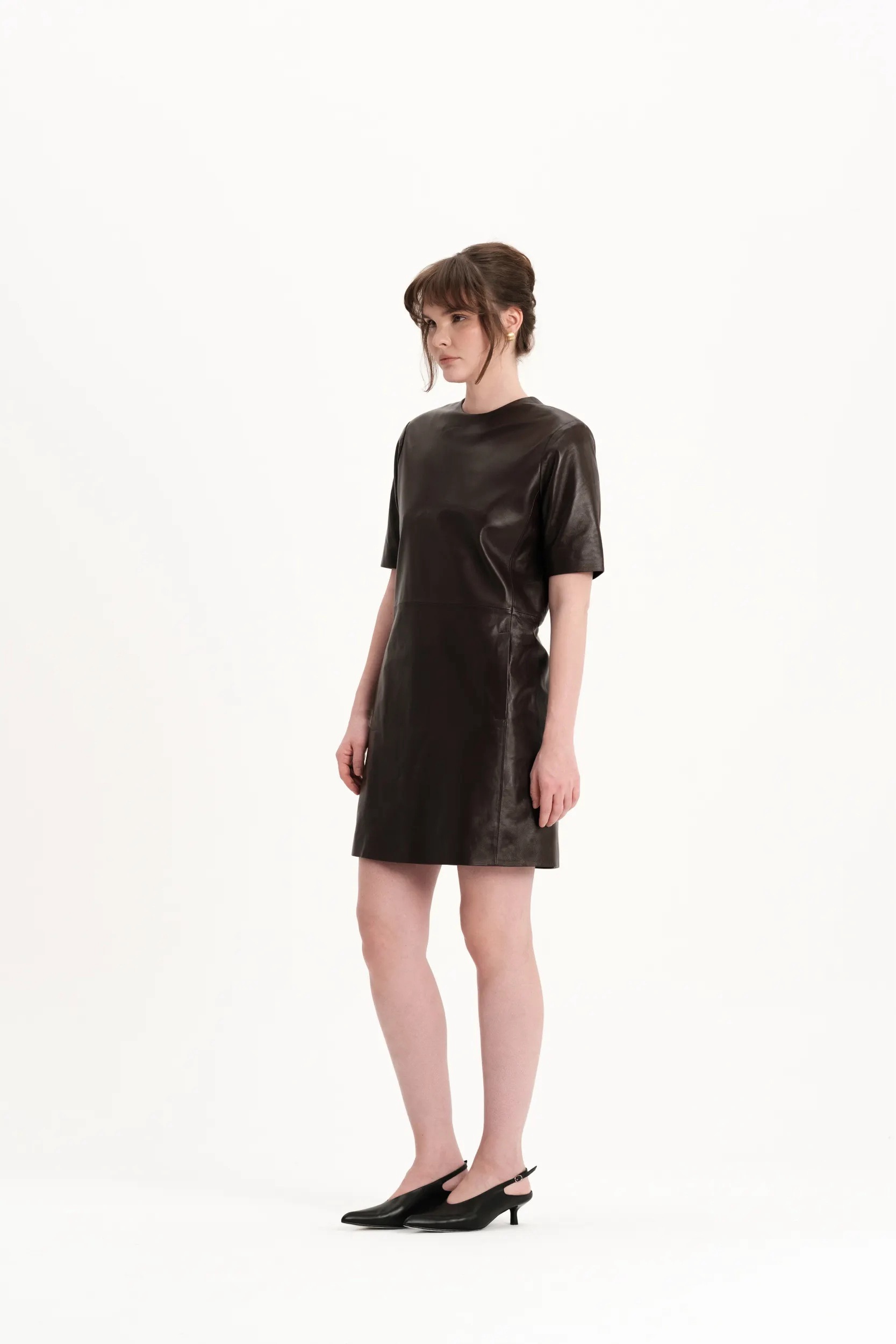 Короткое платье k é k é с приталенным силуэтом, выполненное из натуральной кожи. Застёгивается сзади на молнию. Два кармана спереди.