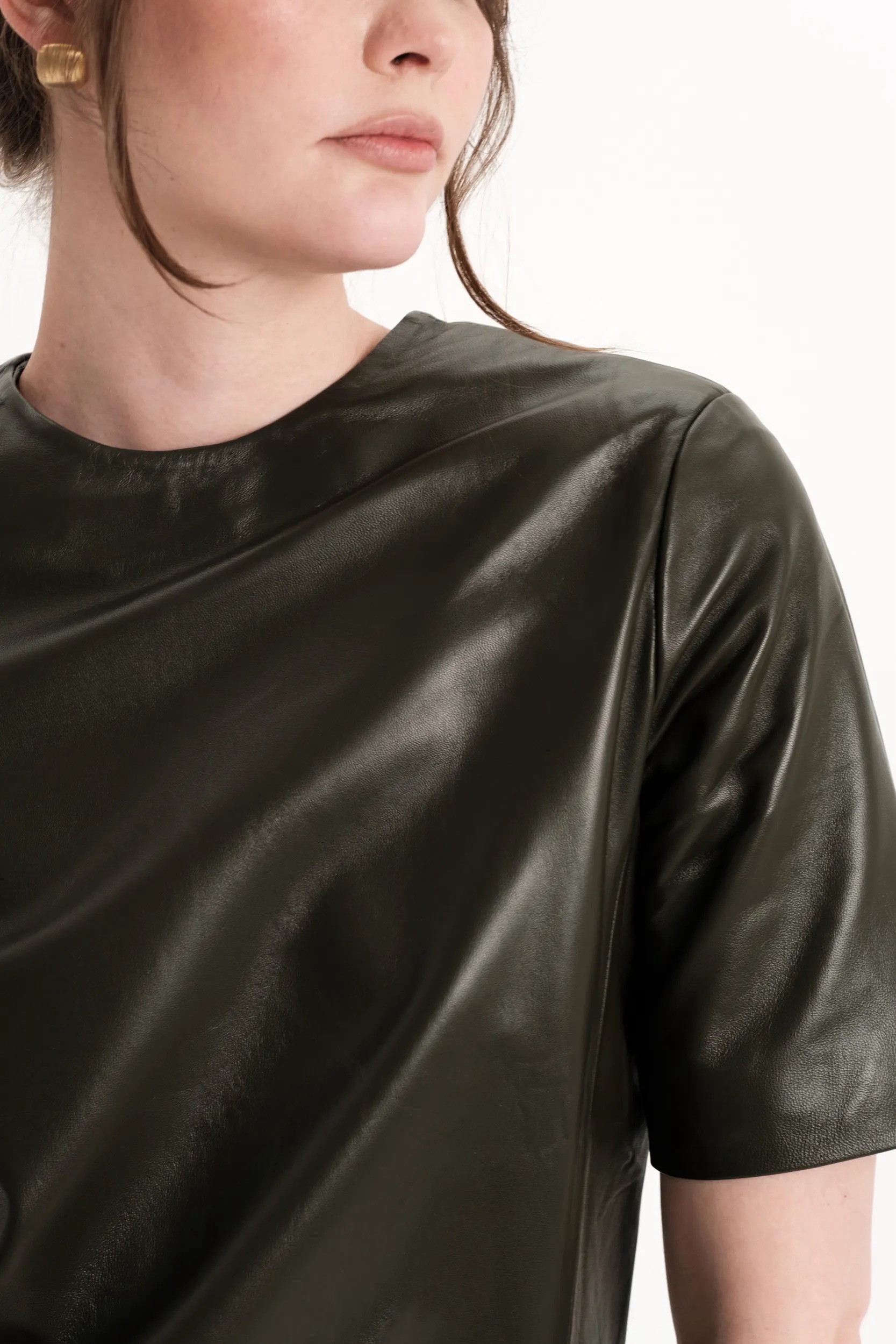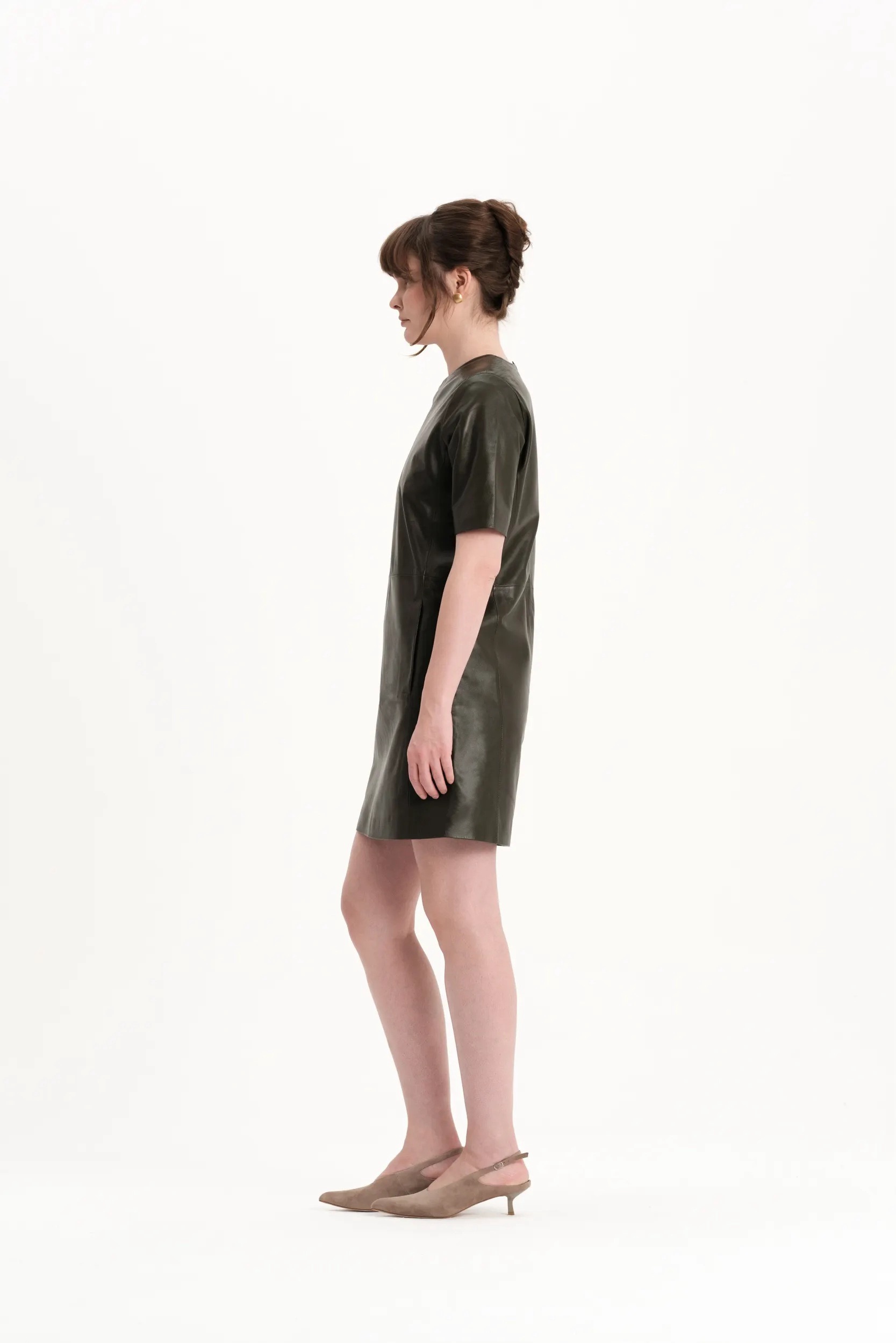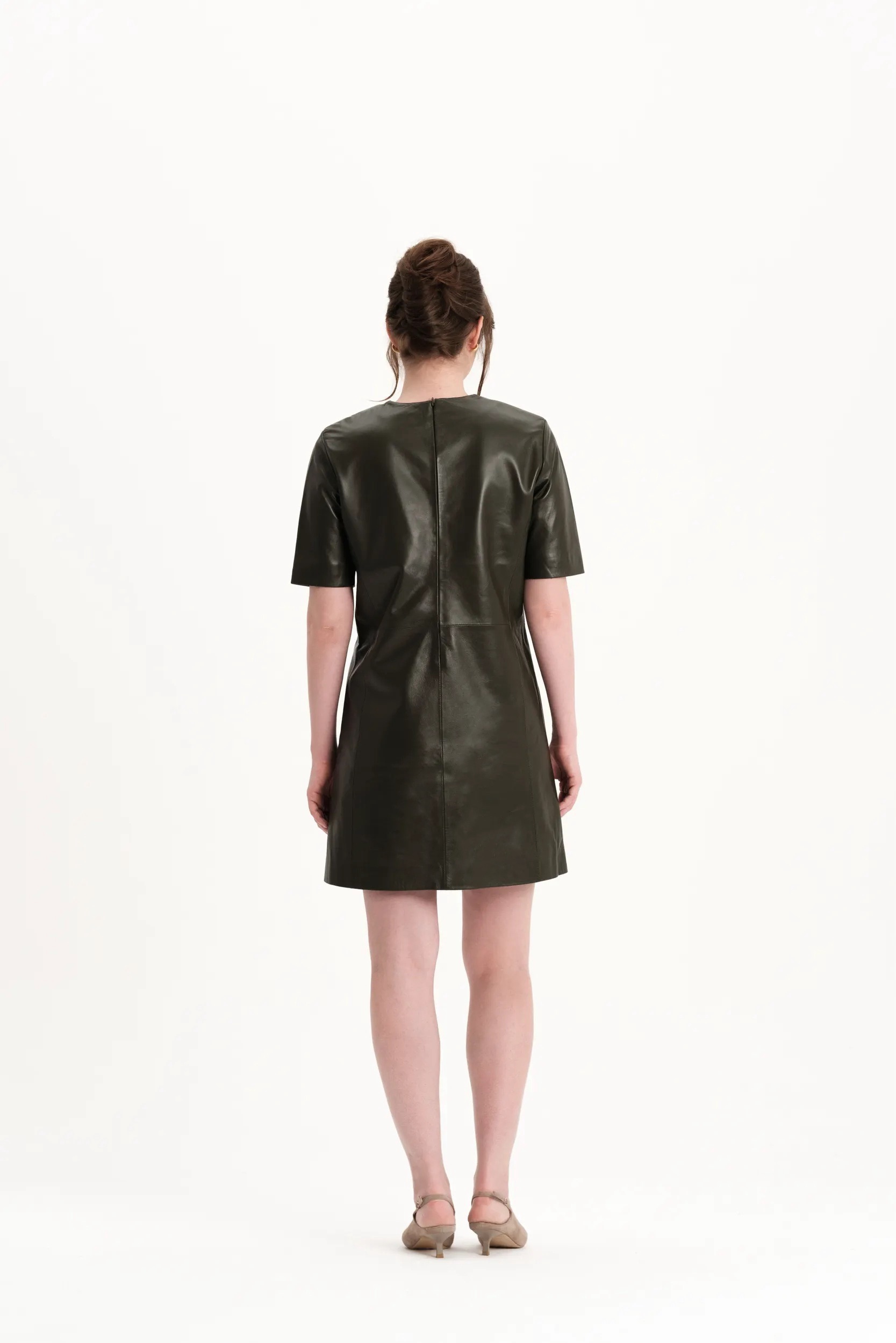 Короткое платье k é k é с приталенный силуэтом, выполненное из натуральной кожи. Застёгивается сзади на молнию. Два прорезных кармана спереди на магнитиках. Подкладка: 55% вискоза, 45% полиэстер.
