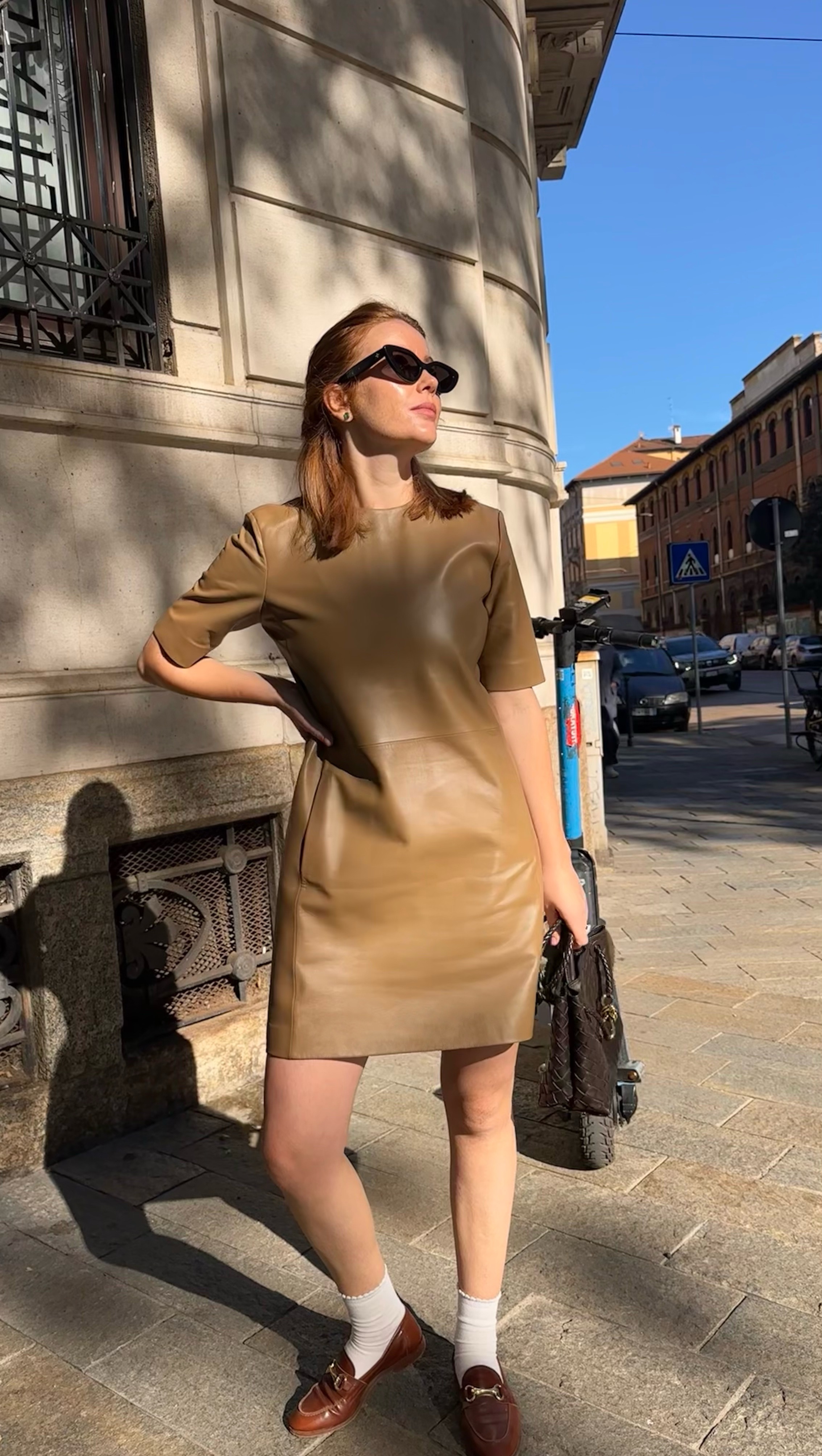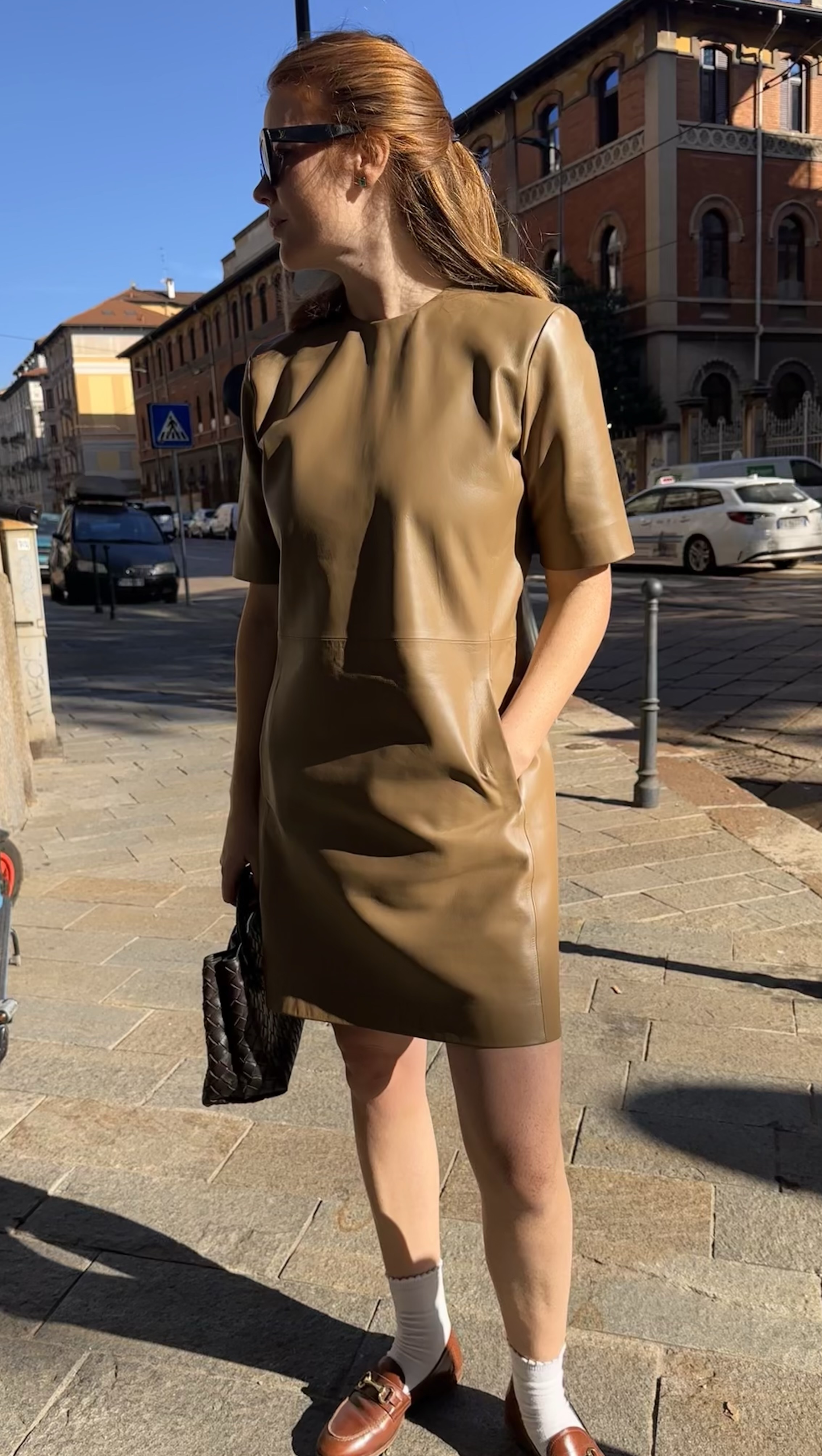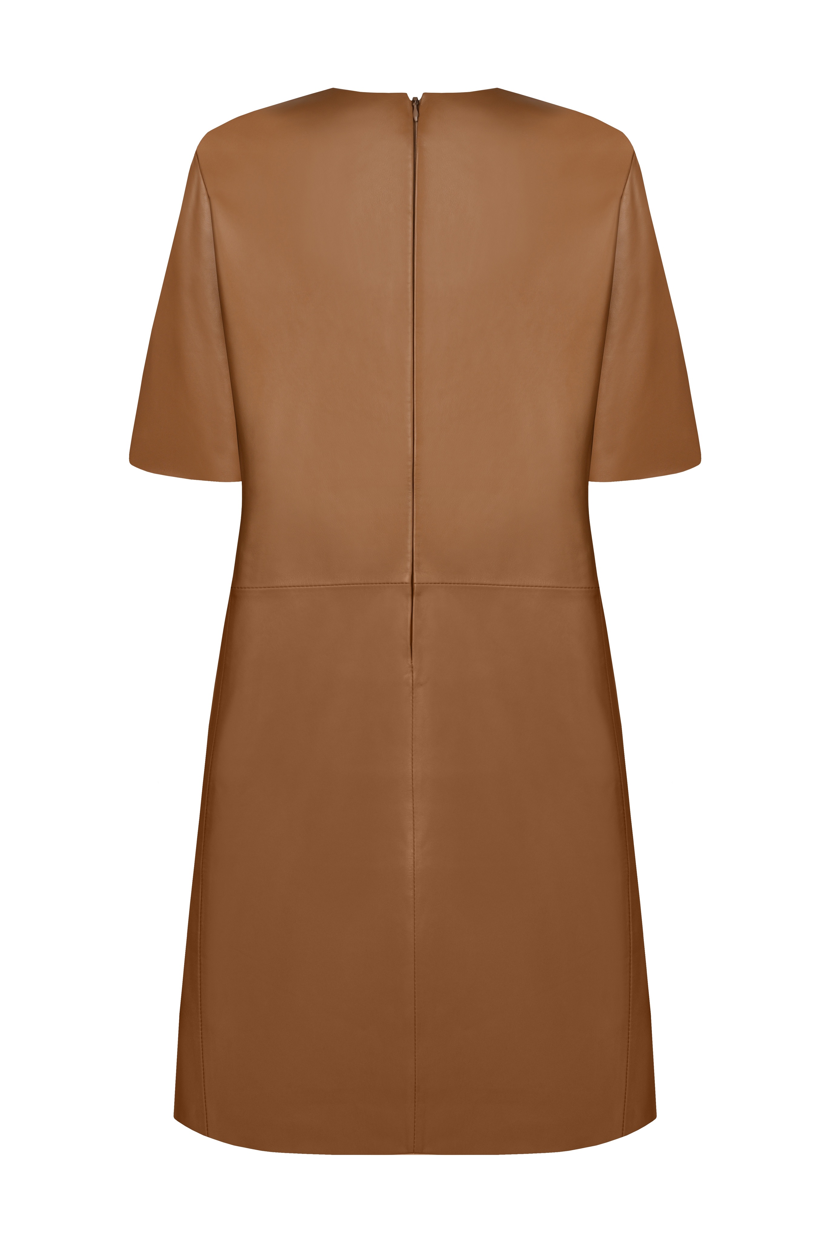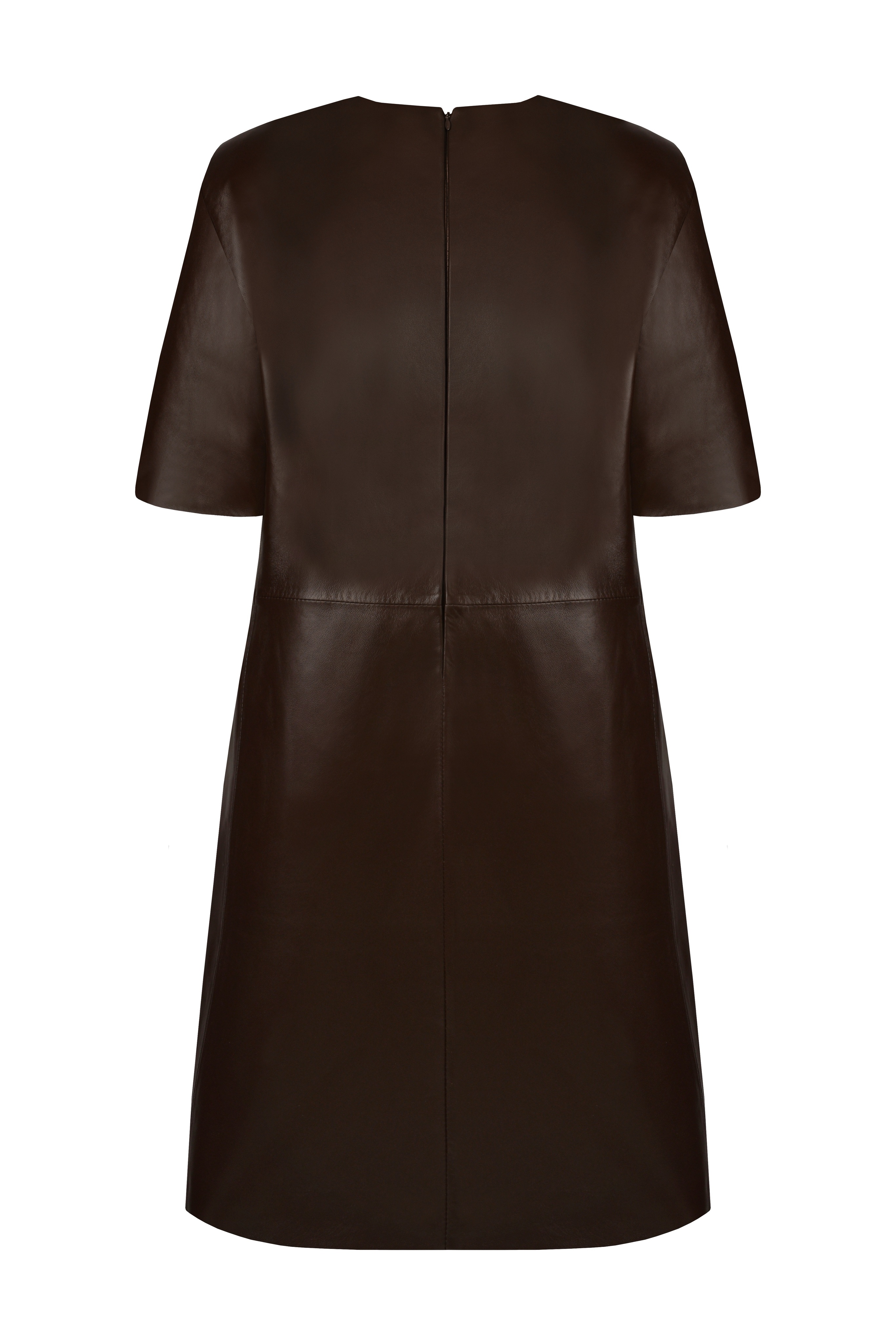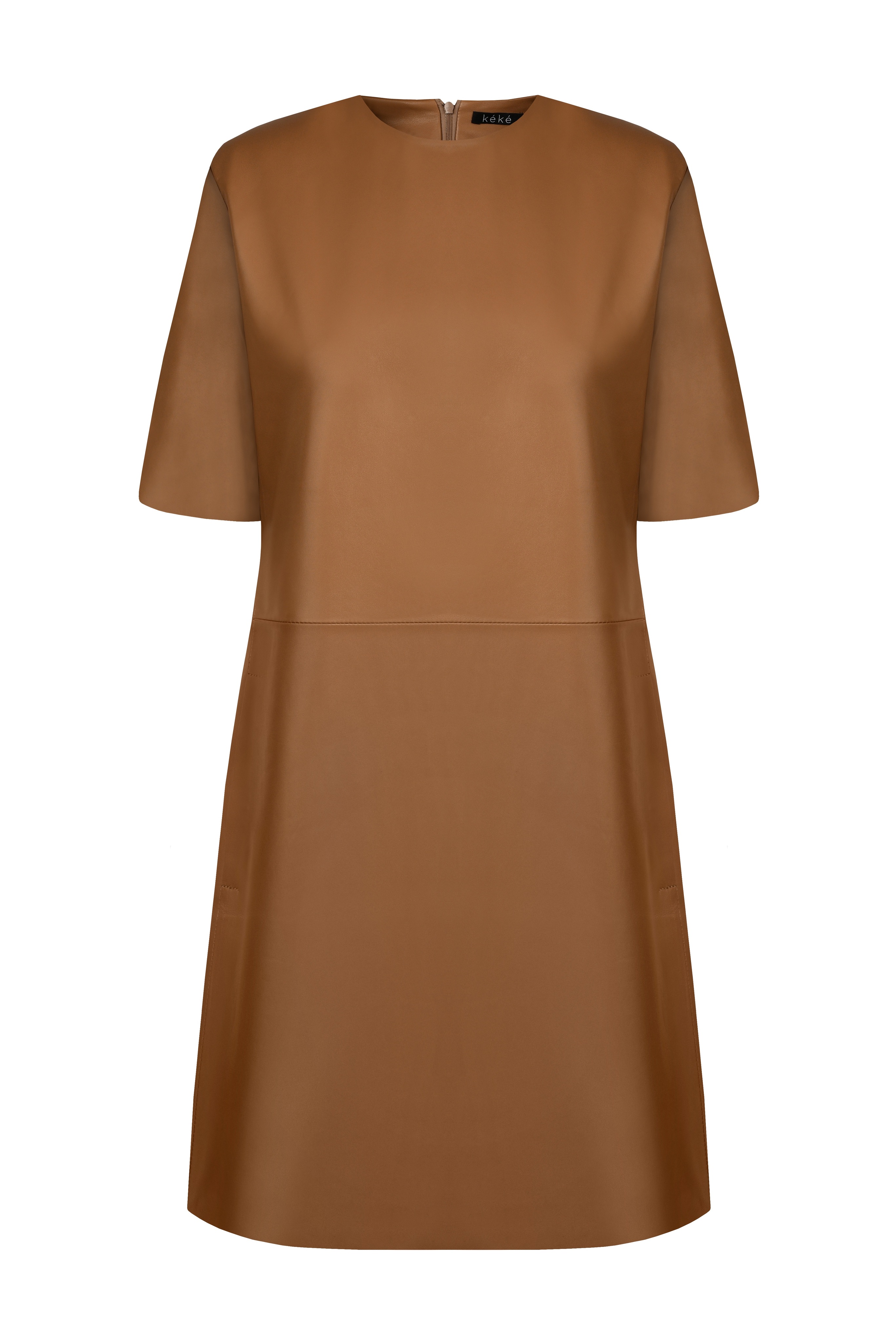 Короткое платье k é k é с приталенным силуэтом, выполненное из натуральной кожи. Застёгивается сзади на молнию. Два кармана спереди.