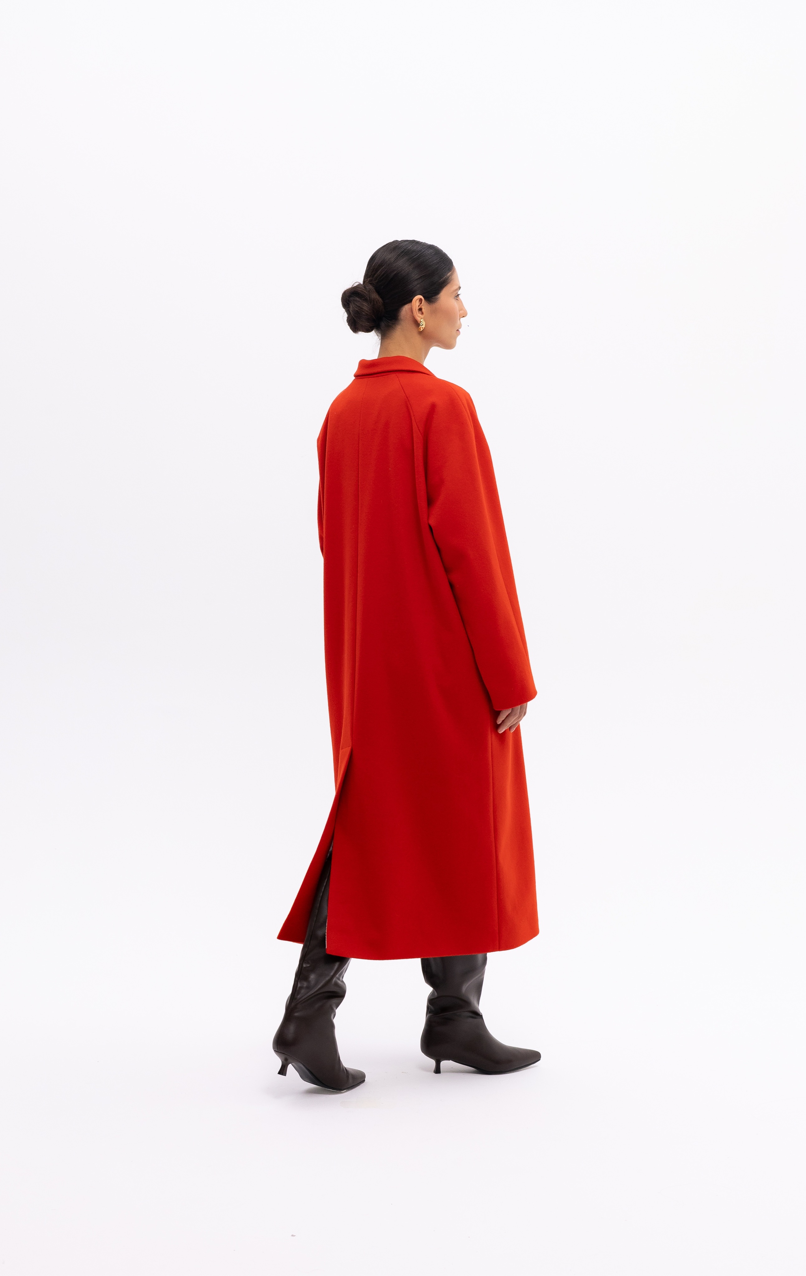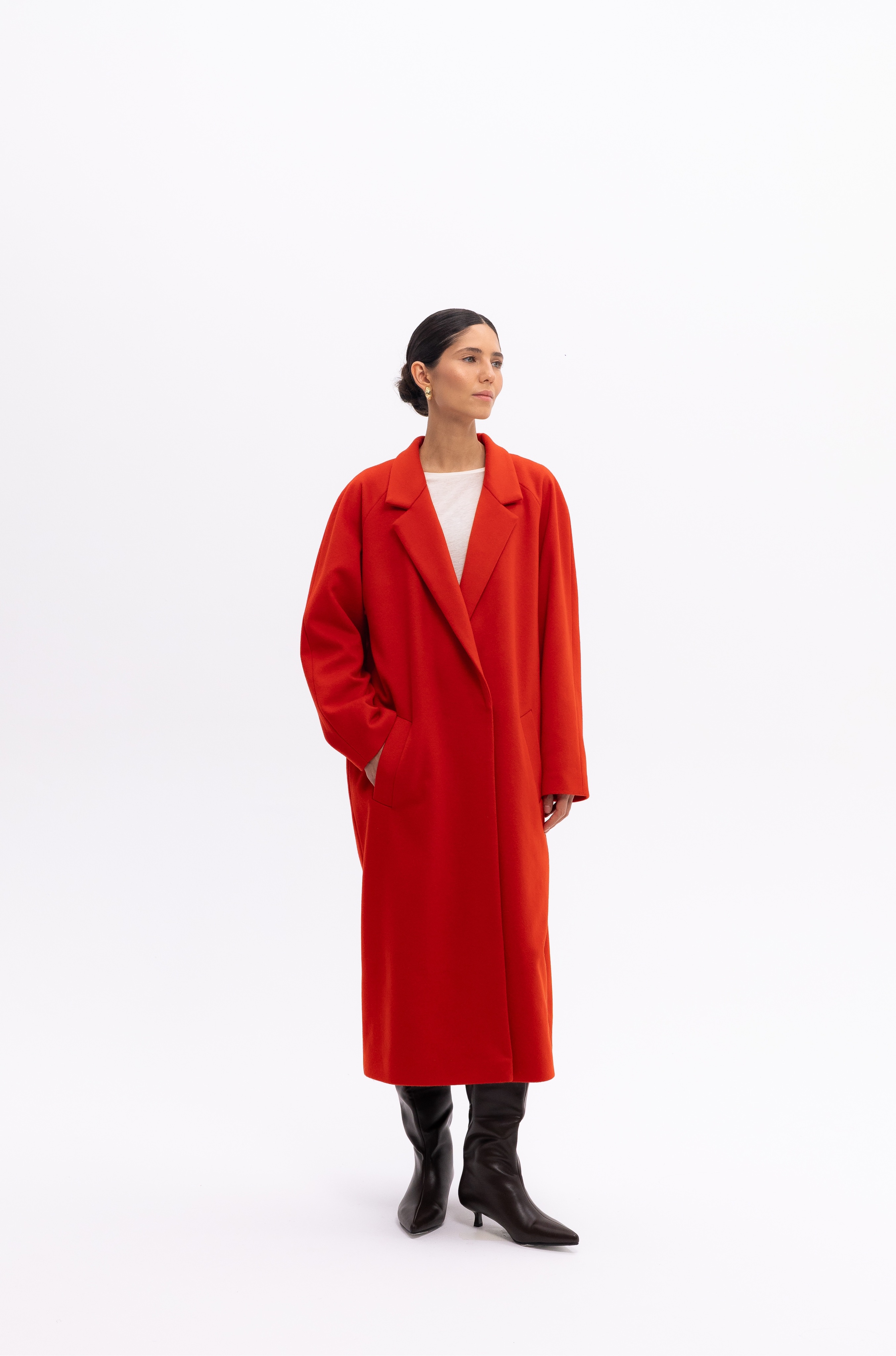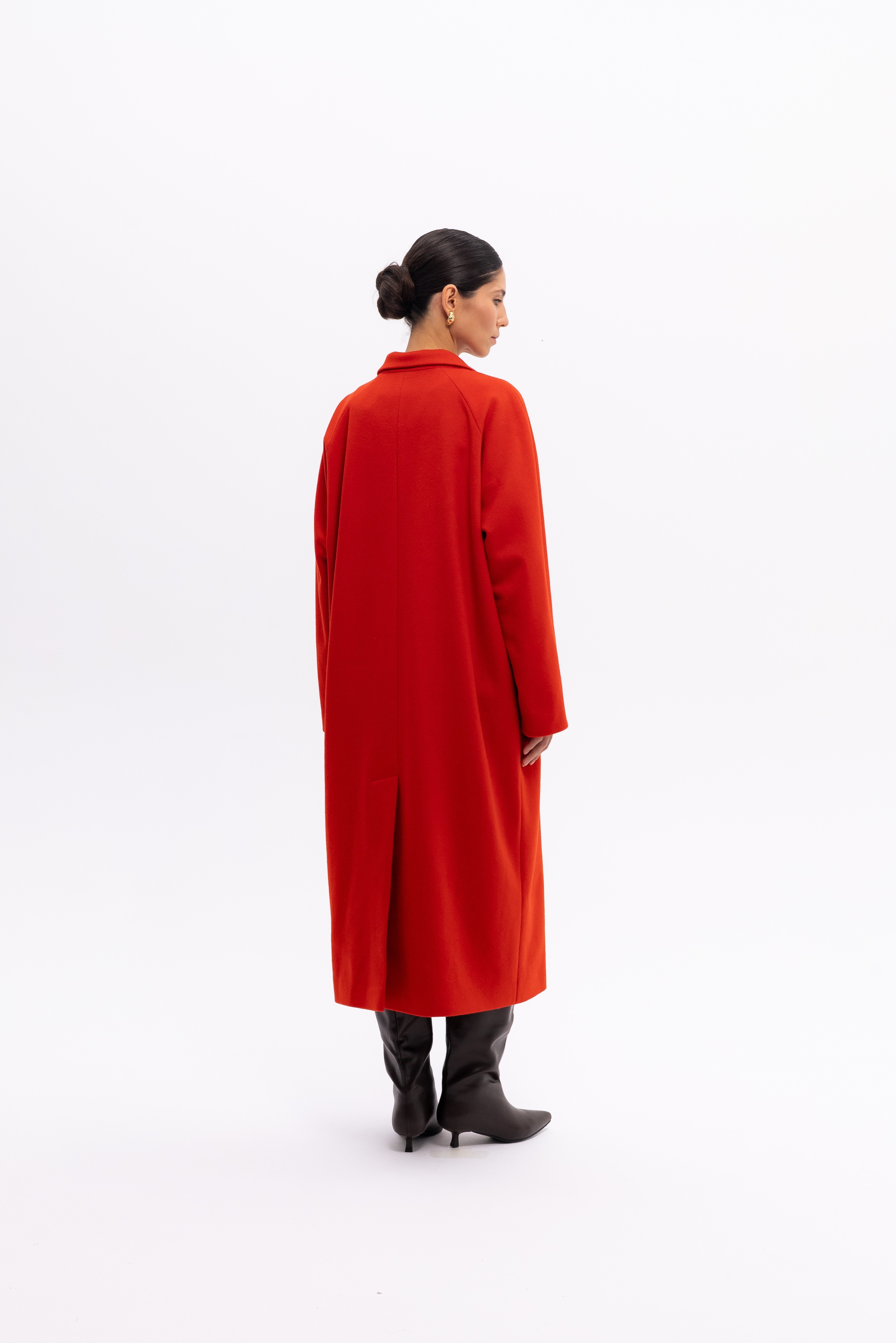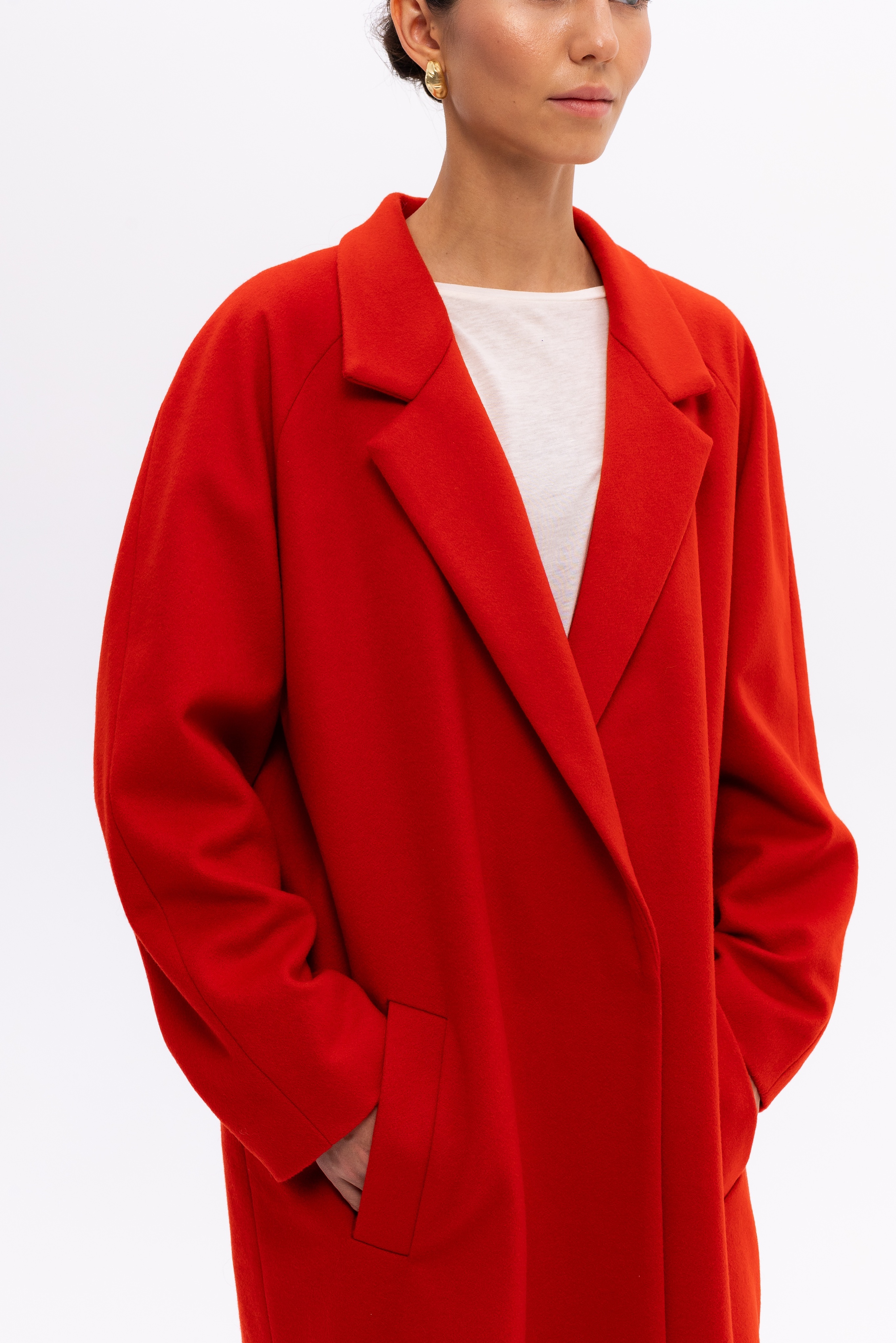 Красное двубортное пальто k é k é свободного кроя. Застешивается спереди на 2 кнопки. Два передних кармана, один потайной карман в подкладке. Пальто представлено в двух размерах S и M. Длина изделия - 119 см