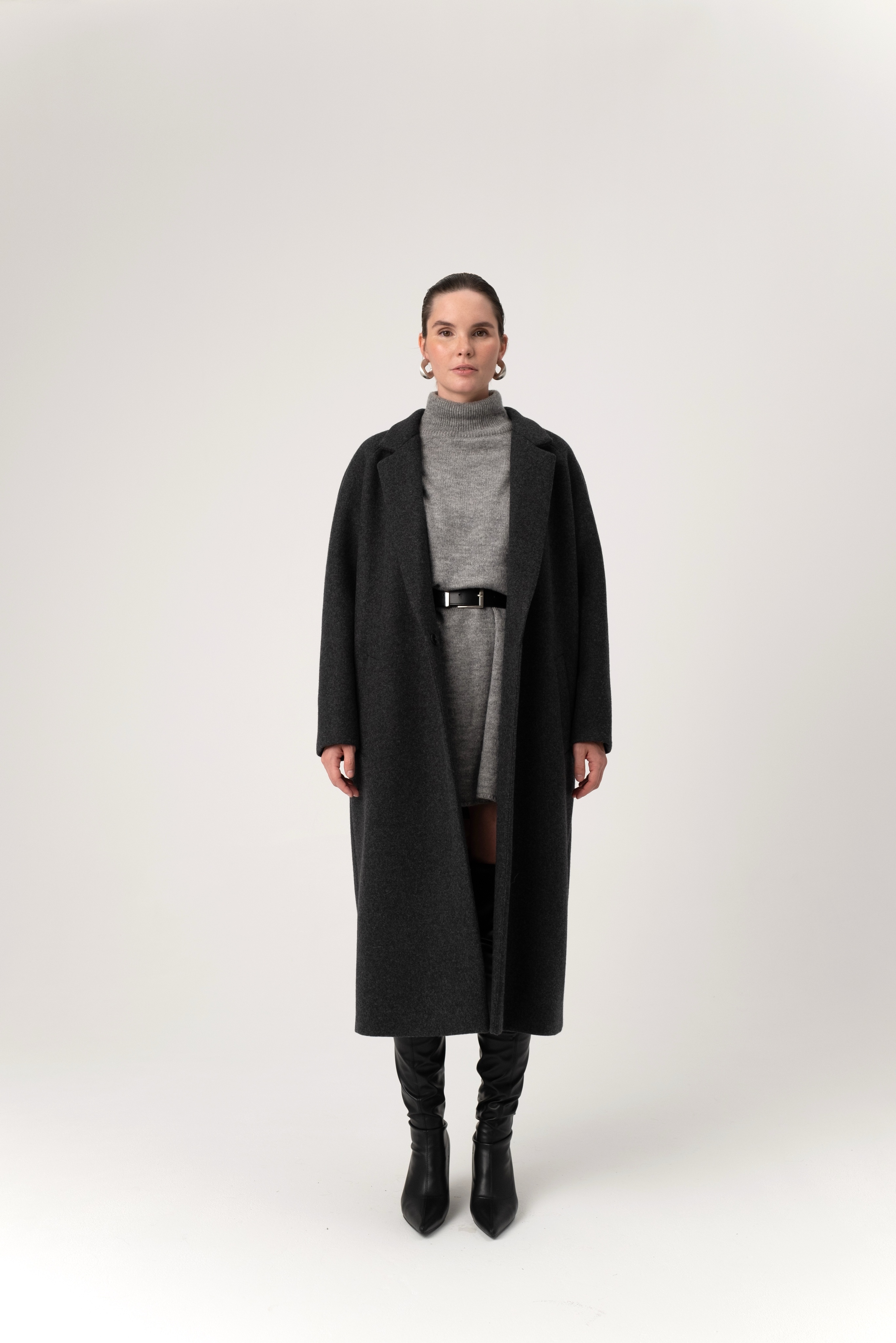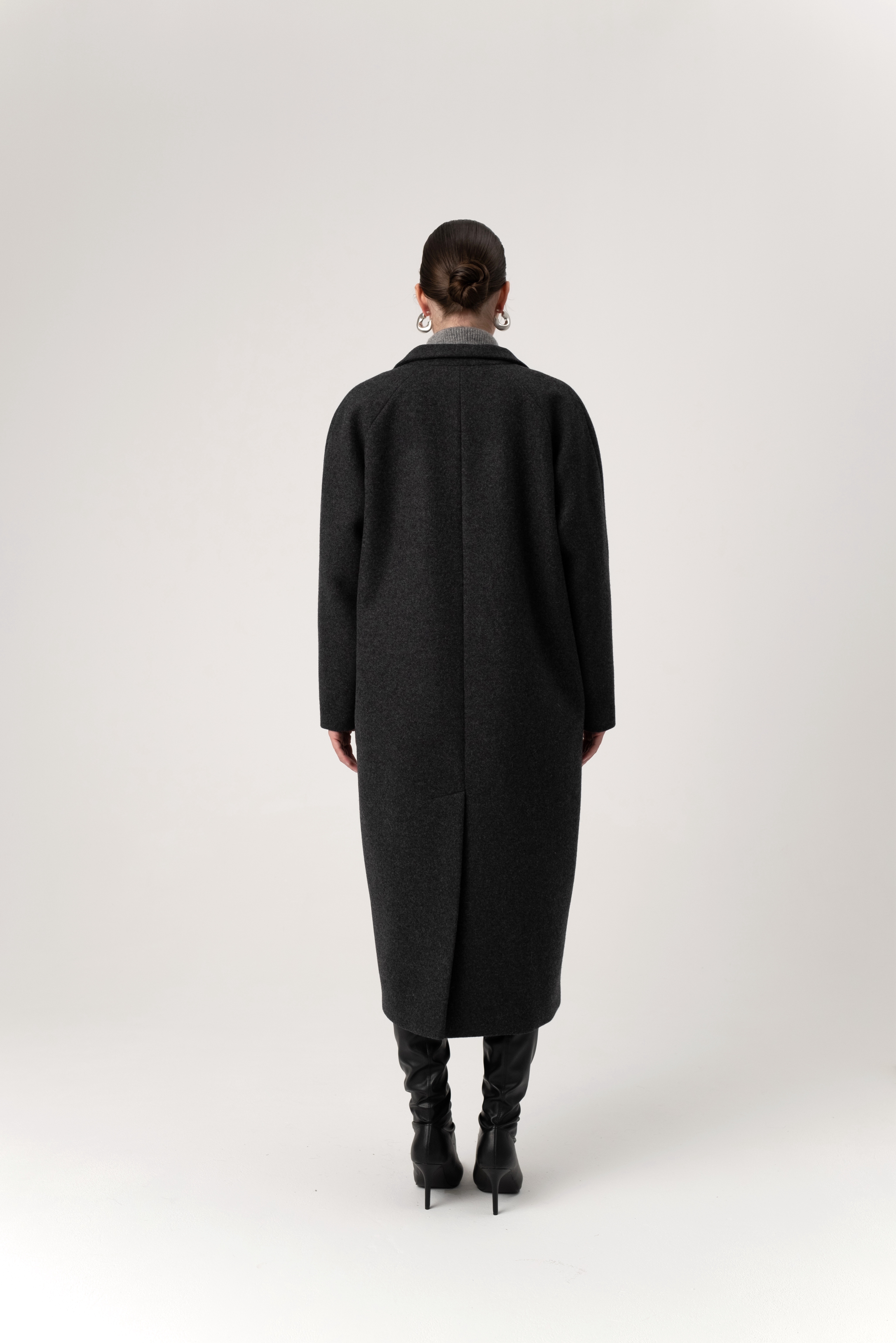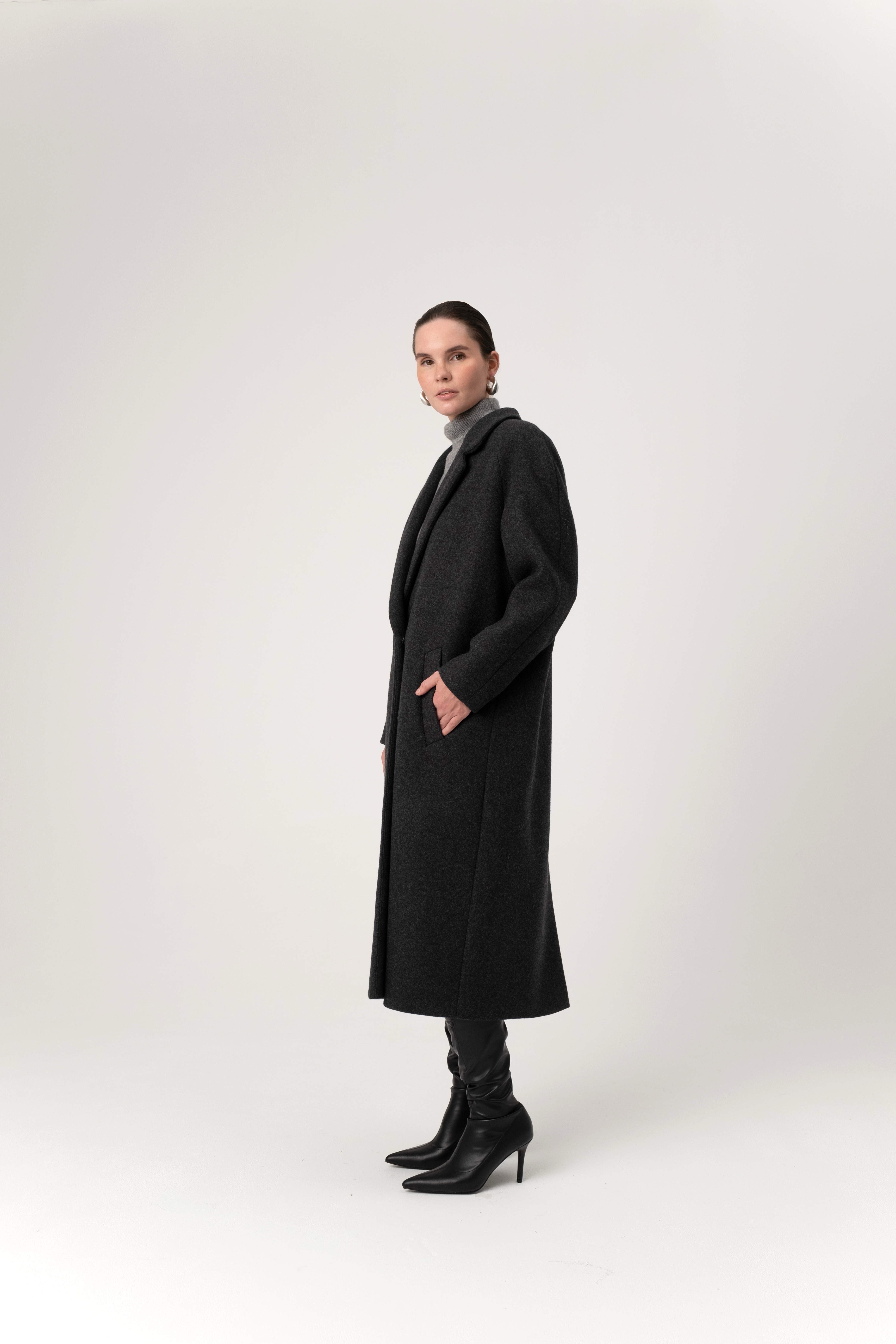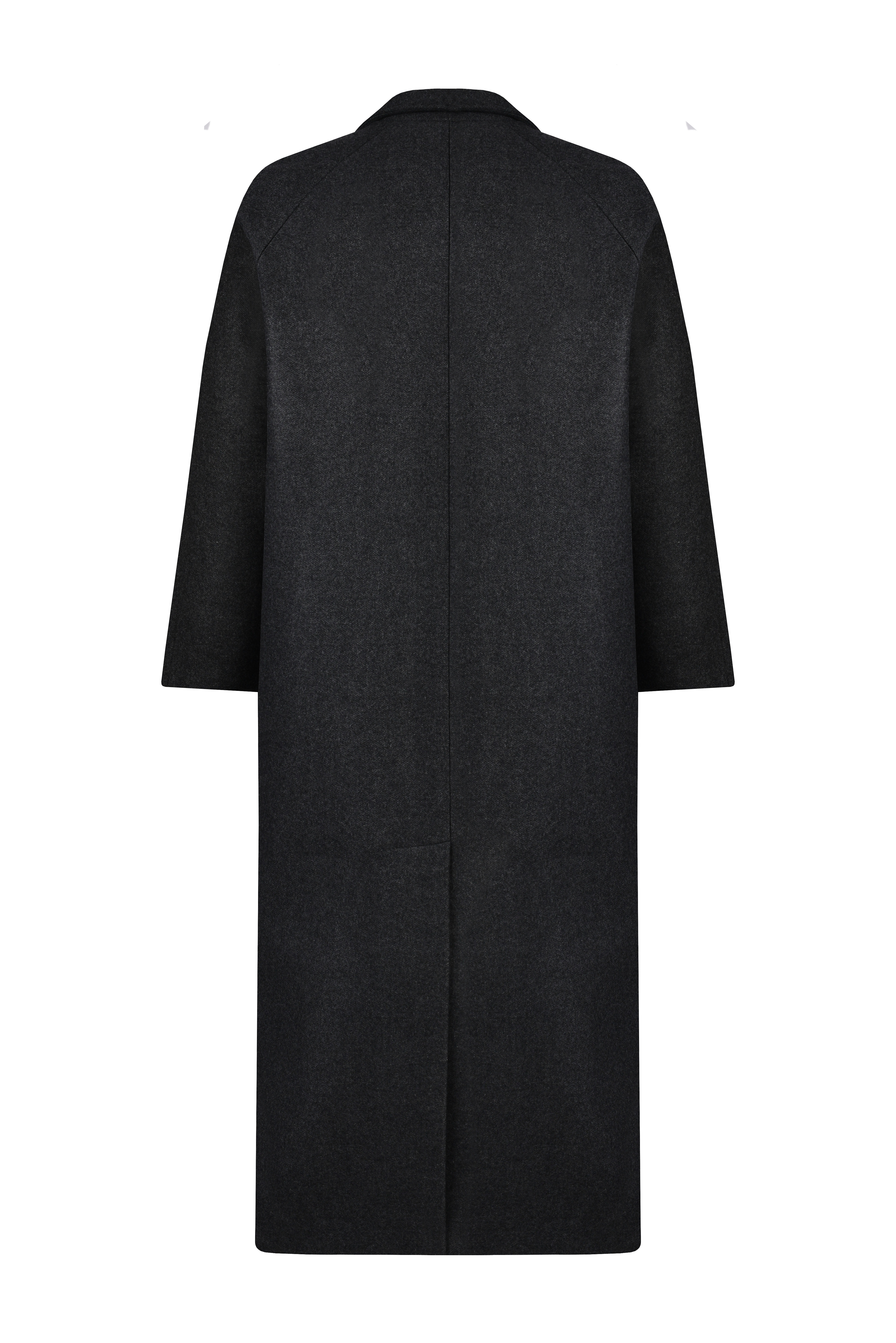 Длинное двубортное пальто k é k é из 100% итальянского кашемира. Застегивается спереди на две кнопки. Два кармана спереди. Подкладка - 100% вискоза. Длина изделия - 119 см.