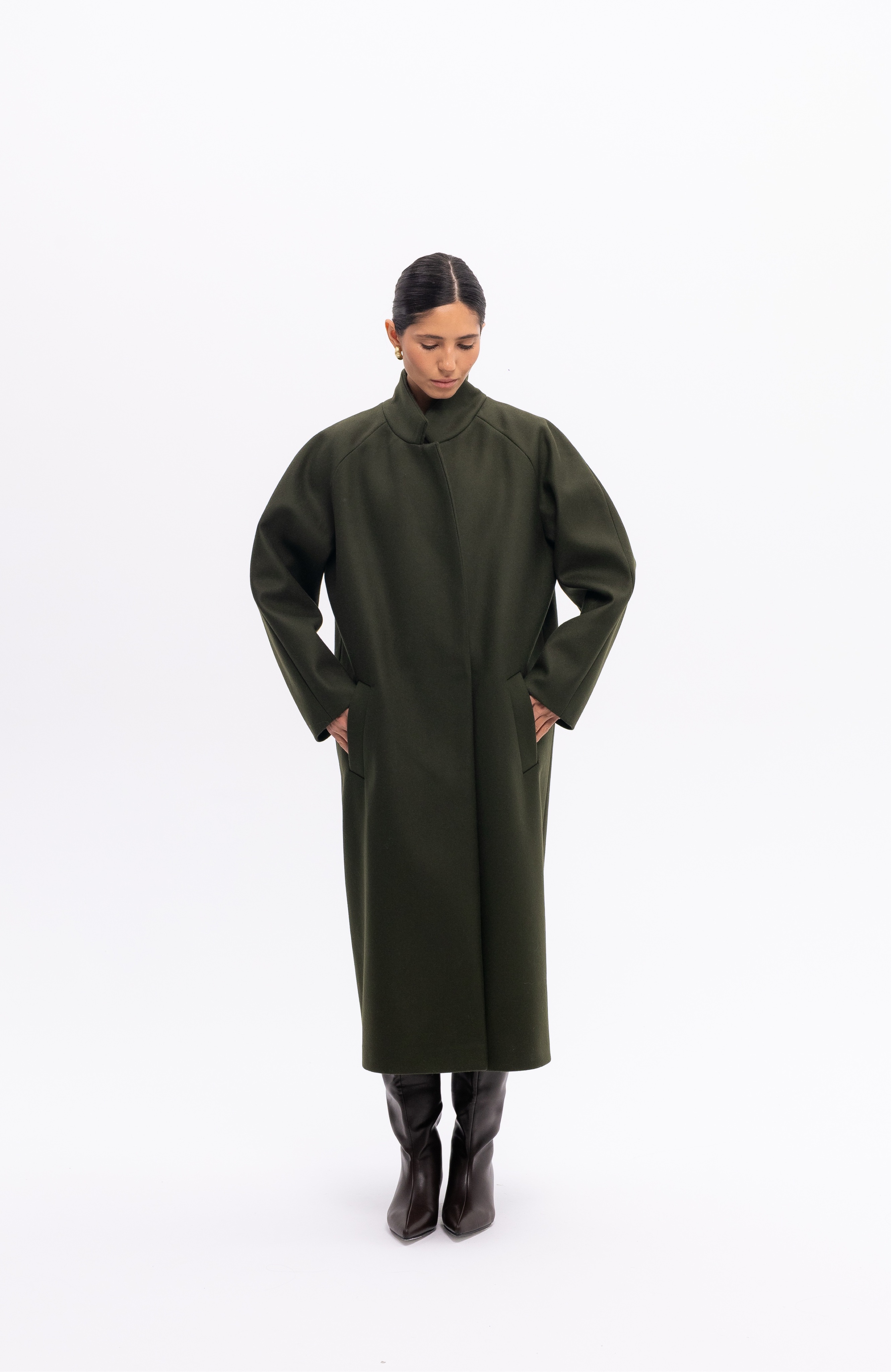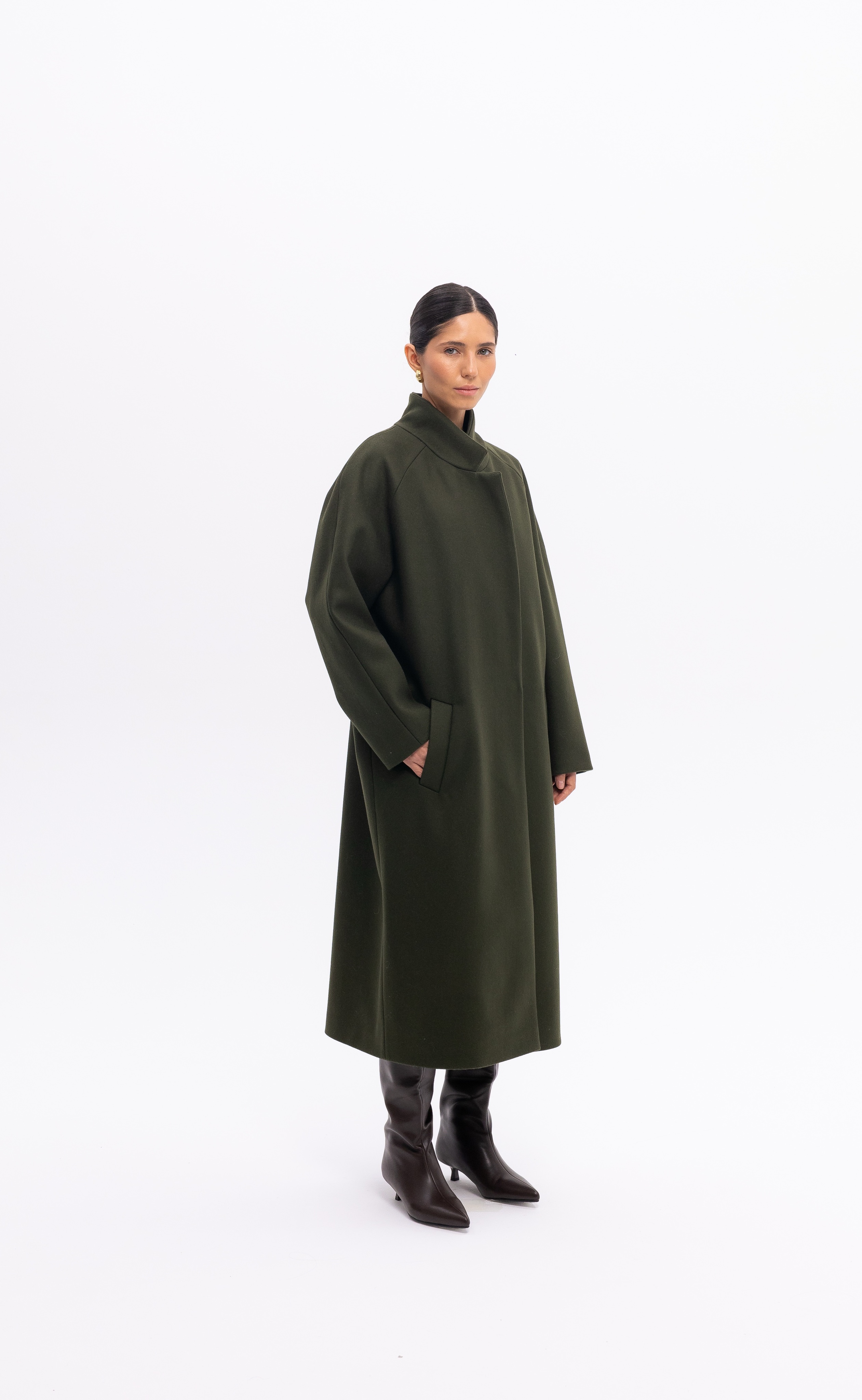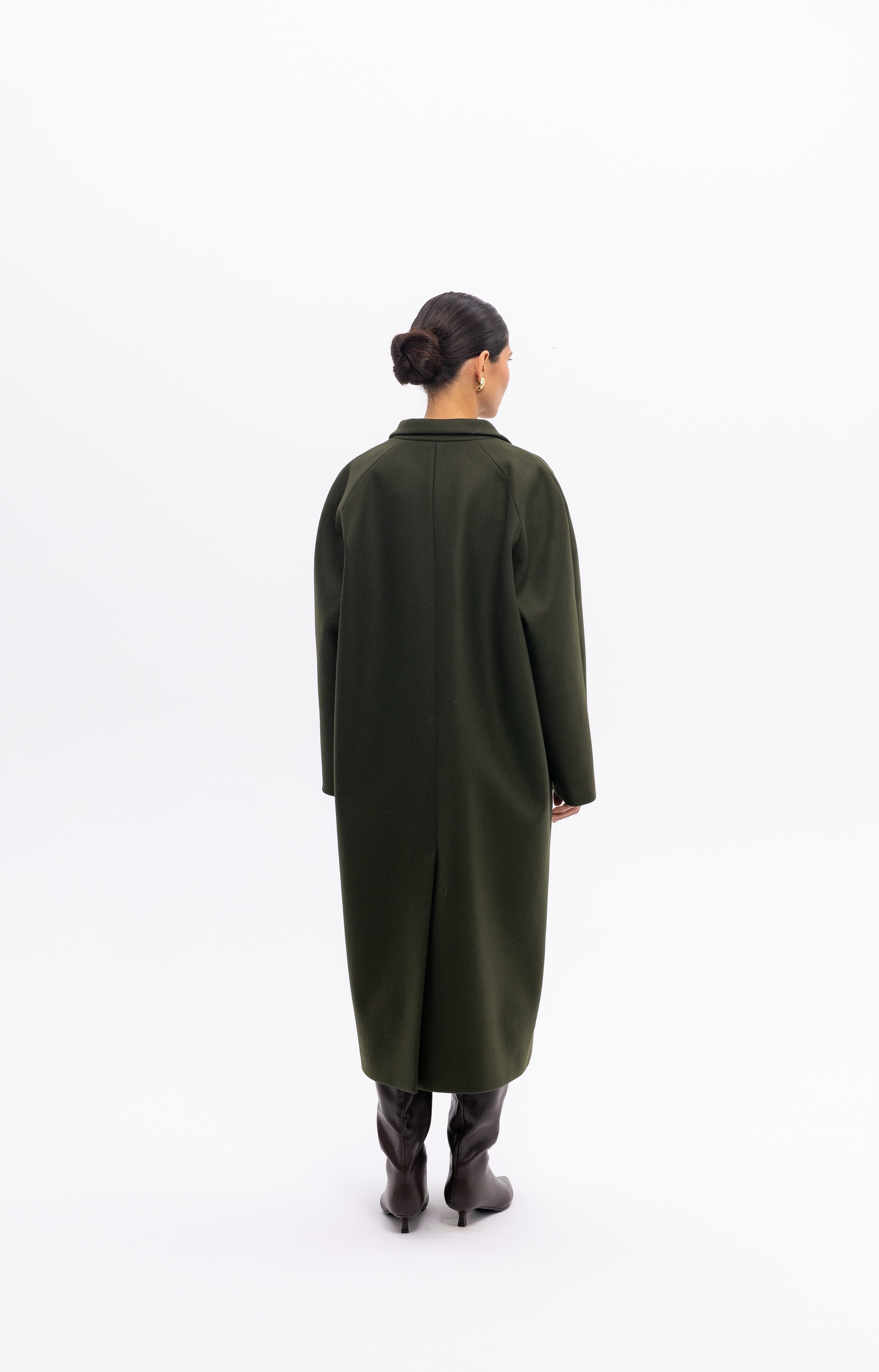 Темно-зеленое двубортное пальто k é k é свободного кроя. Пальто выполнено из 100% плотной итальянской шерсти. Два кармана спереди и один потайной карман в подкладке. Застегивается спереди на 2 кнопки. Длина изделия - 119 см.
