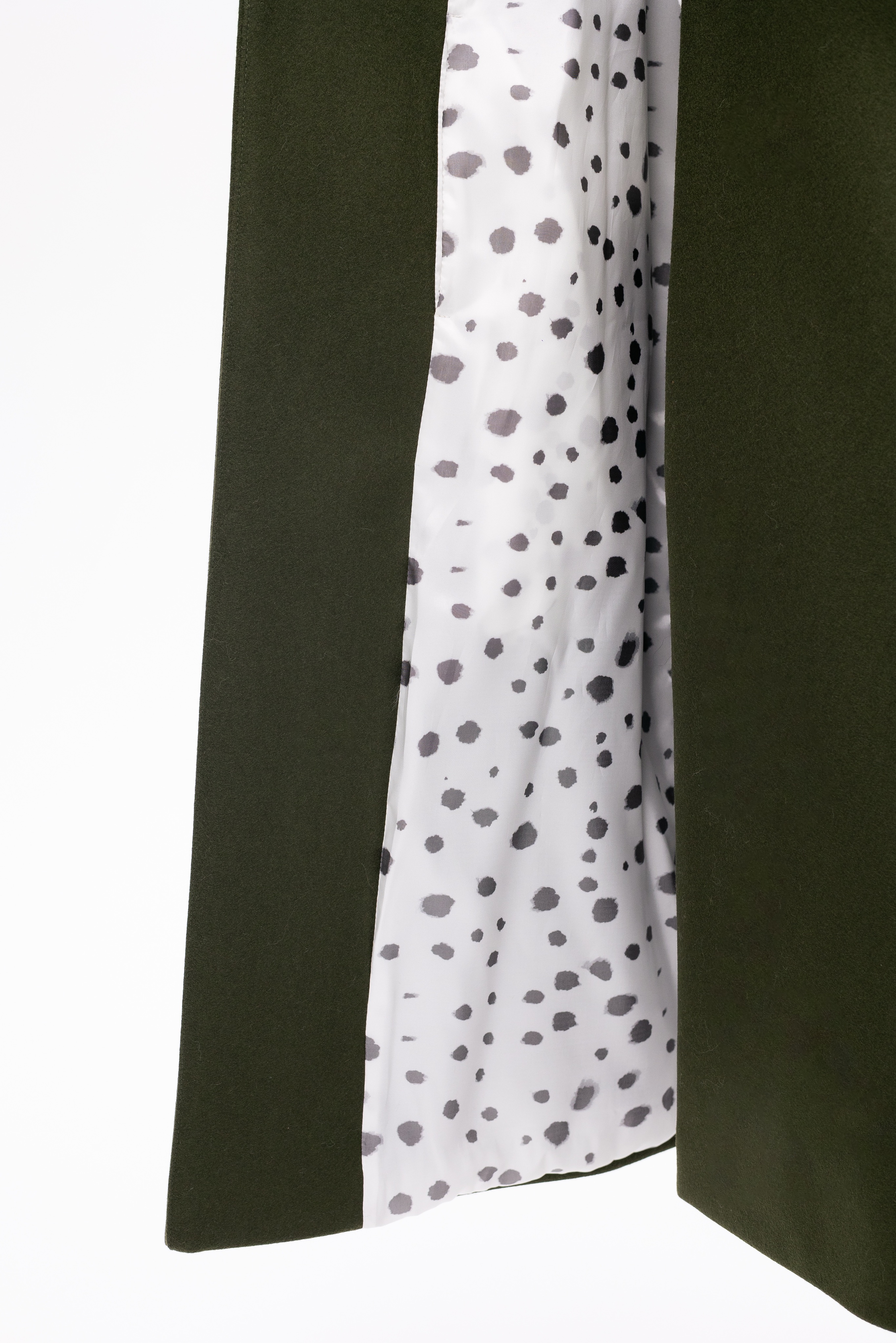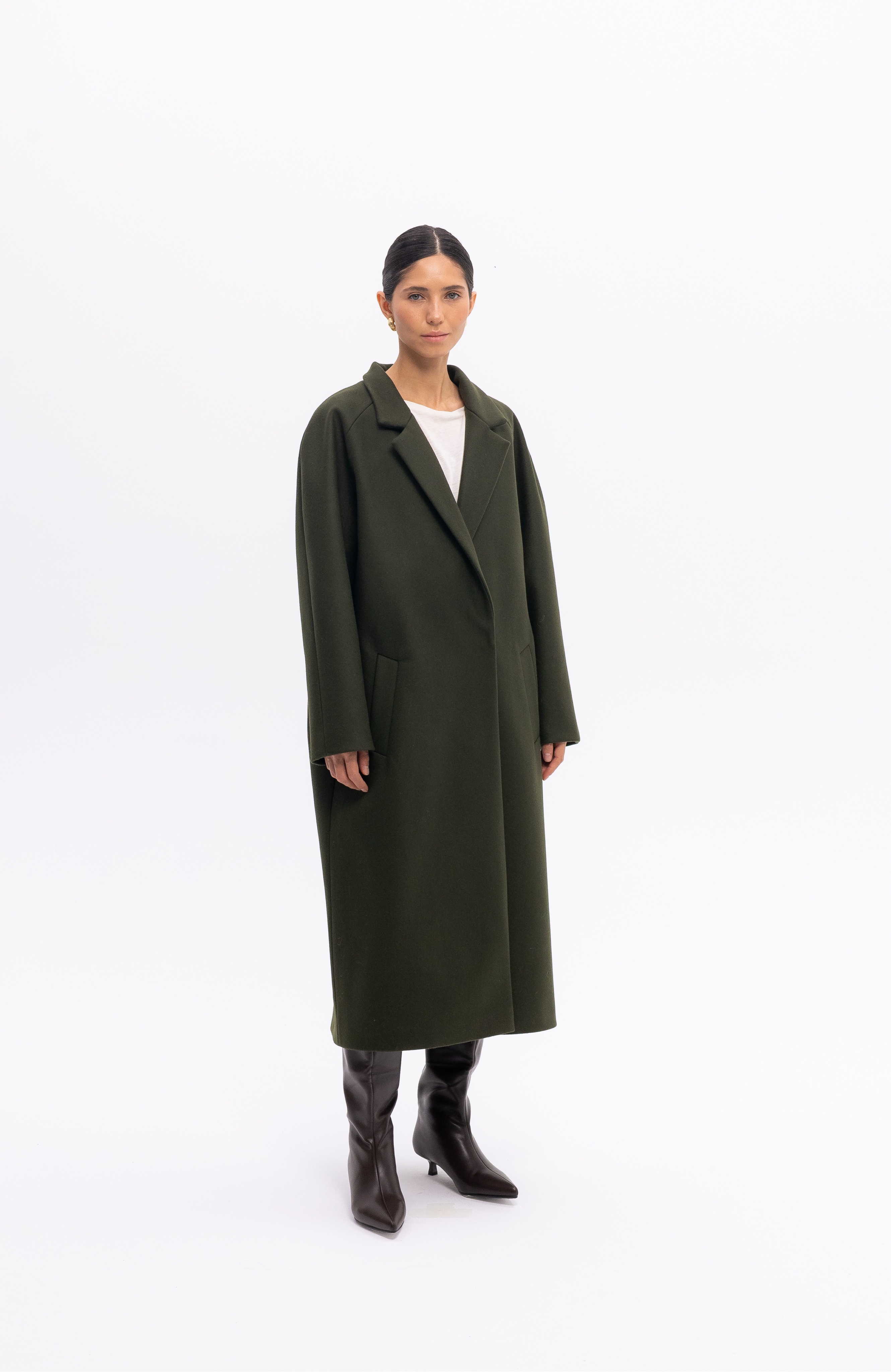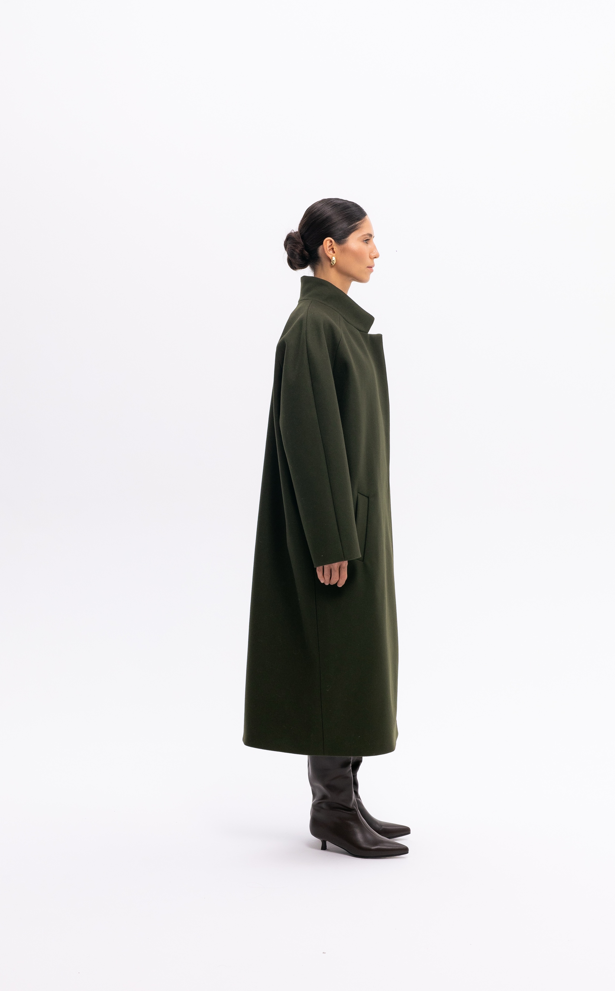 Темно-зеленое двубортное пальто k é k é свободного кроя. Пальто выполнено из 100% плотной итальянской шерсти. Два кармана спереди и один потайной карман в подкладке. Застегивается спереди на 2 кнопки. Длина изделия - 119 см.