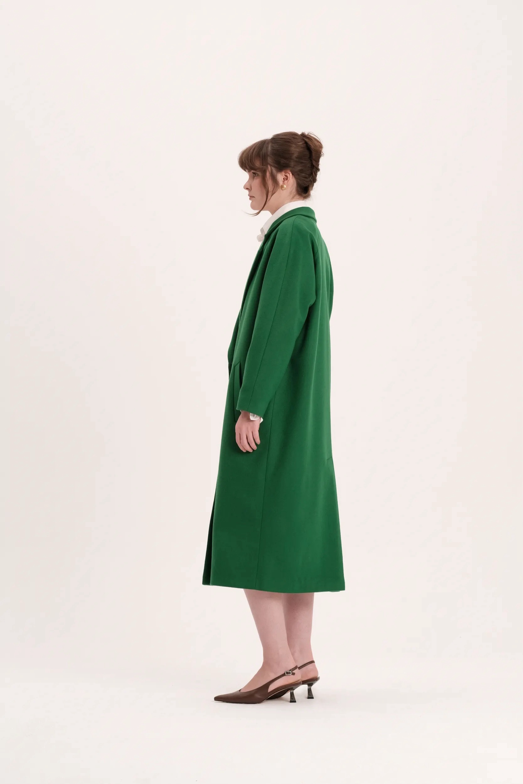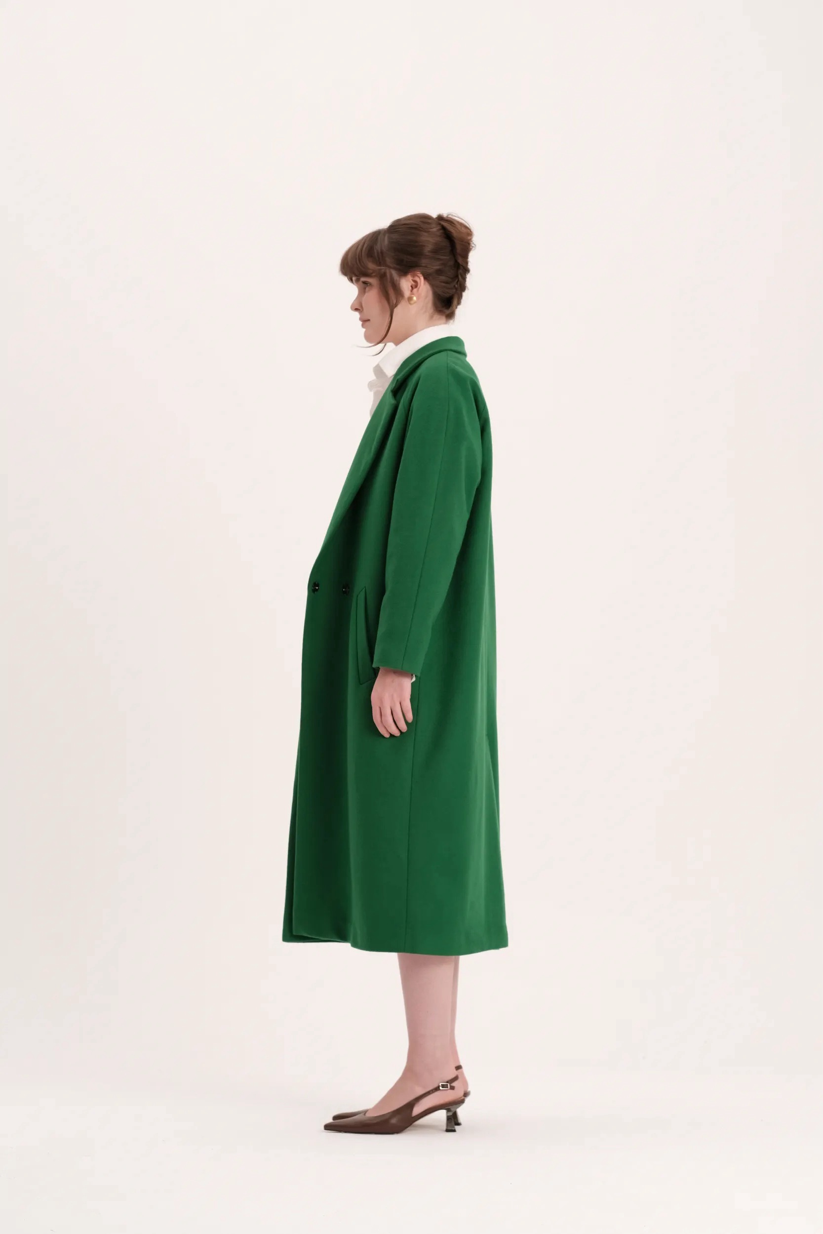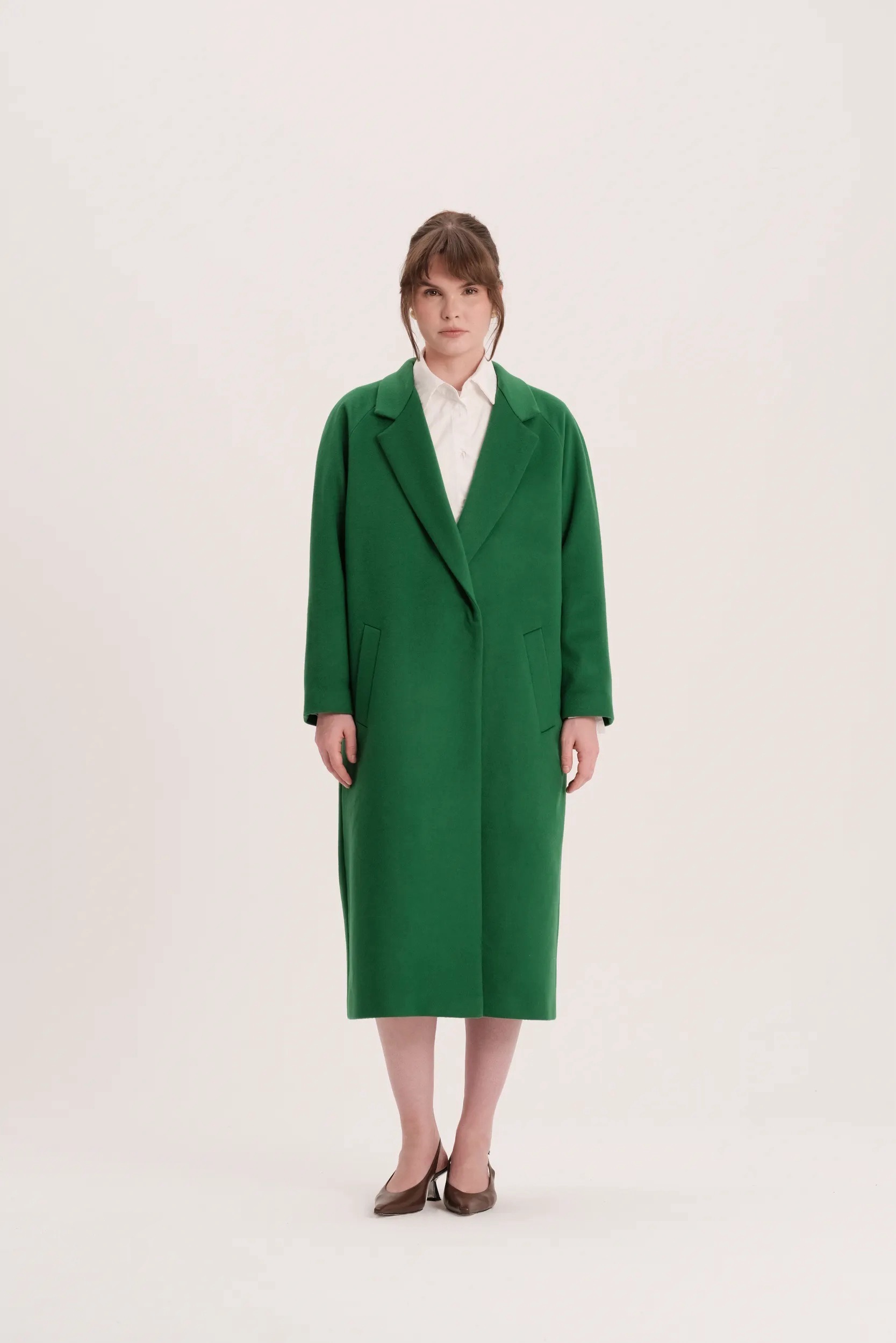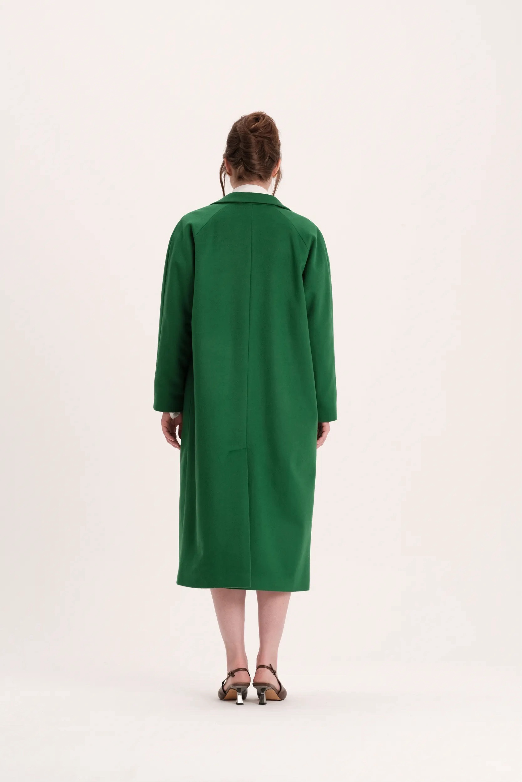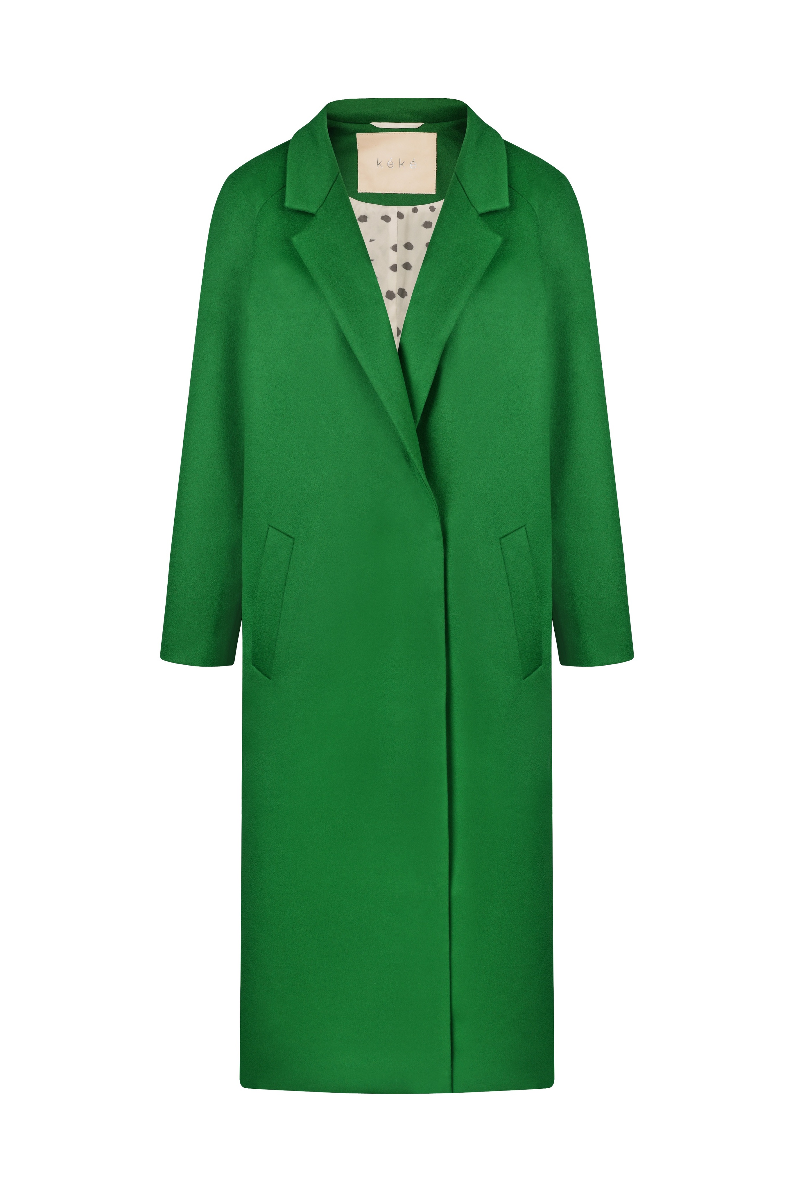 Двубортное ярко-зеленое пальто k é k é. Застёгивается спереди на две кнопки, два передних кармана, шлица сзади. Состав: 80% шерсть, 20% кашемир. Подкладка: 55% вискоза, 45% полиэстер. Пальто доступно в двух размерах: S и М.