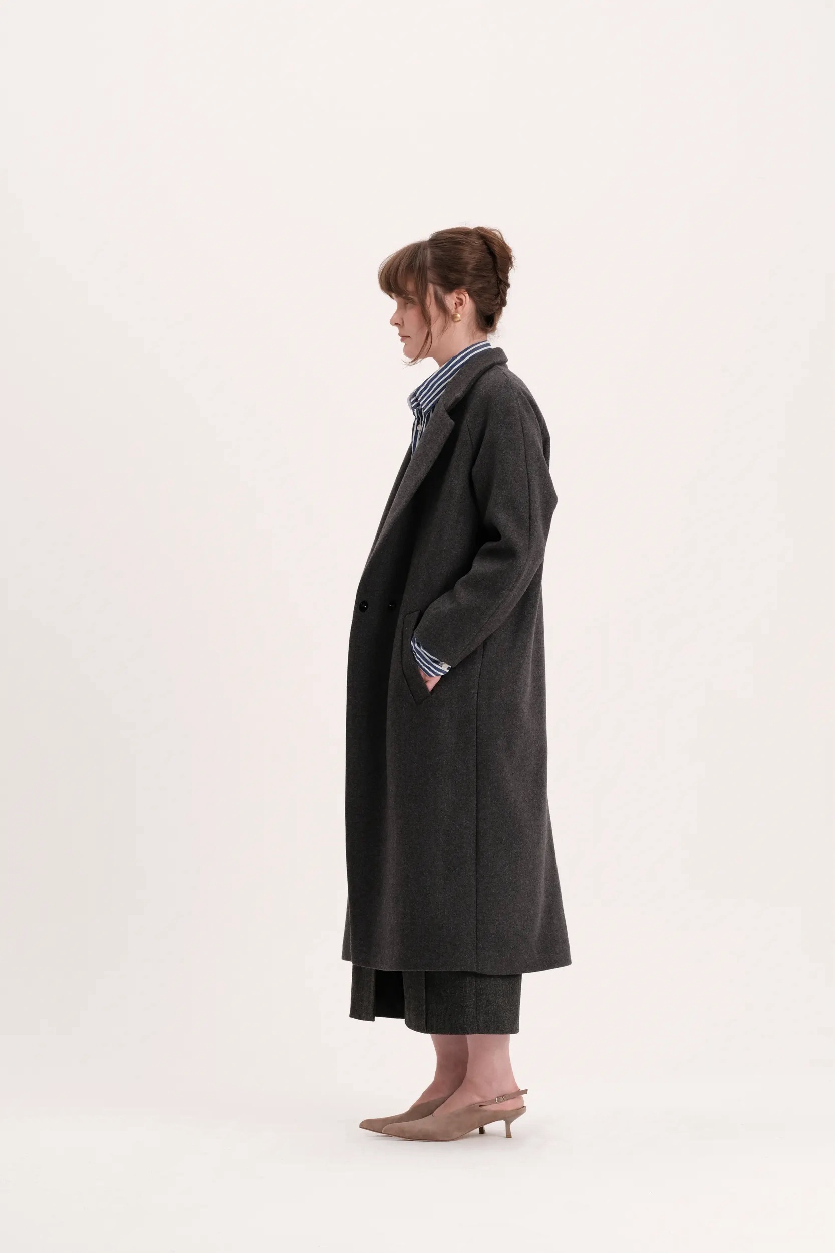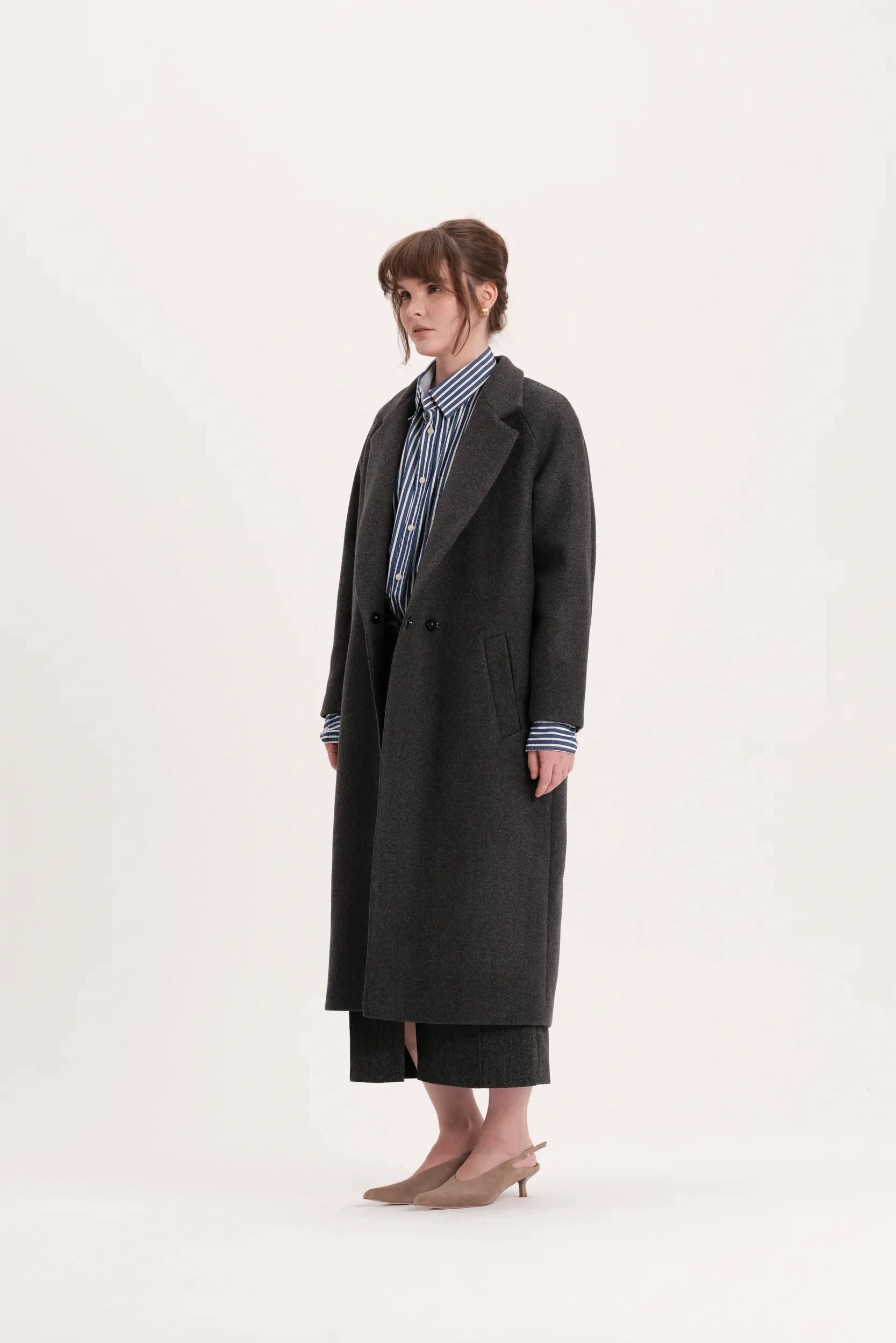Длинное двубортное пальто k é k é из 100% итальянского кашемира. Застегивается спереди на две кнопки. Два кармана спереди. Подкладка - 100% вискоза. Длина изделия - 119 см.