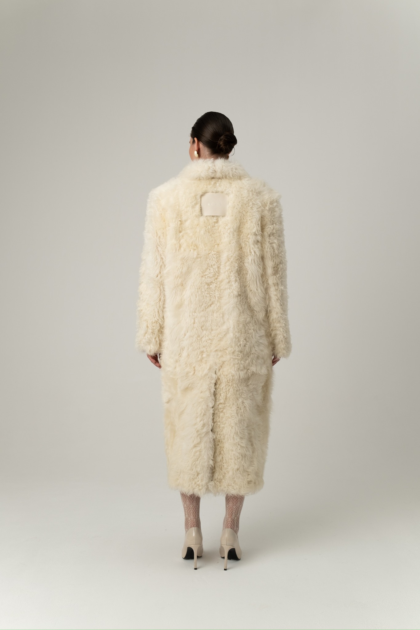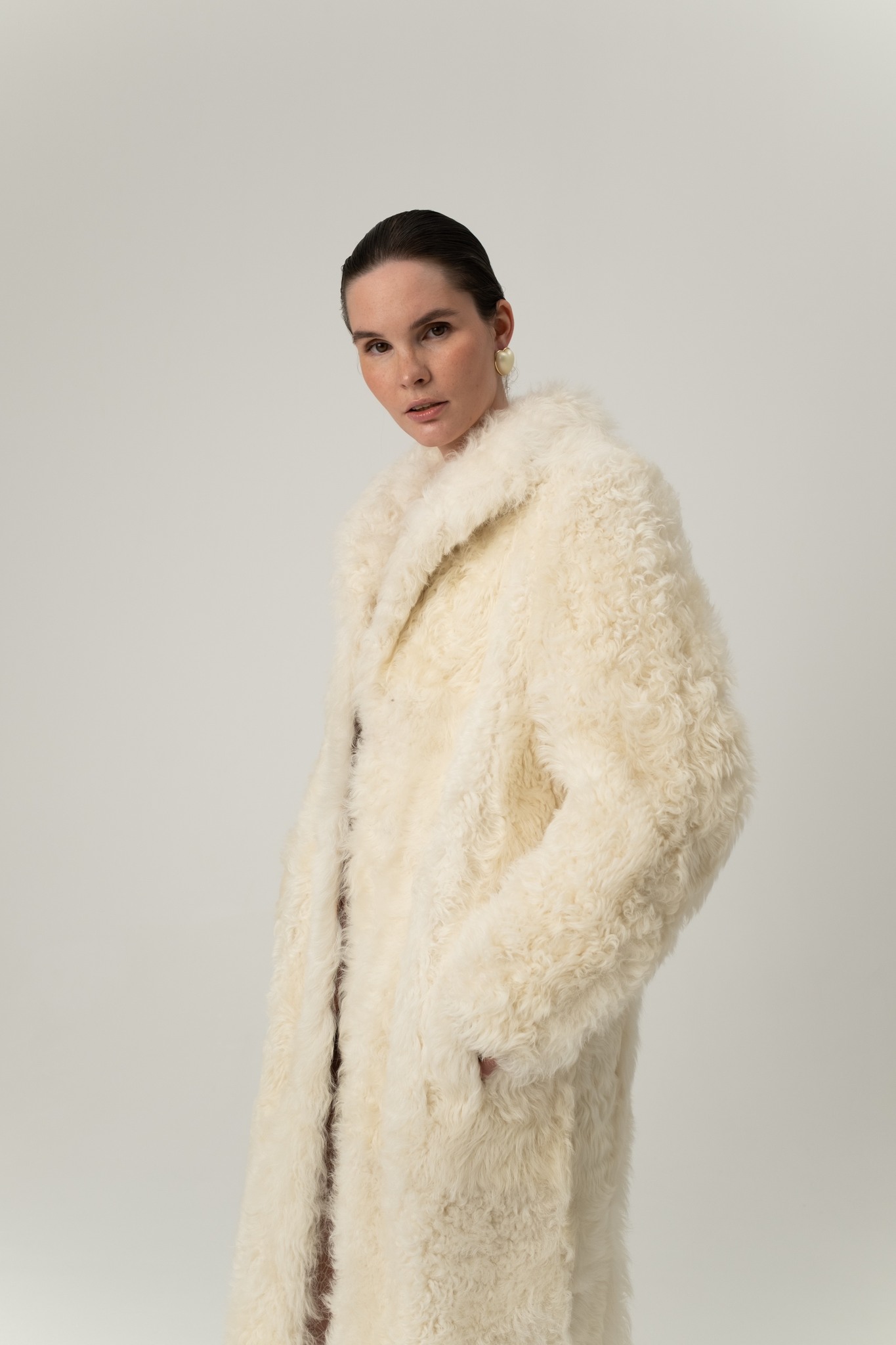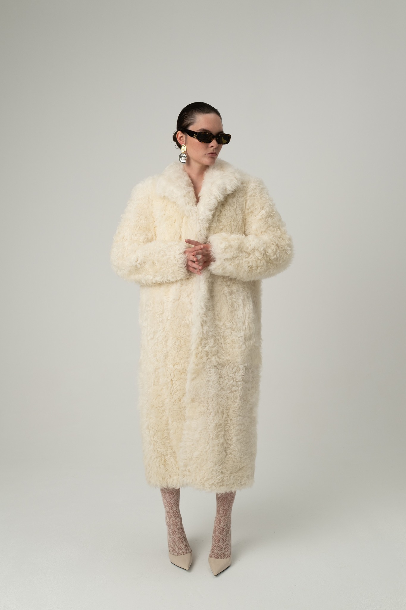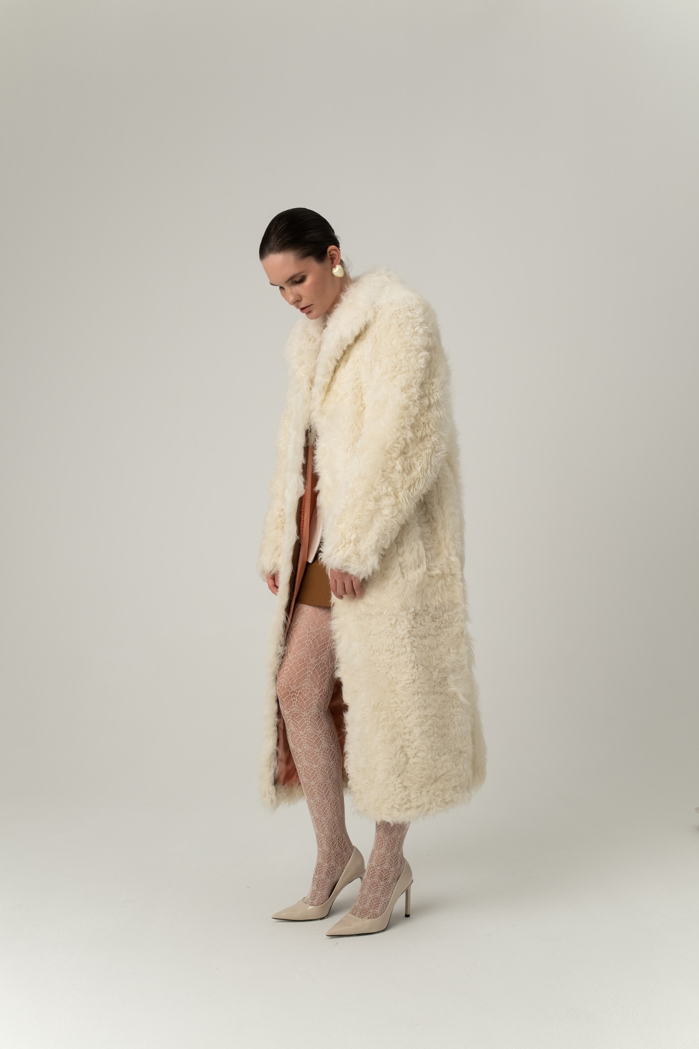 Длинная шуба из овчины тиградо. Cвободный прямой силуэт. Застёгивается на шубные крючки в один ряд. Два передних прорезных кармана и один потайной в подкладке. Шлица на спинке.