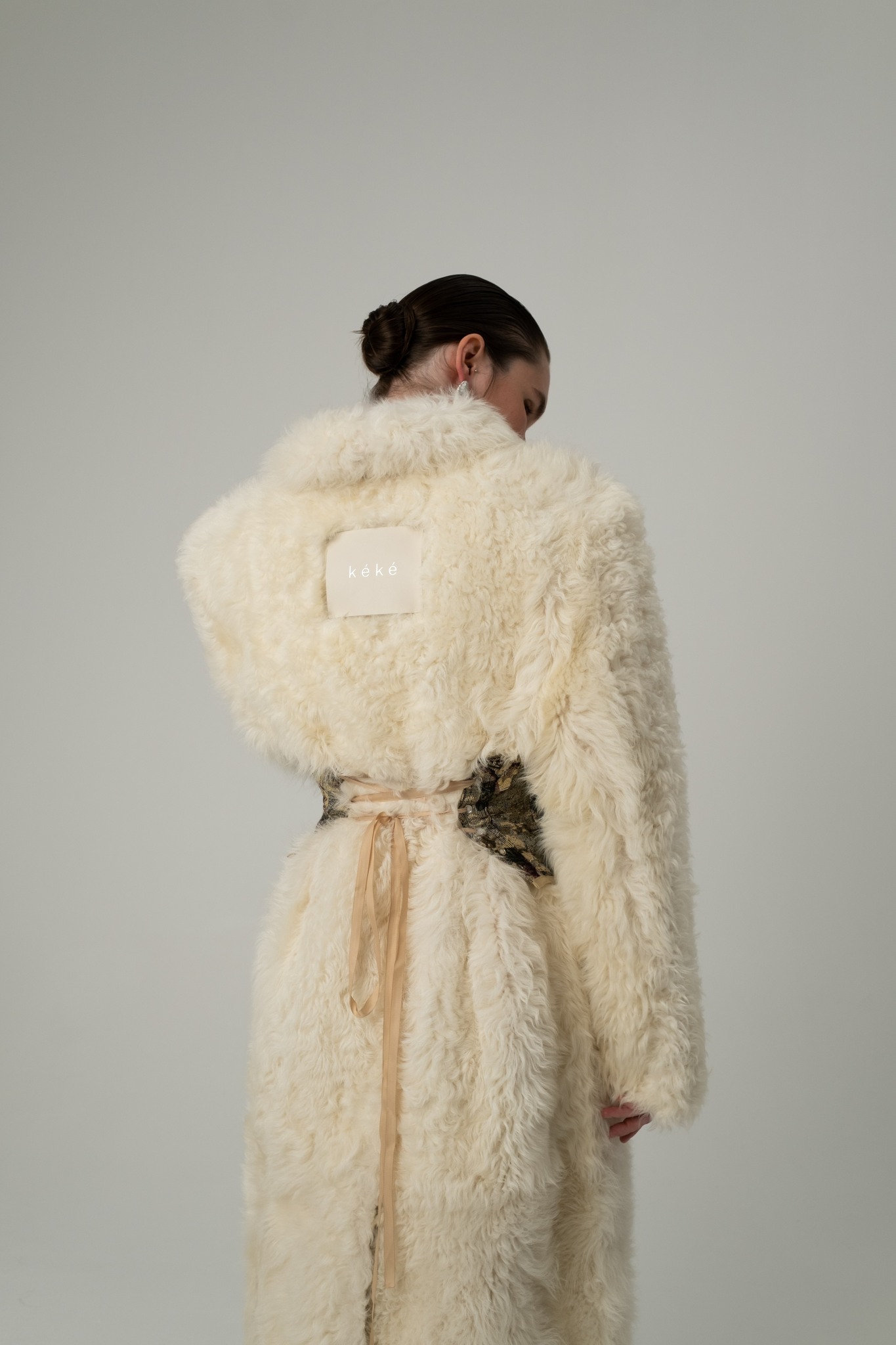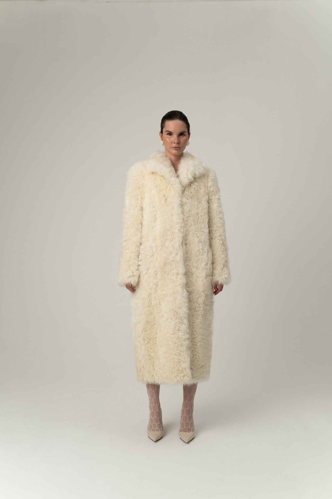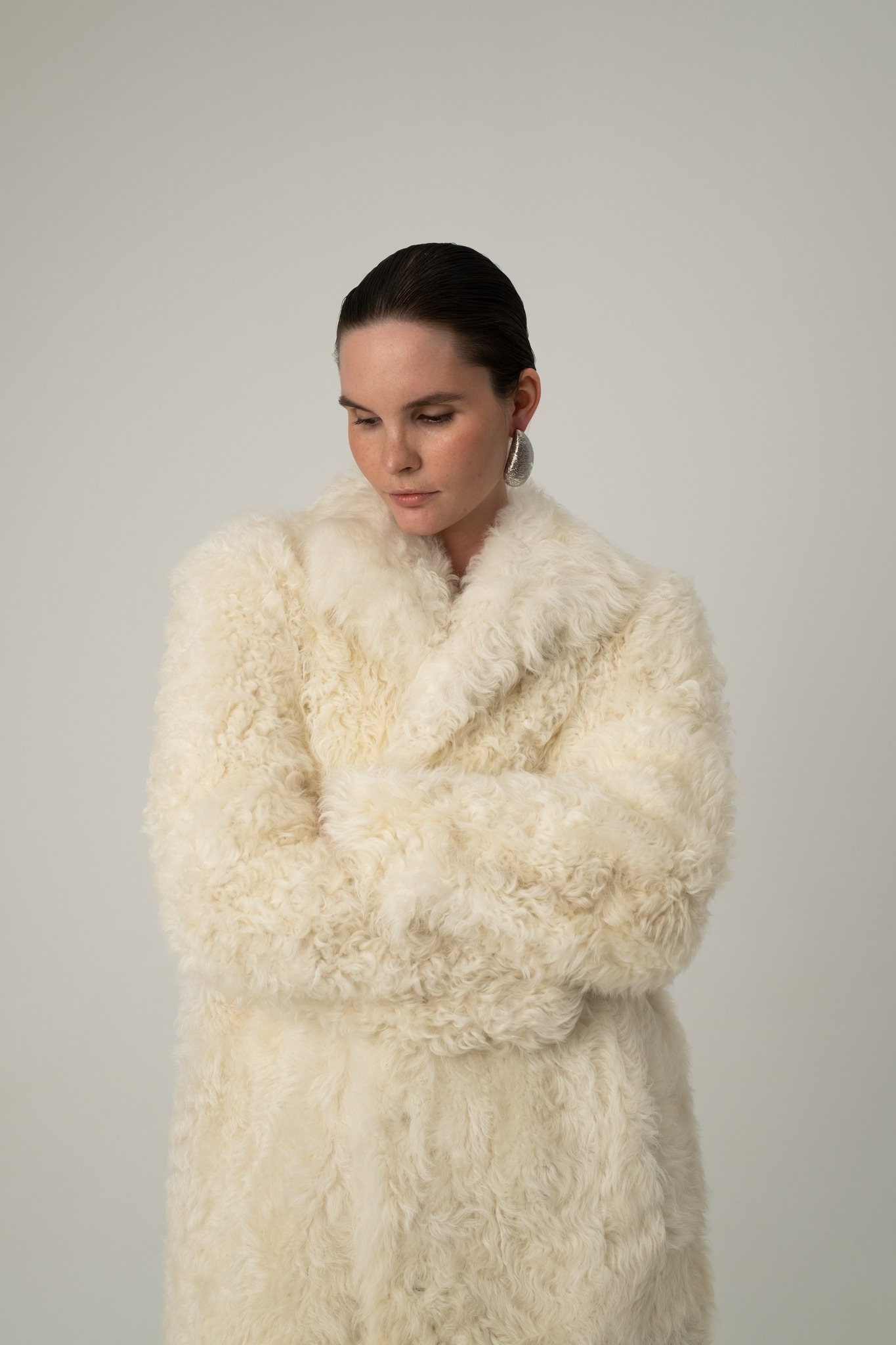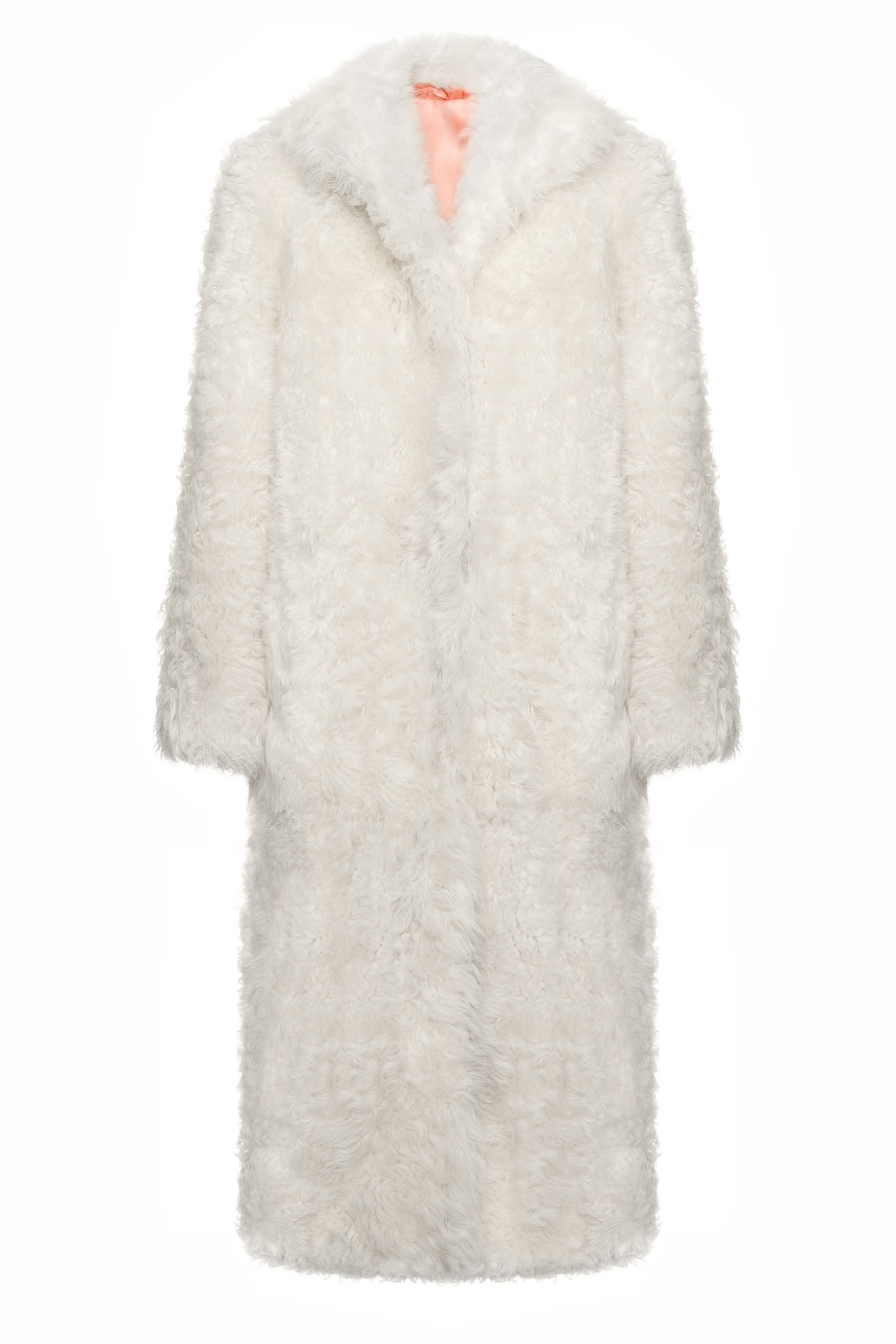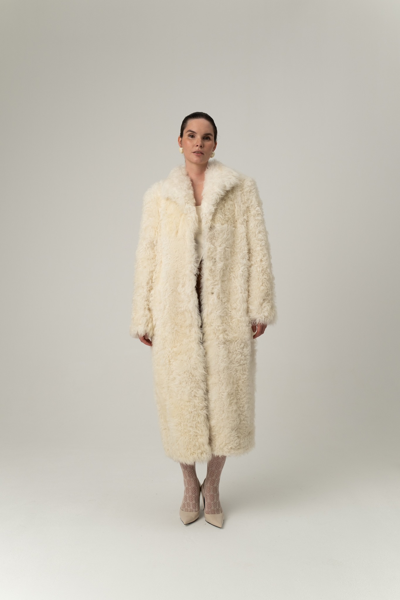 Длинная шуба из овчины тиградо. Cвободный прямой силуэт. Застёгивается на шубные крючки в один ряд. Два передних прорезных кармана и один потайной в подкладке. Шлица на спинке.
