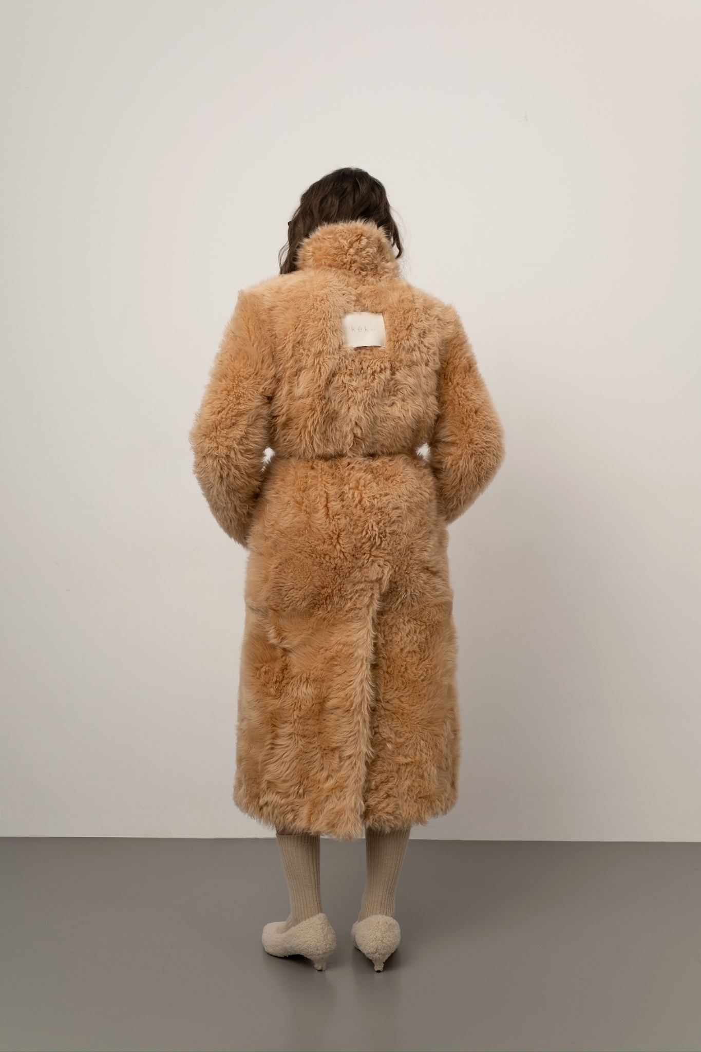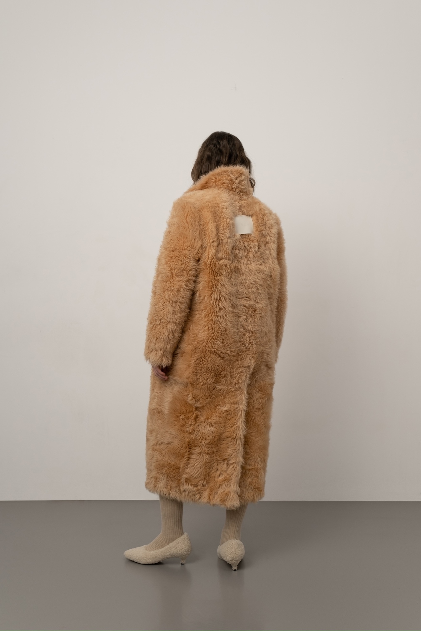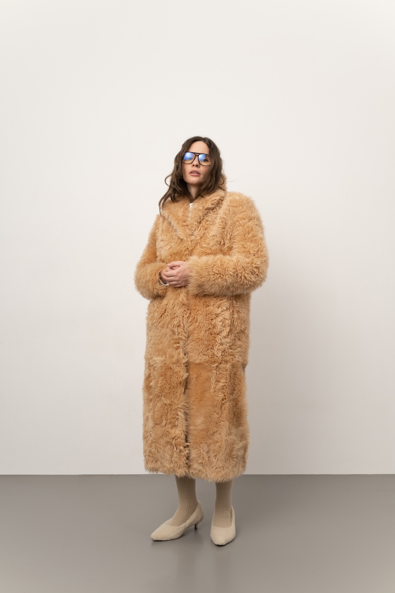 Длинная шуба из овчины тиградо. Cвободный прямой силуэт. Застёгивается на шубные крючки в один ряд. Два передних прорезных кармана и один потайной в подкладке. Шлица на спинке.