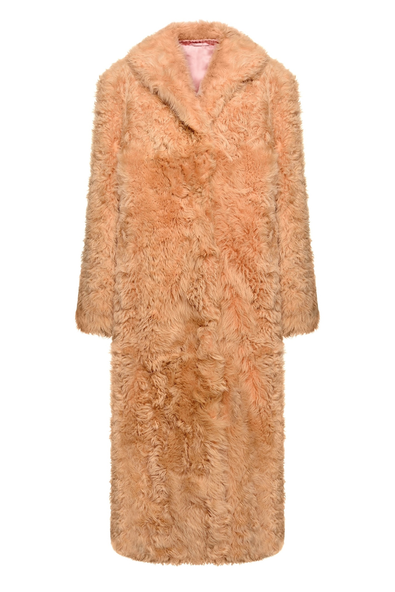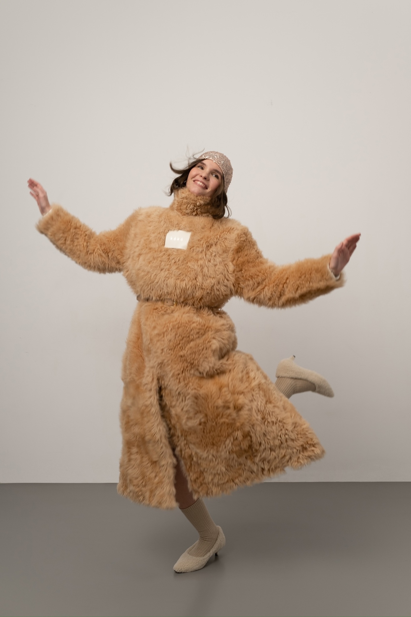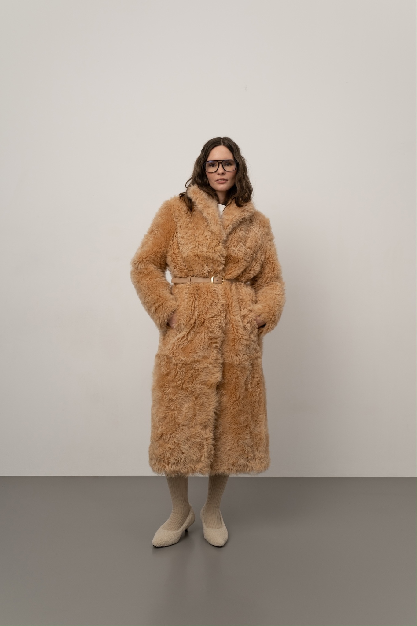 Длинная шуба из овчины тиградо. Cвободный прямой силуэт. Застёгивается на шубные крючки в один ряд. Два передних прорезных кармана и один потайной в подкладке. Шлица на спинке.