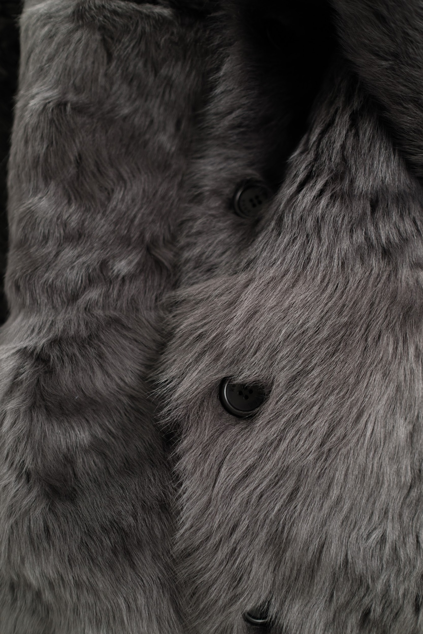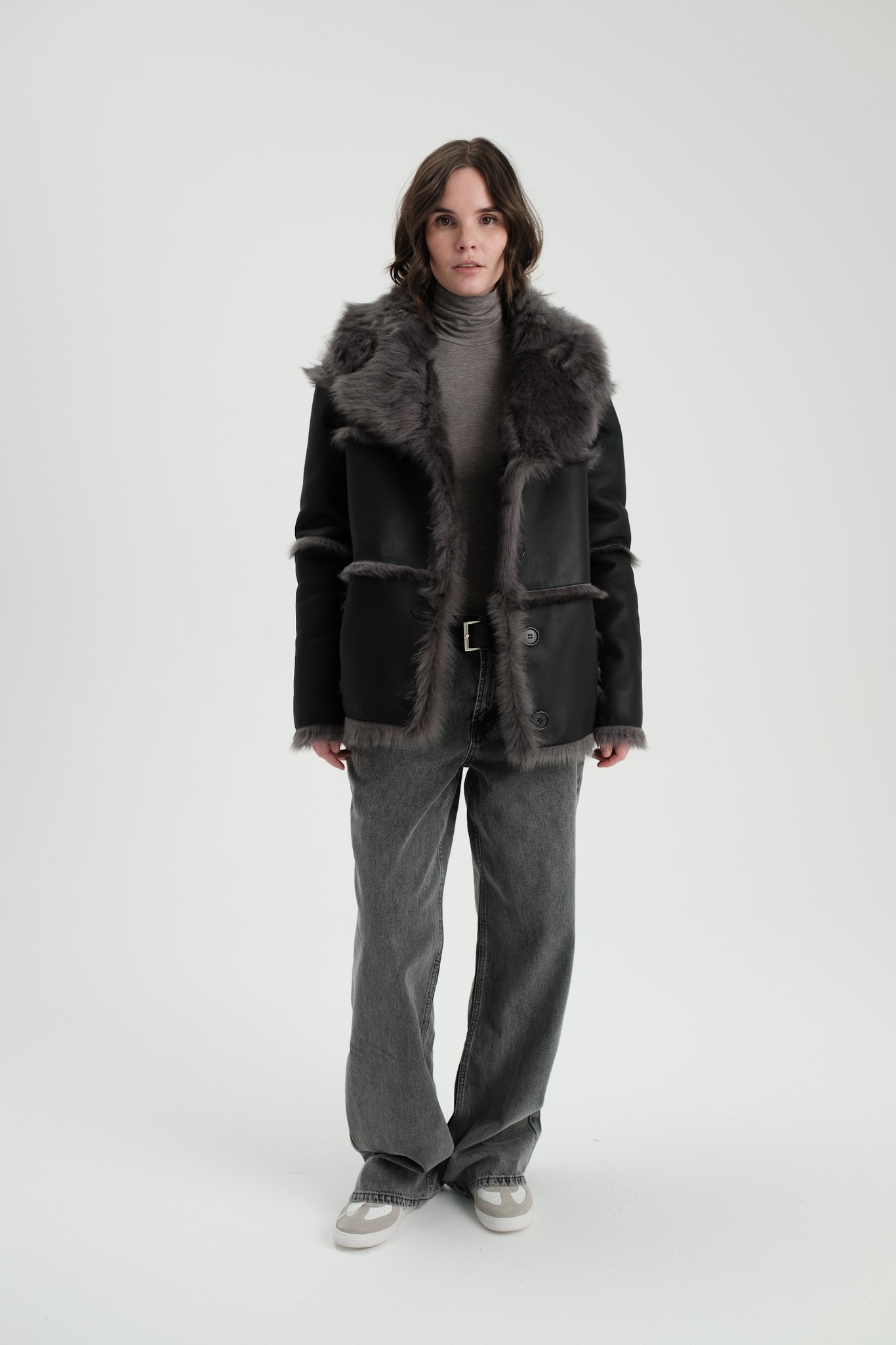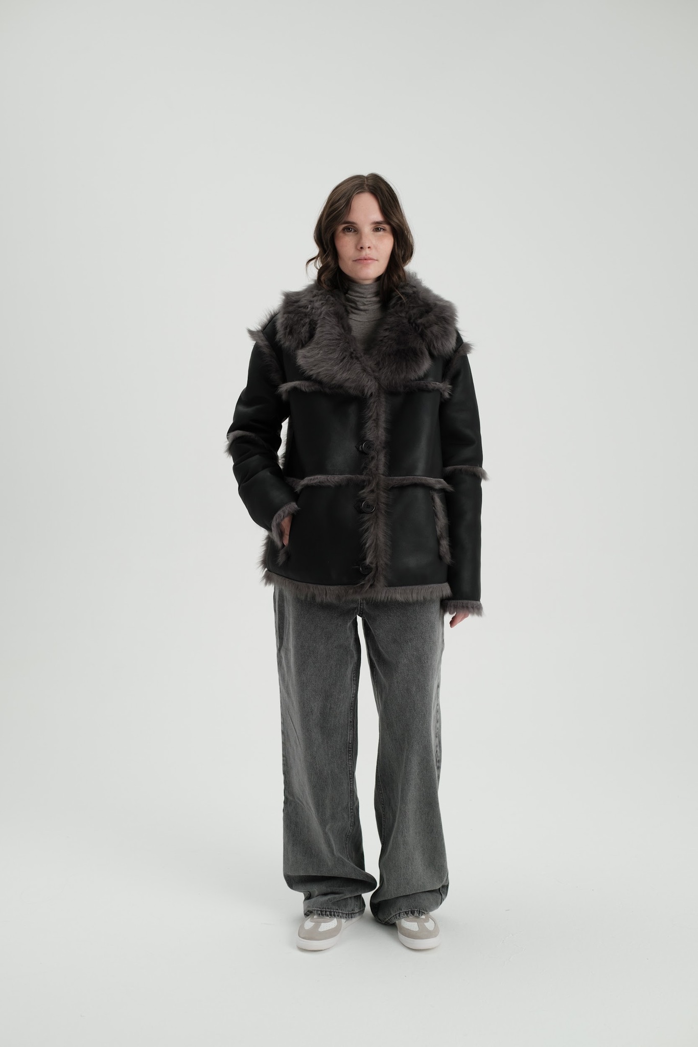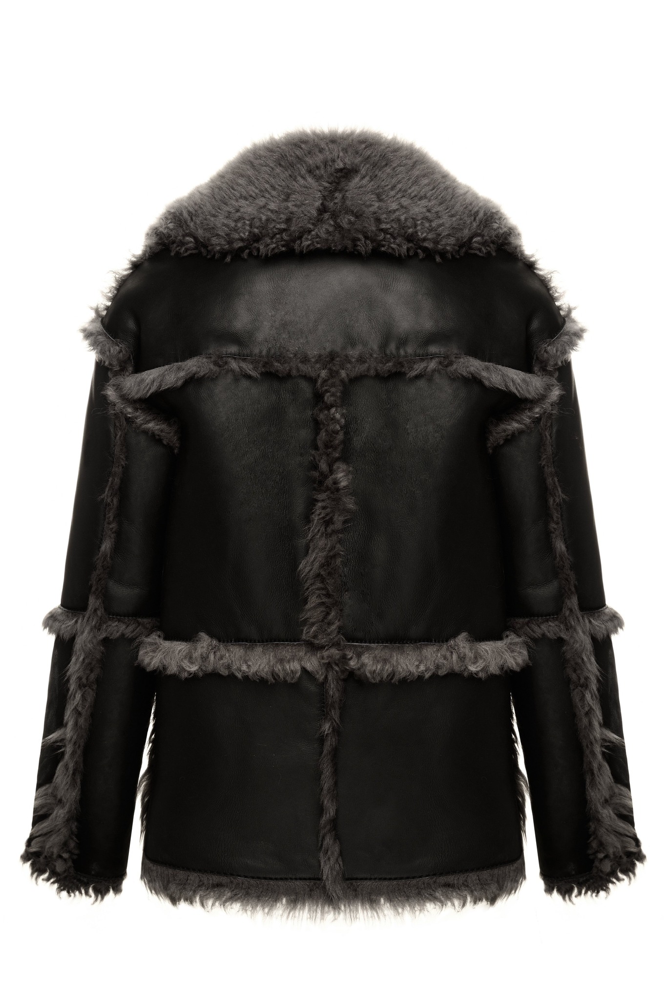 Двусторонняя шуба-дублёнка из овчины тиградо. Английский воротник. Застёгивается на пуговицы. Длину рукавов можно регулировать, подгибая их. Два прорезных кармана. Легкая и очень тёплая.