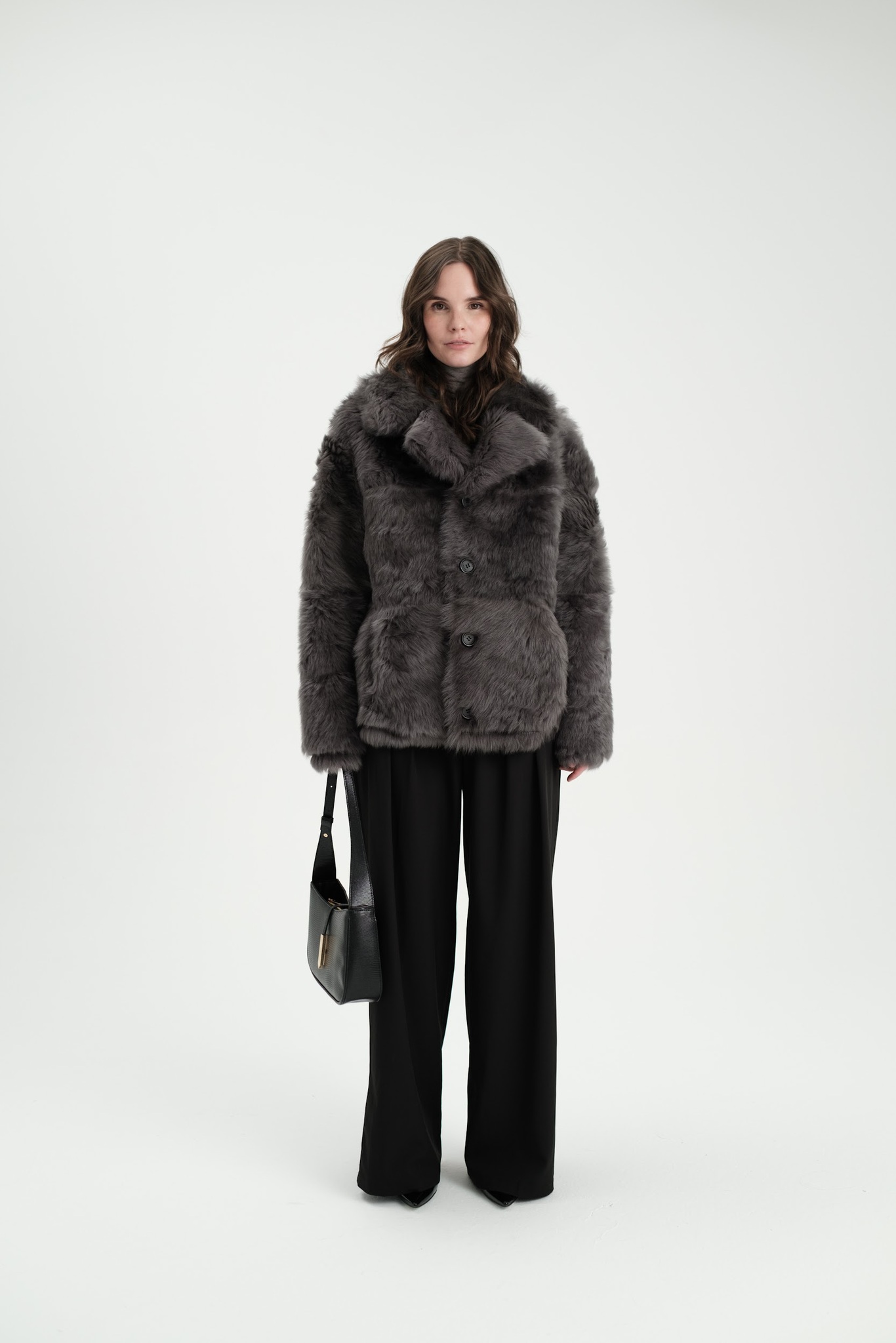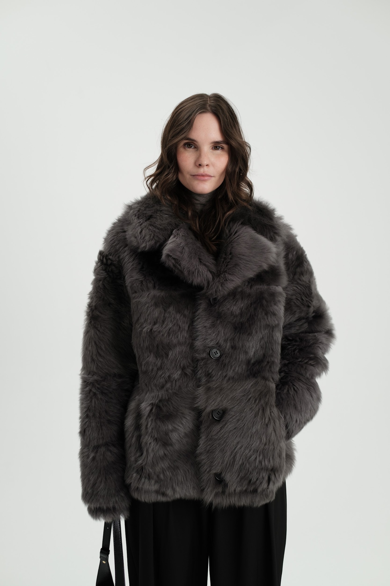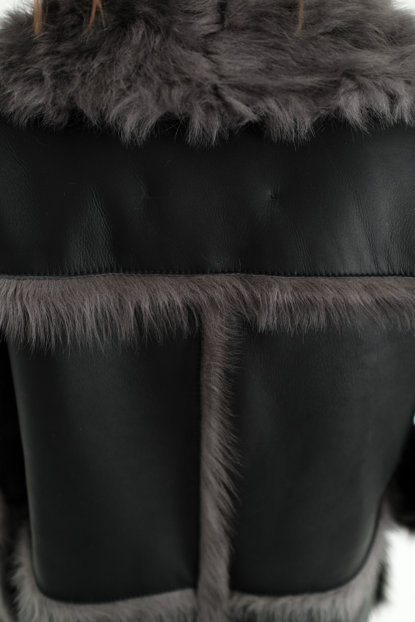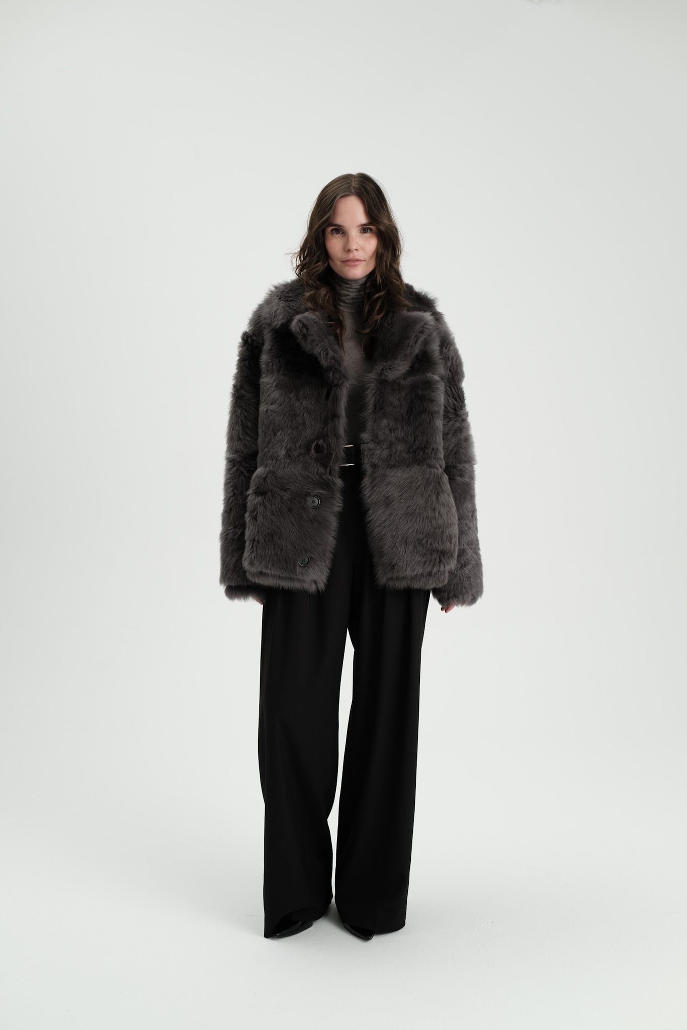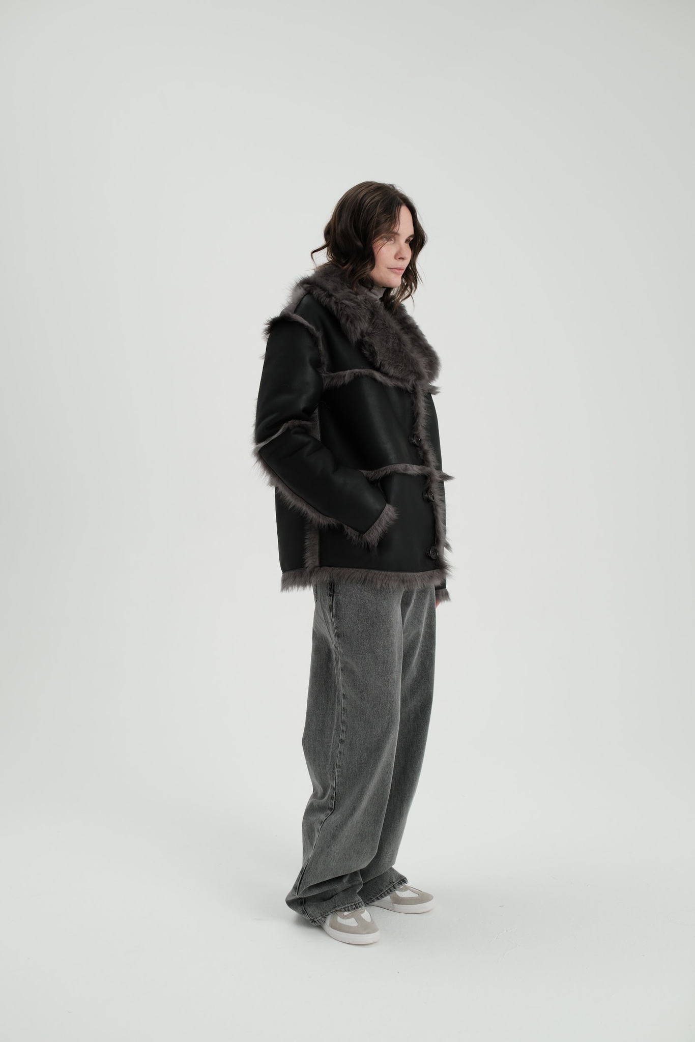 Двусторонняя шуба-дублёнка из овчины тиградо. Английский воротник. Застёгивается на пуговицы. Длину рукавов можно регулировать, подгибая их. Два прорезных кармана. Легкая и очень тёплая.