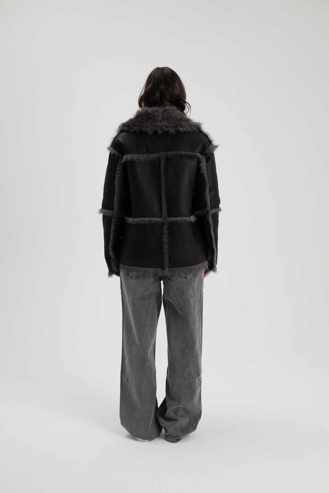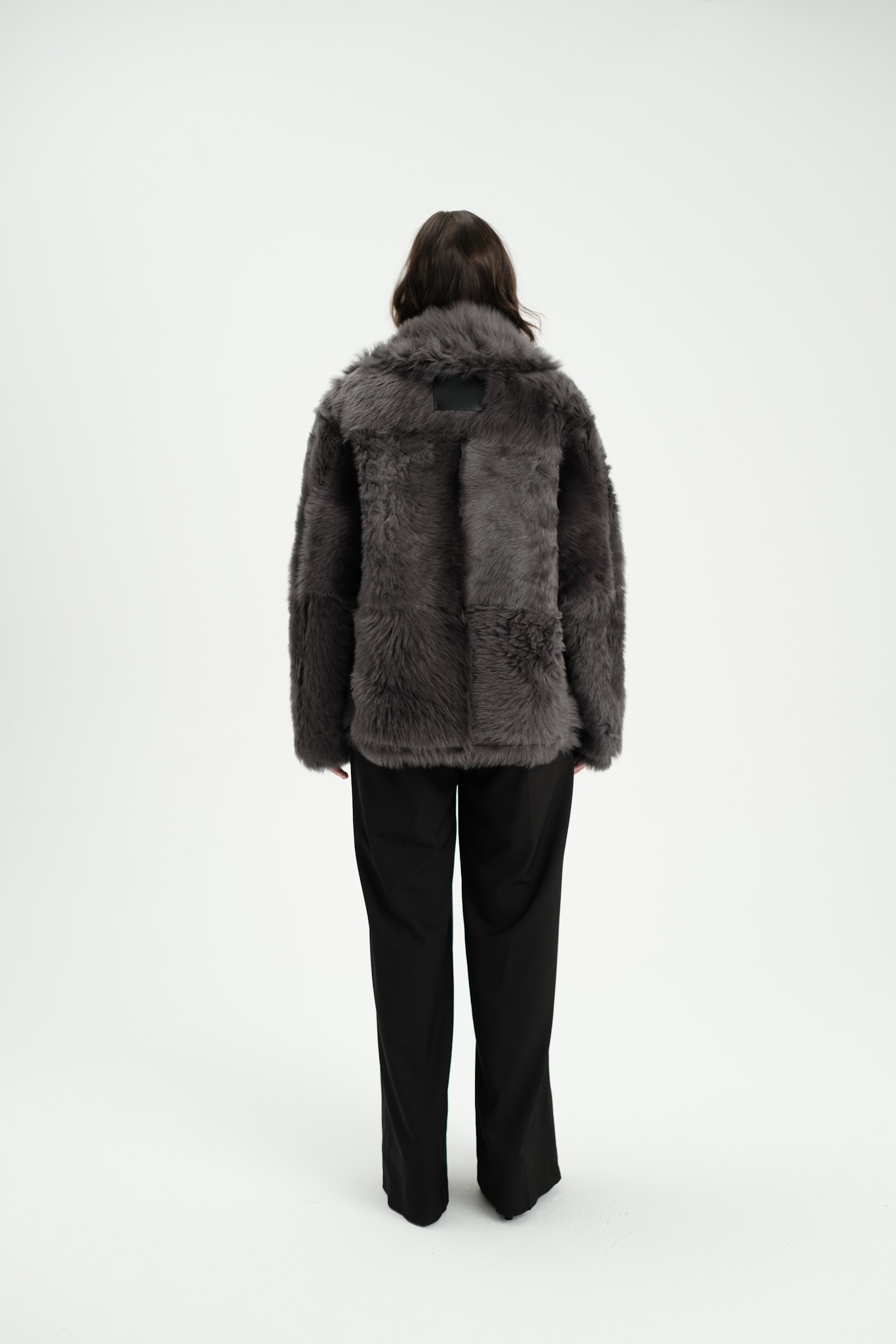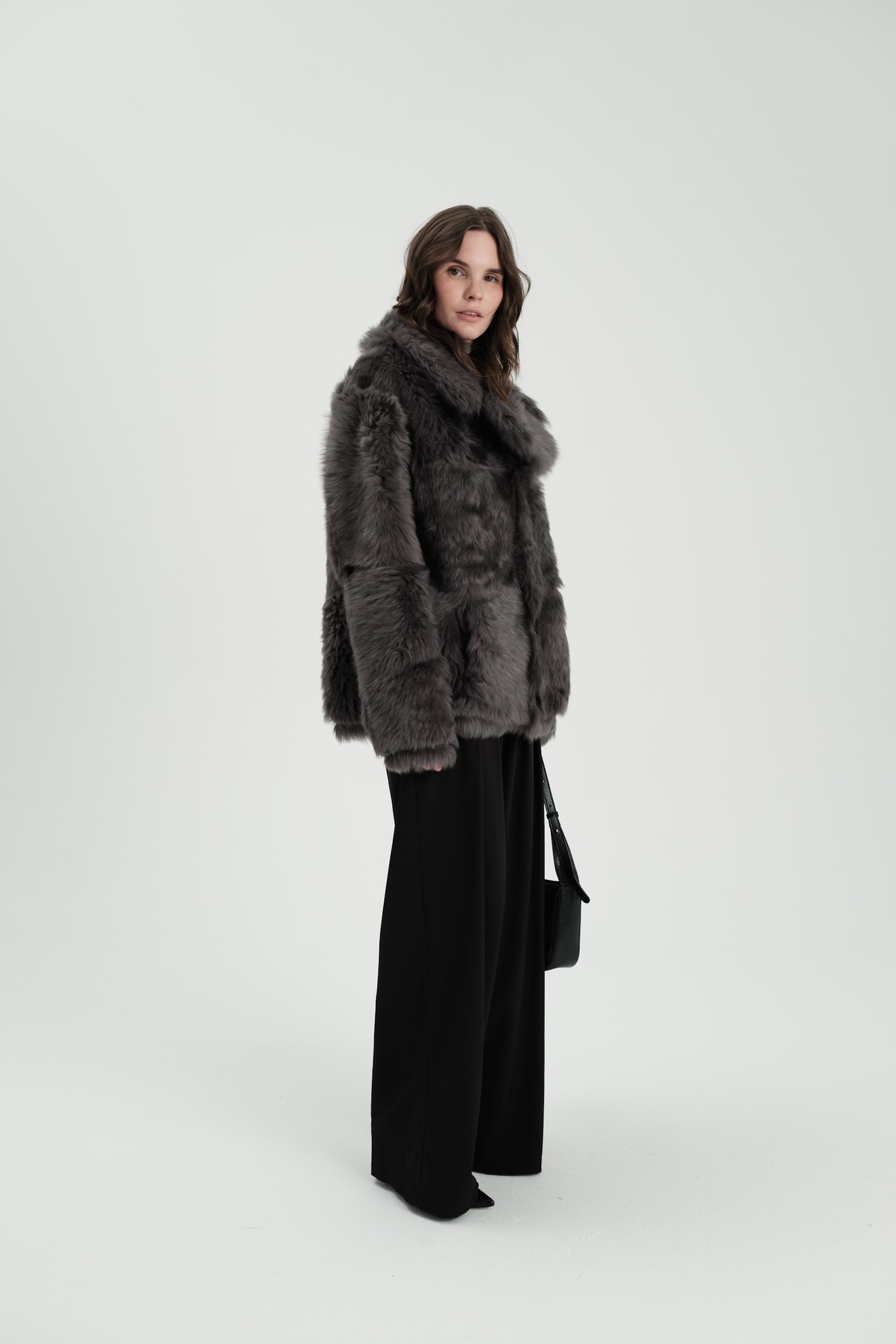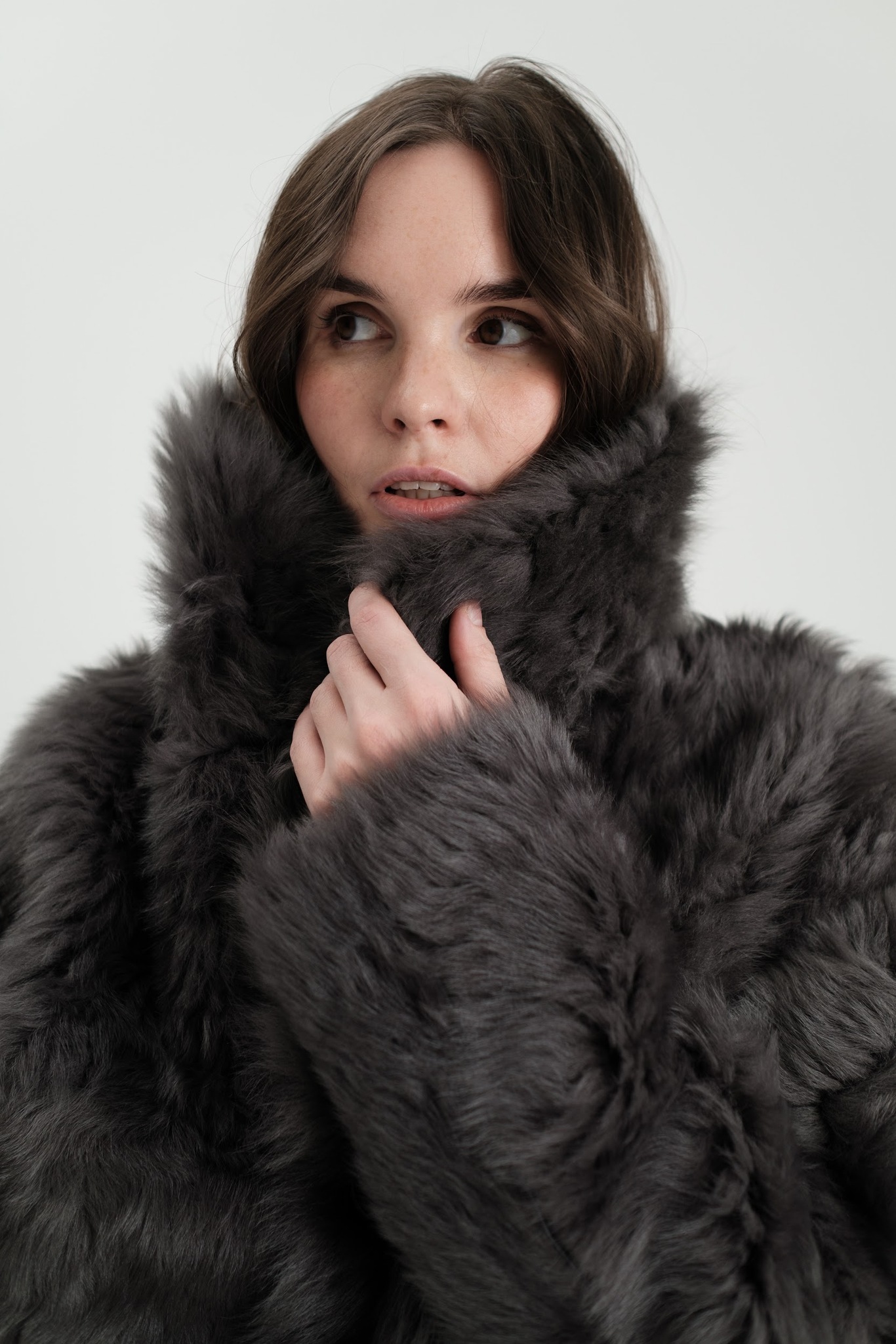 Двусторонняя шуба-дублёнка из овчины тиградо. Английский воротник. Застёгивается на пуговицы. Длину рукавов можно регулировать, подгибая их. Два прорезных кармана. Легкая и очень тёплая.