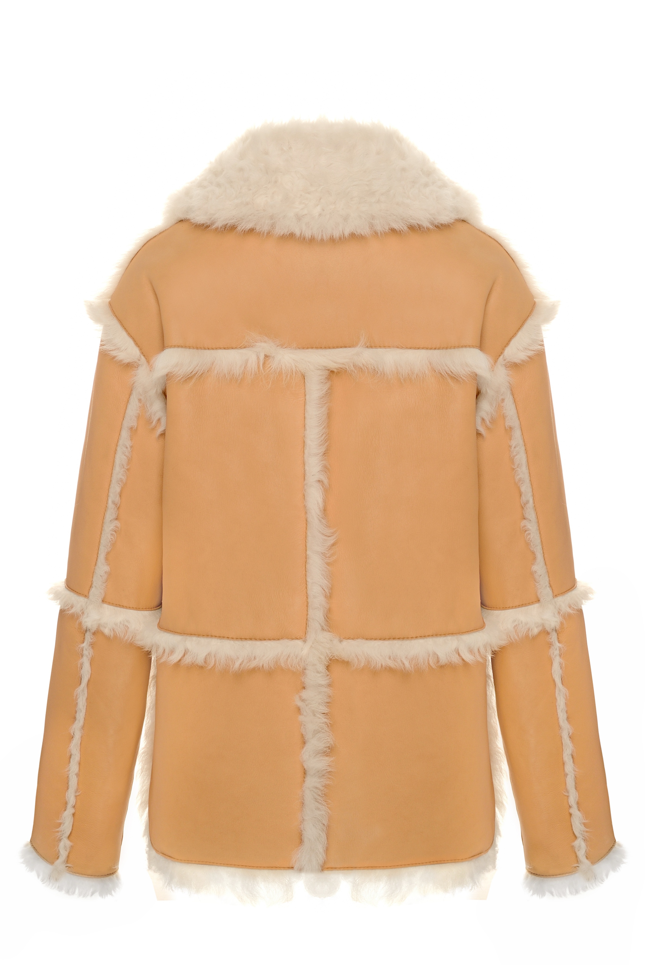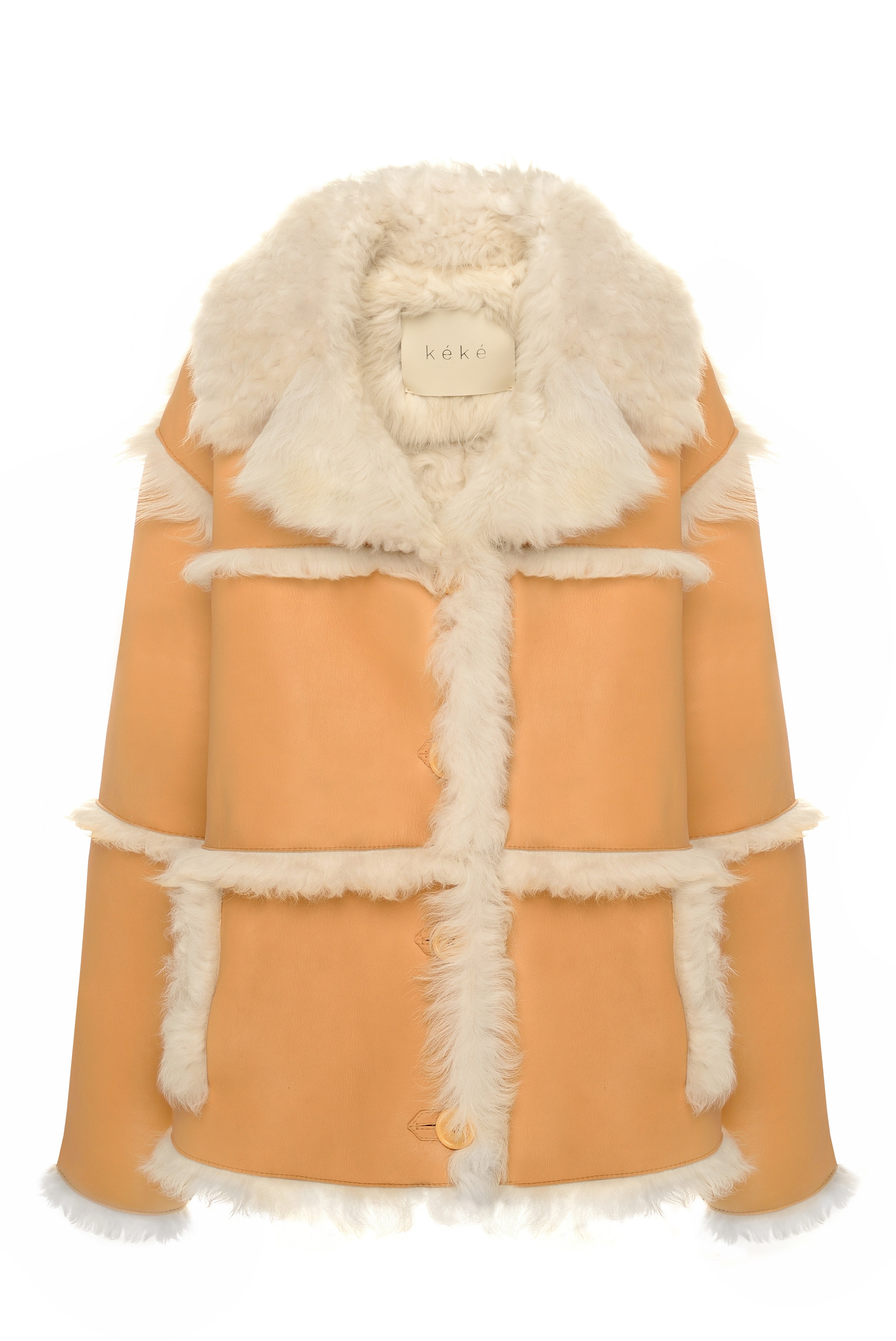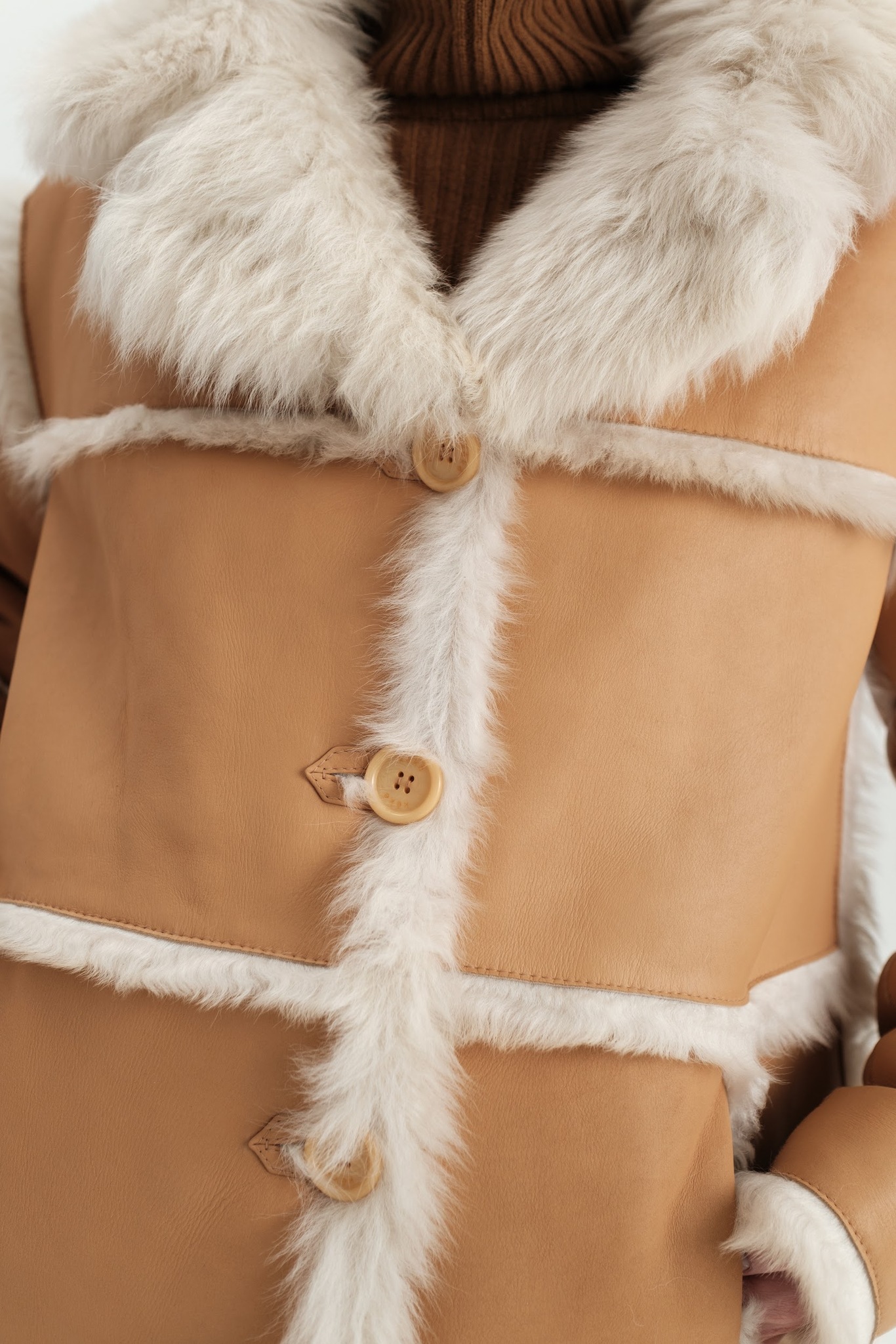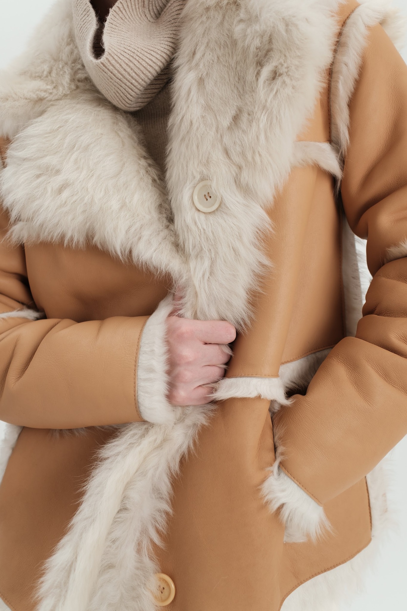 Двусторонняя шуба-дублёнка из овчины тиградо. Английский воротник. Застёгивается на пуговицы. Длину рукавов можно регулировать, подгибая их. Два прорезных кармана. Легкая и очень тёплая.