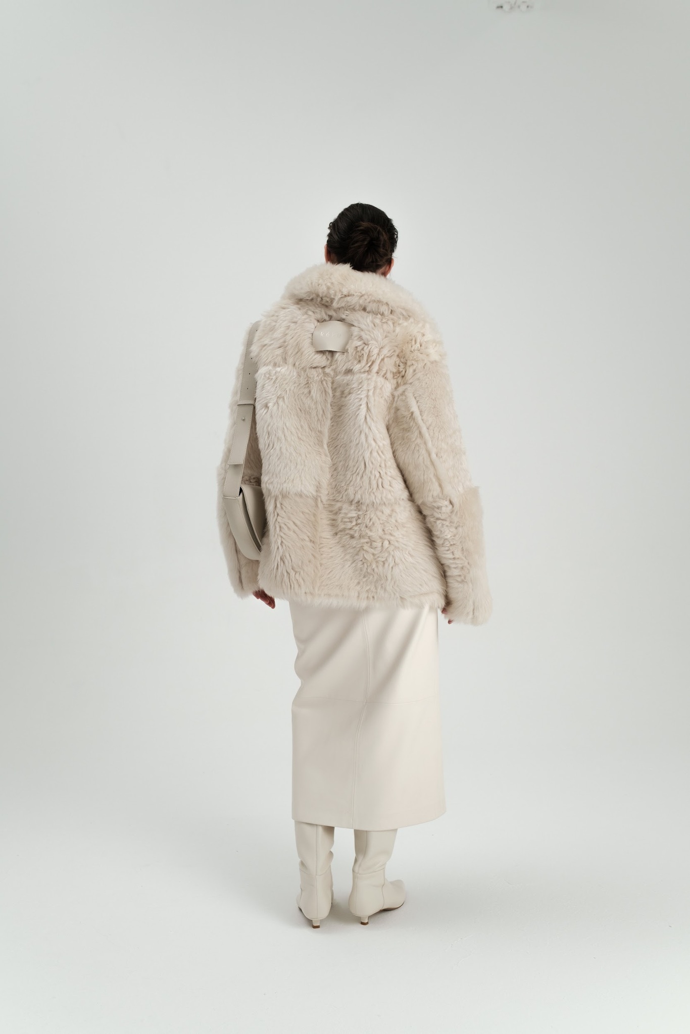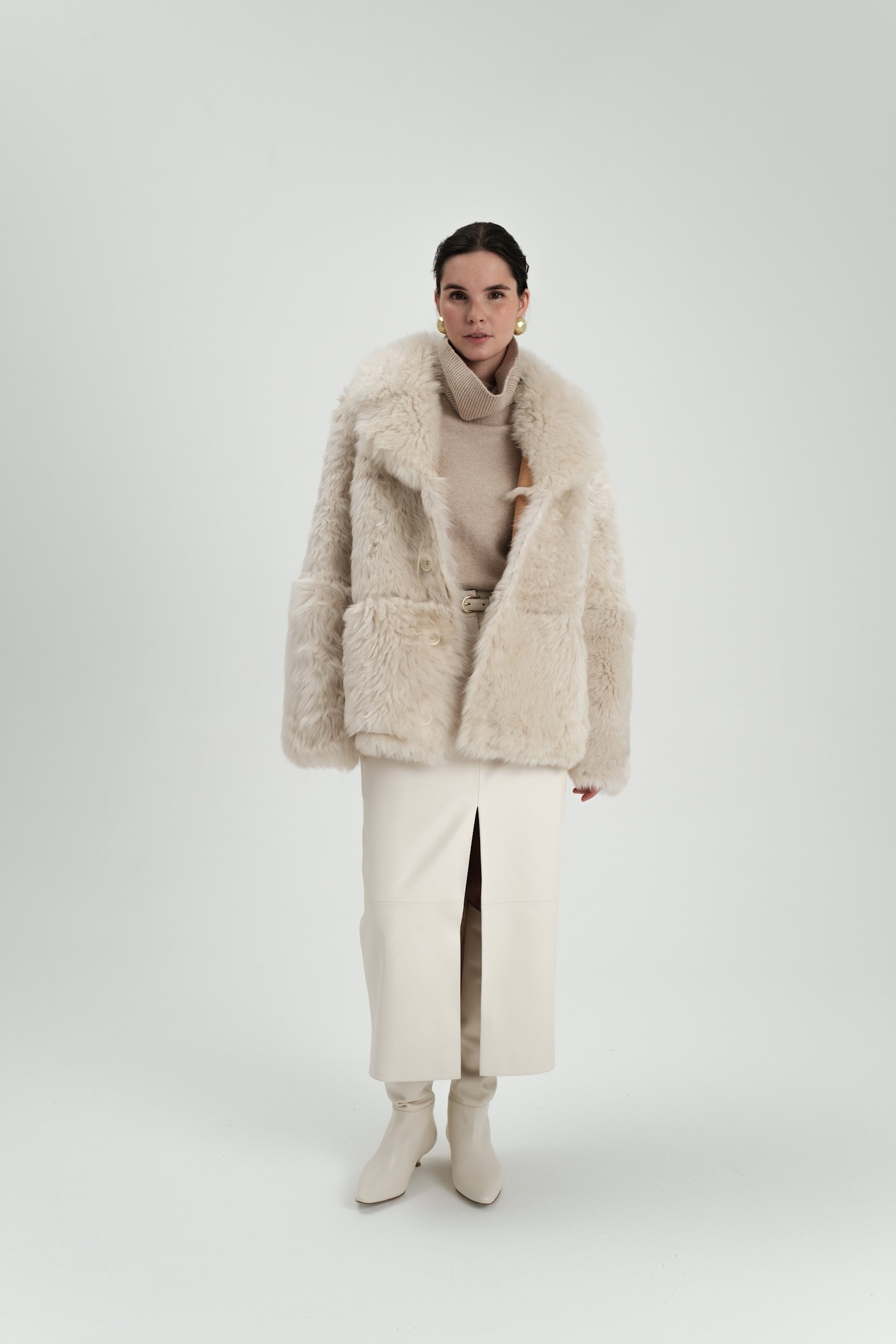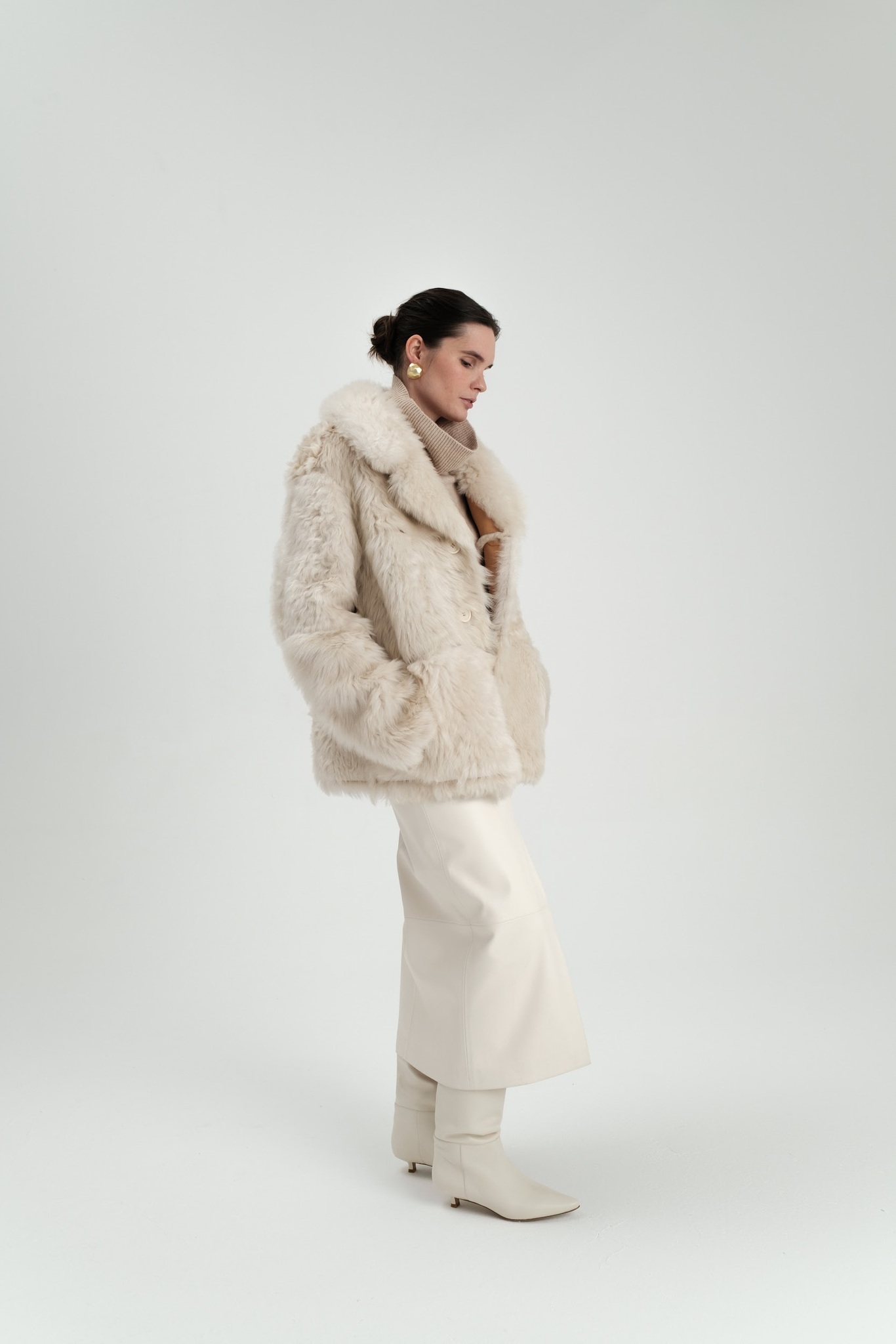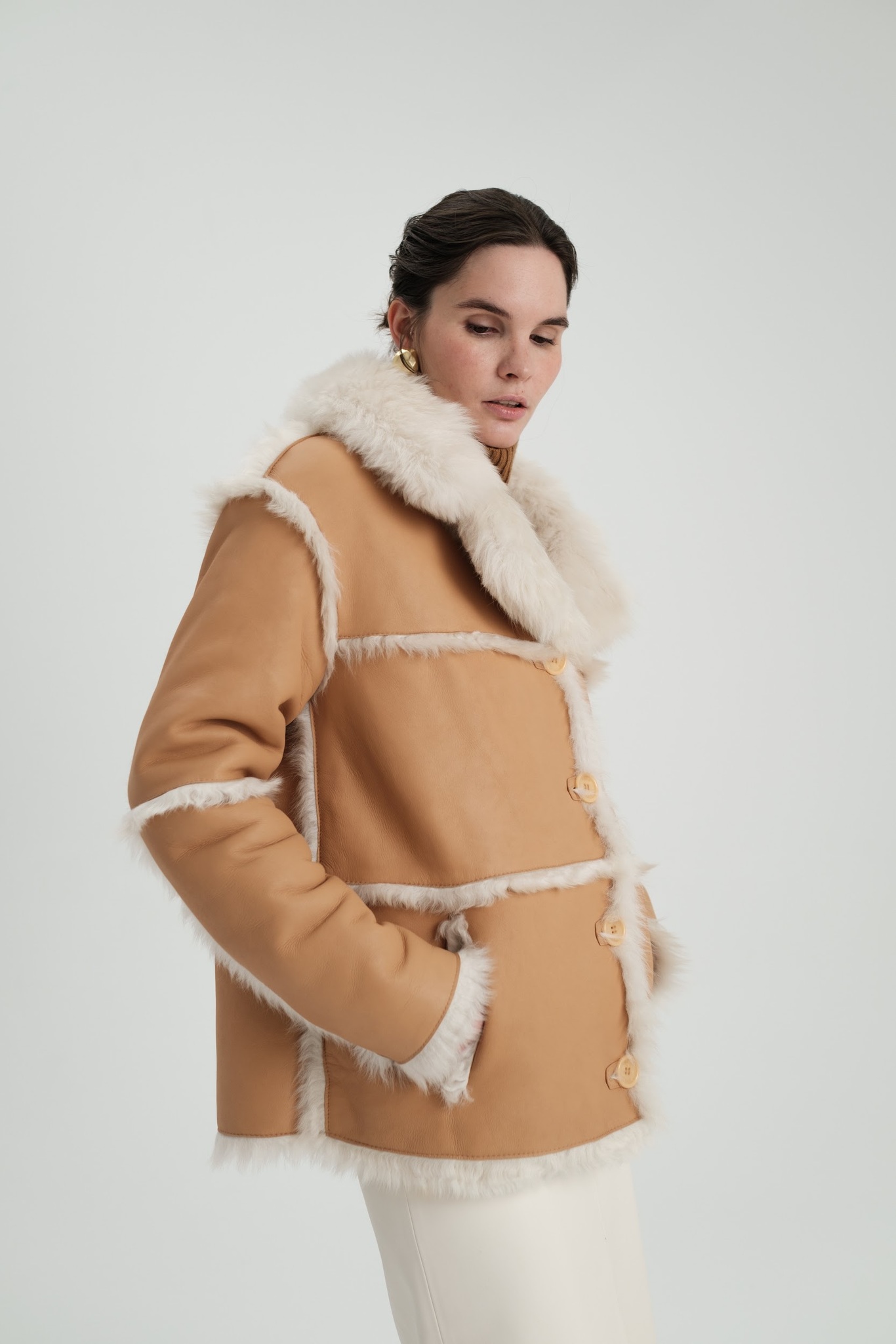 Двусторонняя шуба-дублёнка из овчины тиградо. Английский воротник. Застёгивается на пуговицы. Длину рукавов можно регулировать, подгибая их. Два прорезных кармана. Легкая и очень тёплая.