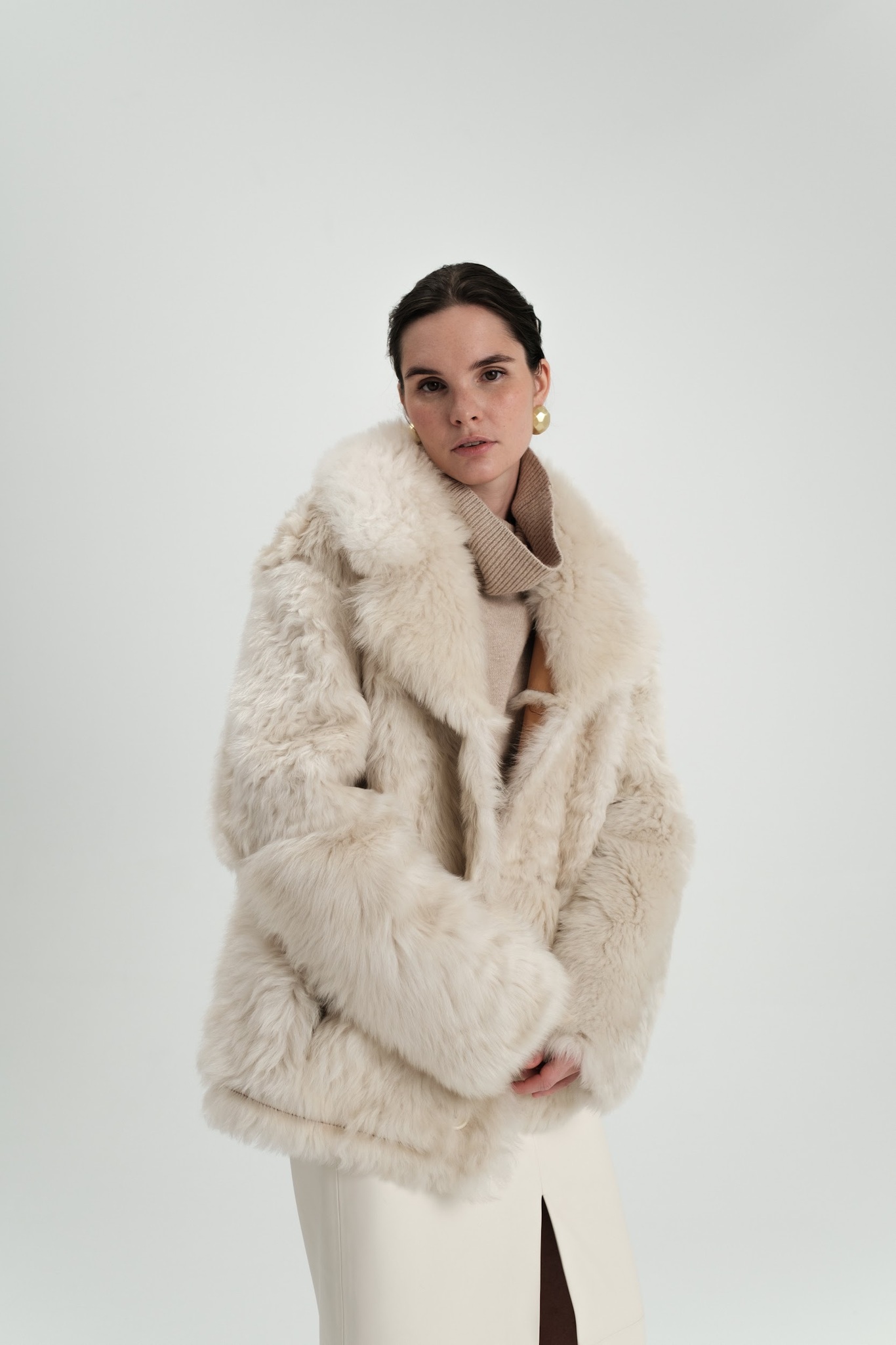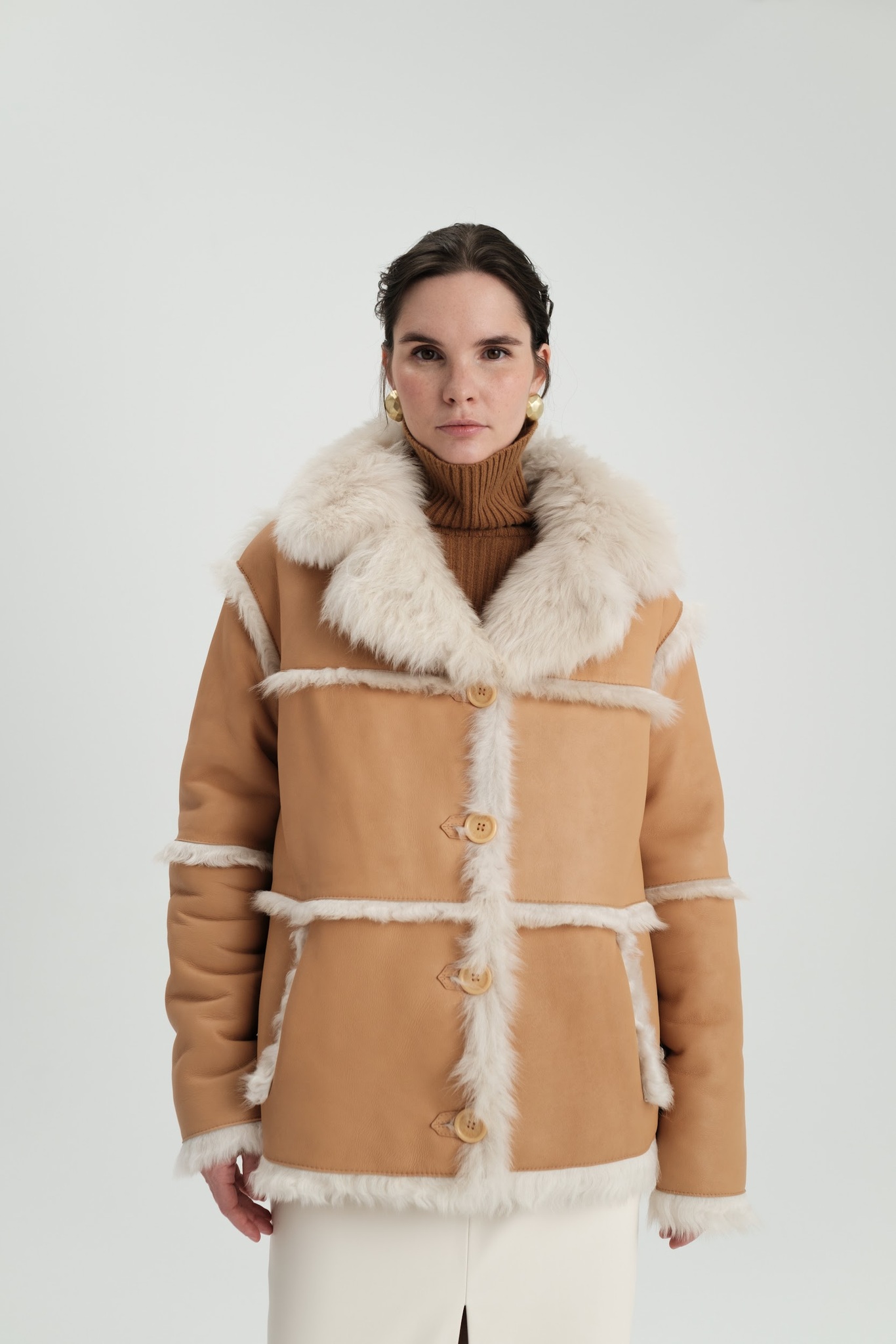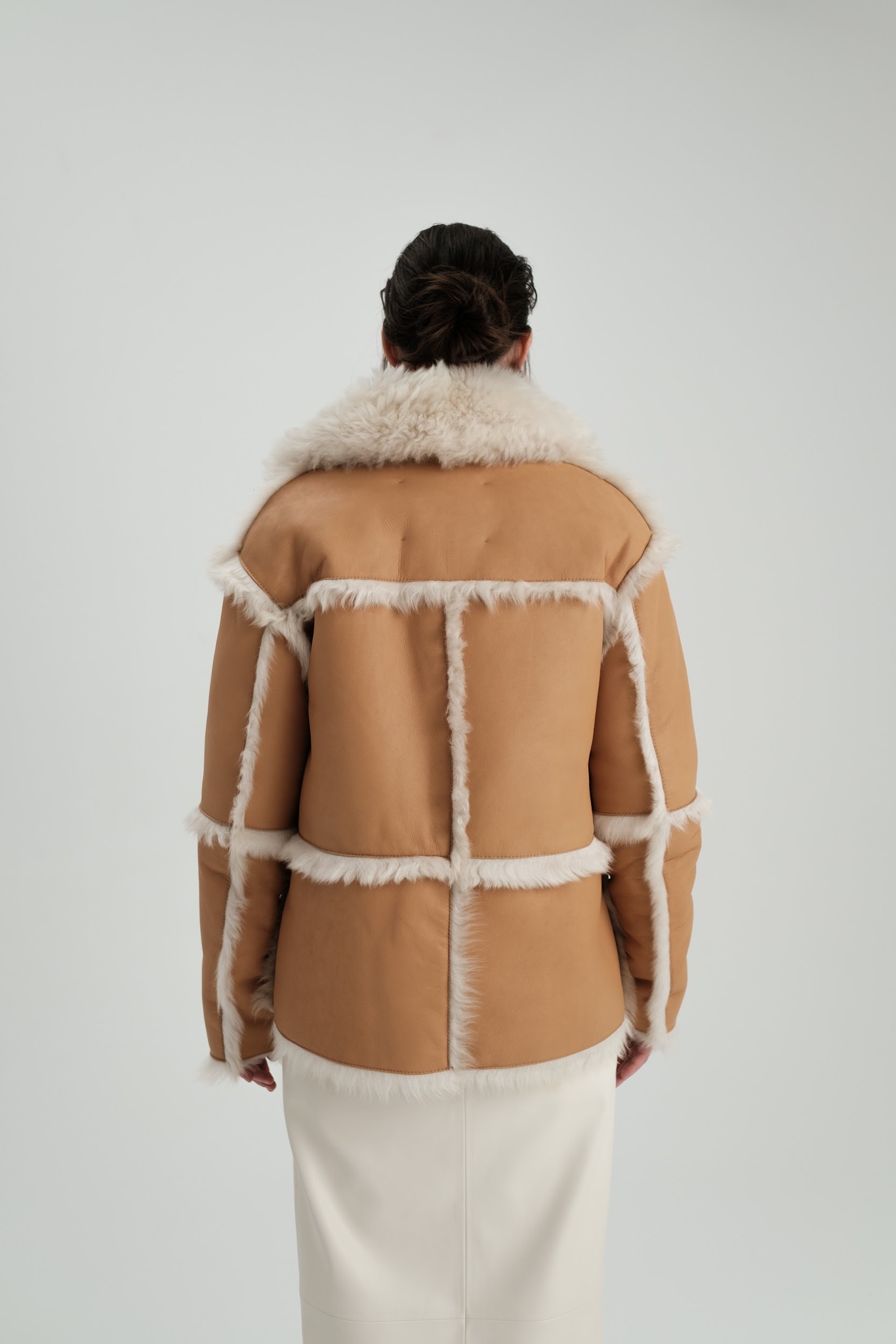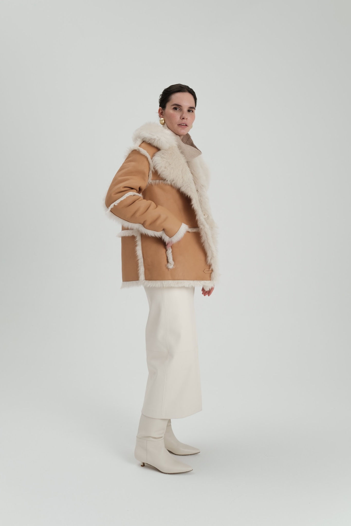 Двусторонняя шуба-дублёнка из овчины тиградо. Английский воротник. Застёгивается на пуговицы. Длину рукавов можно регулировать, подгибая их. Два прорезных кармана. Легкая и очень тёплая.