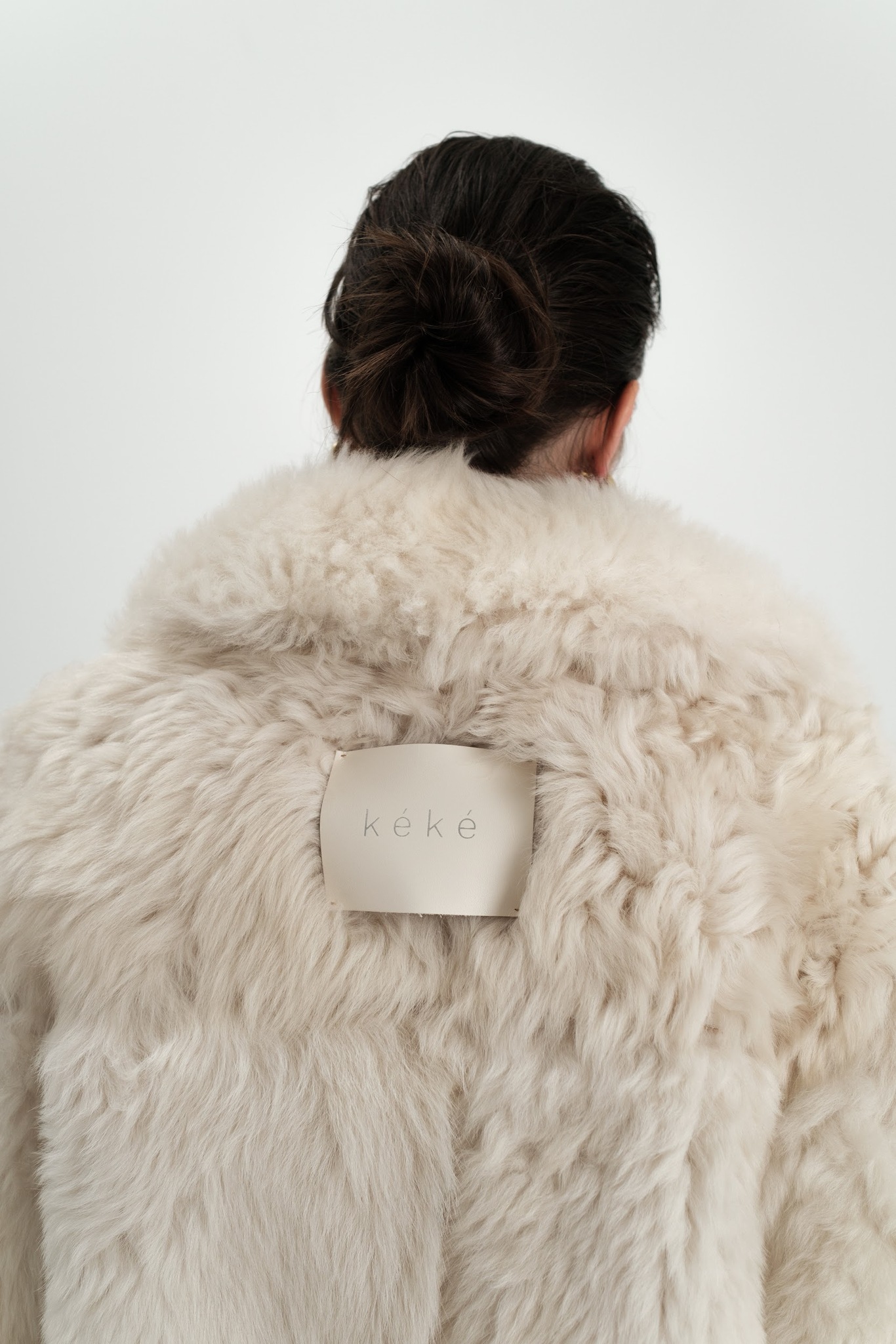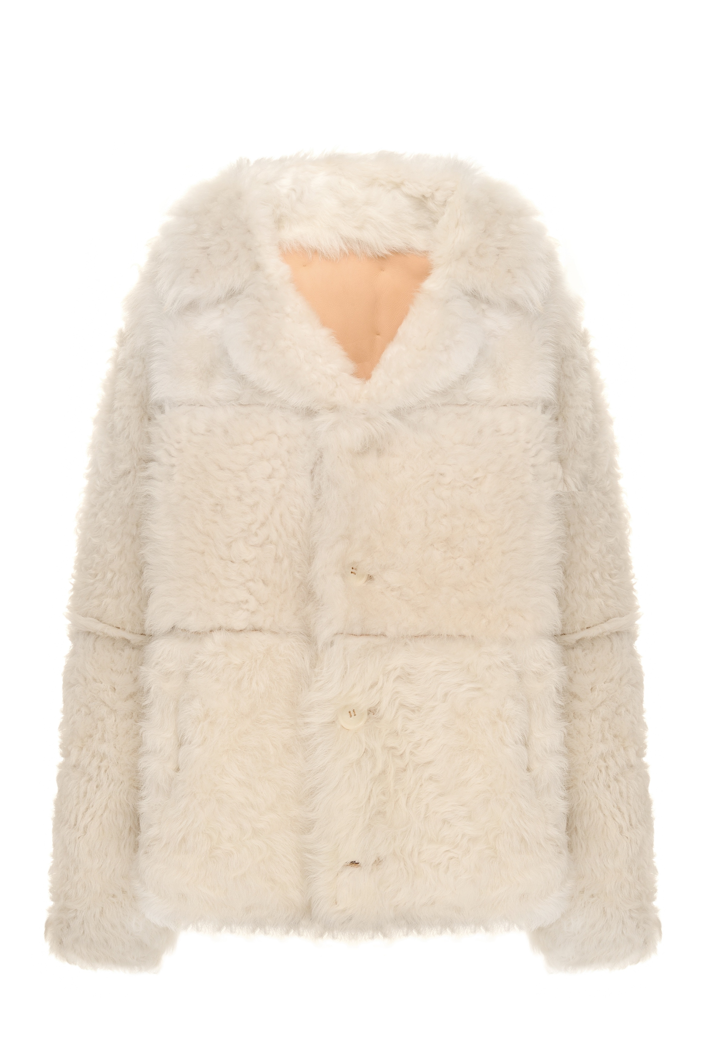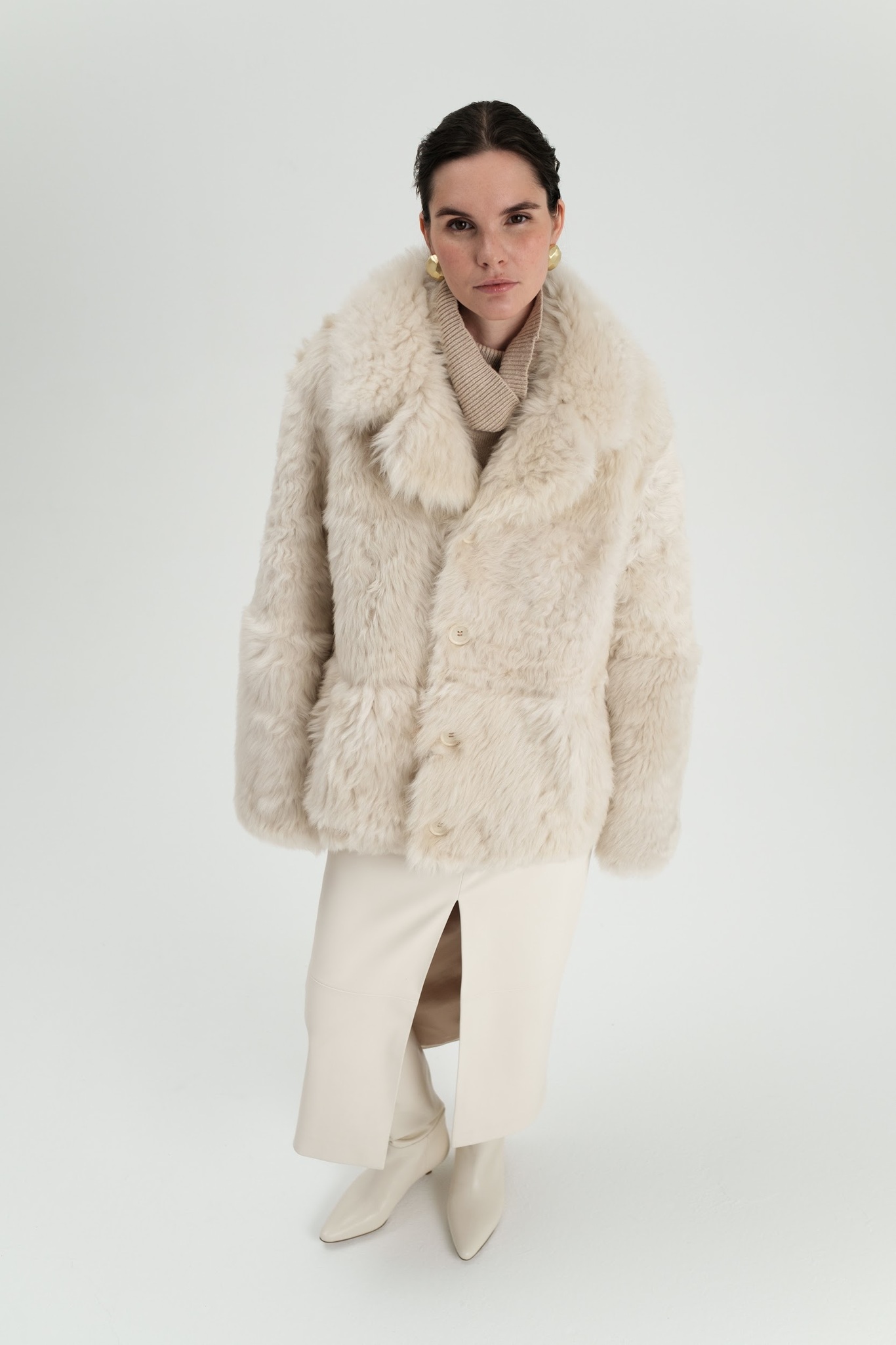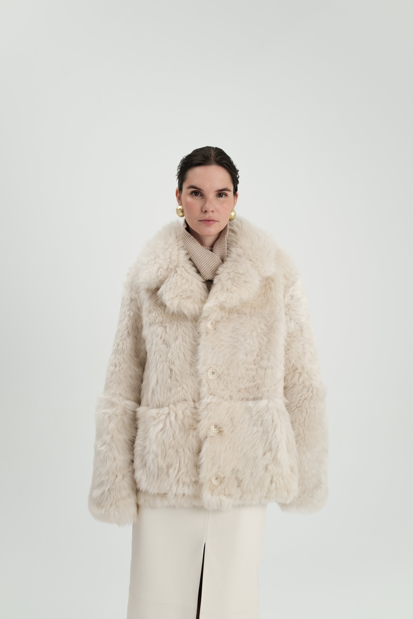Двусторонняя шуба-дублёнка из овчины тиградо. Английский воротник. Застёгивается на пуговицы. Длину рукавов можно регулировать, подгибая их. Два прорезных кармана. Легкая и очень тёплая.