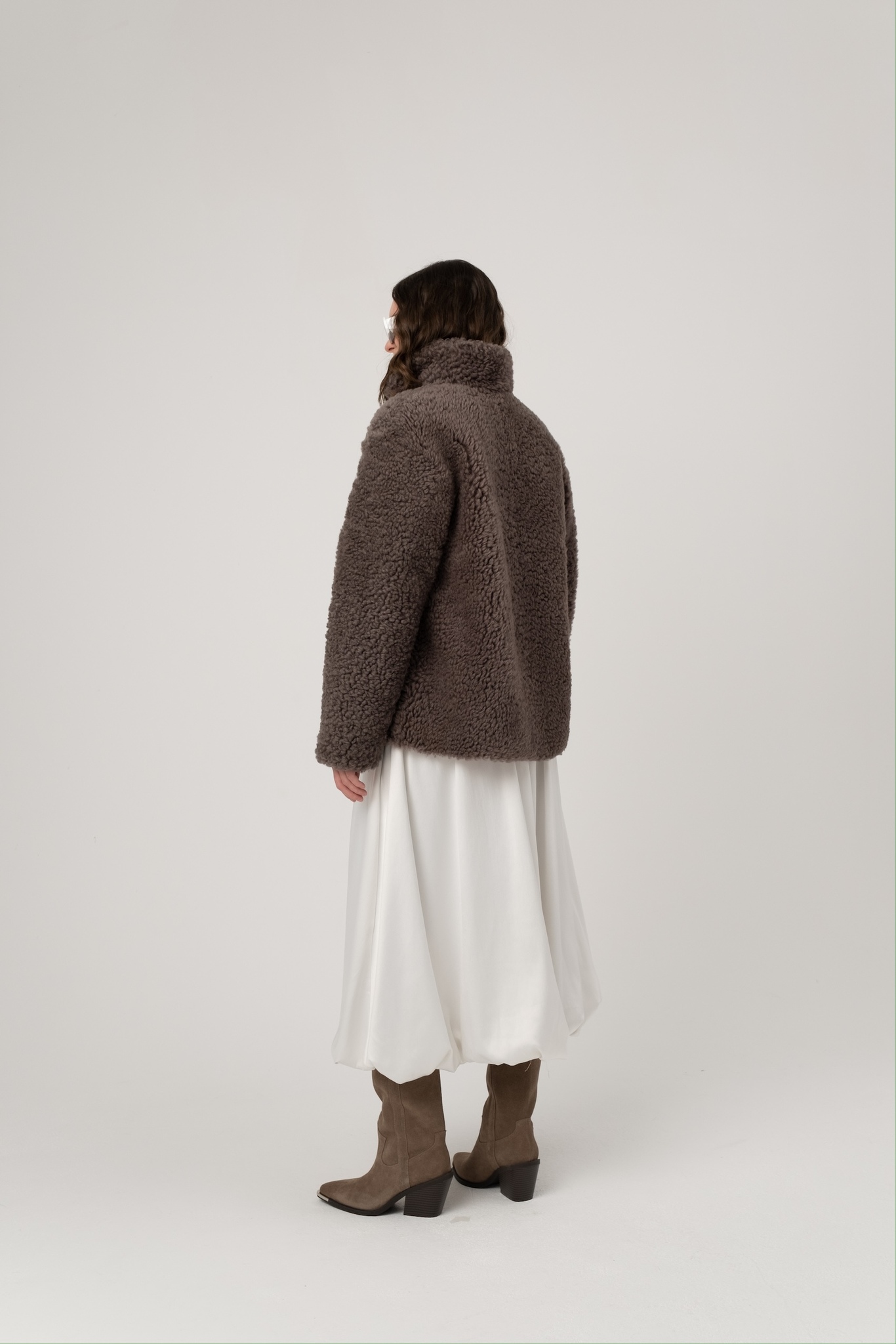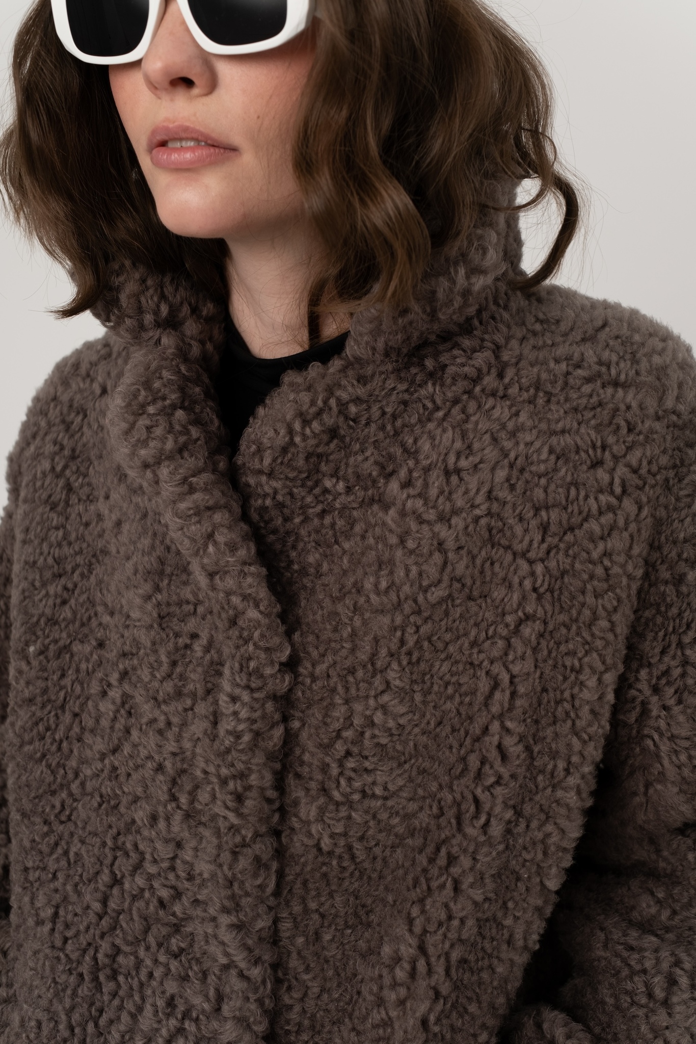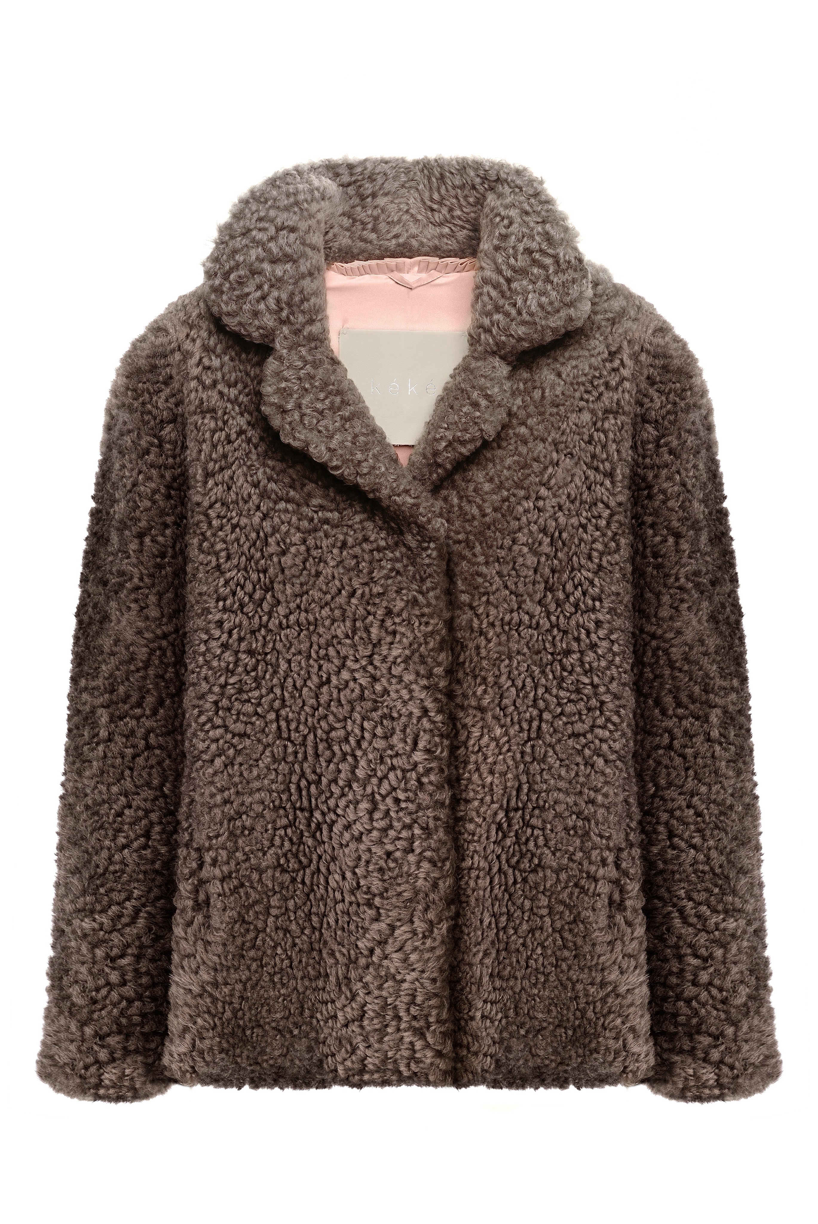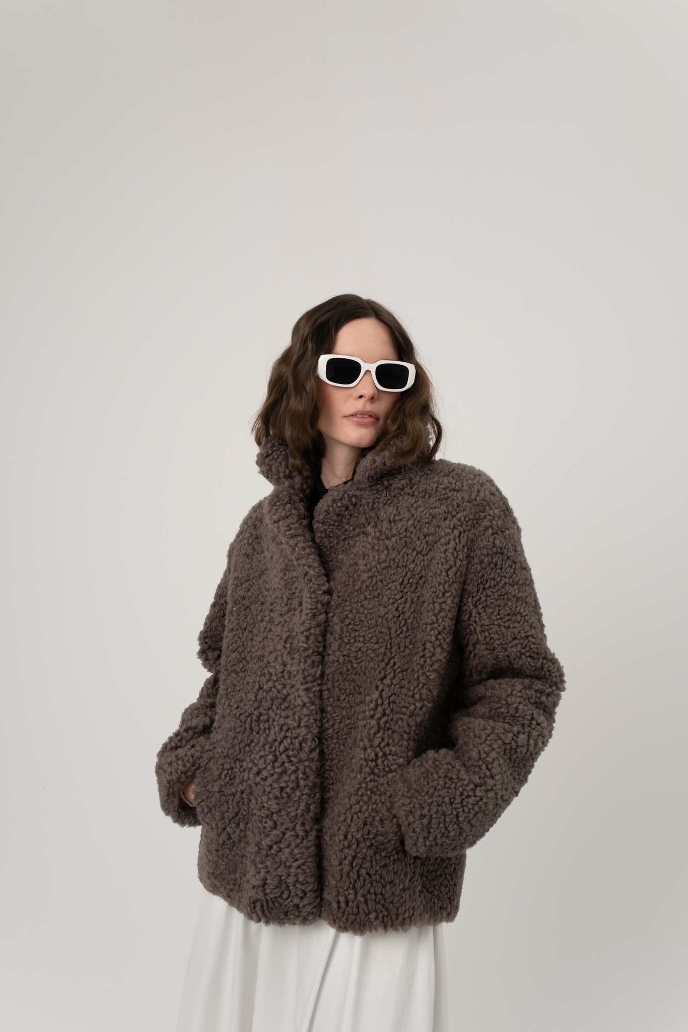 Шуба из исландской овчины с прорезными карманами. Английский воротник, положение которого регулируется. В подкладке есть потайной карман.