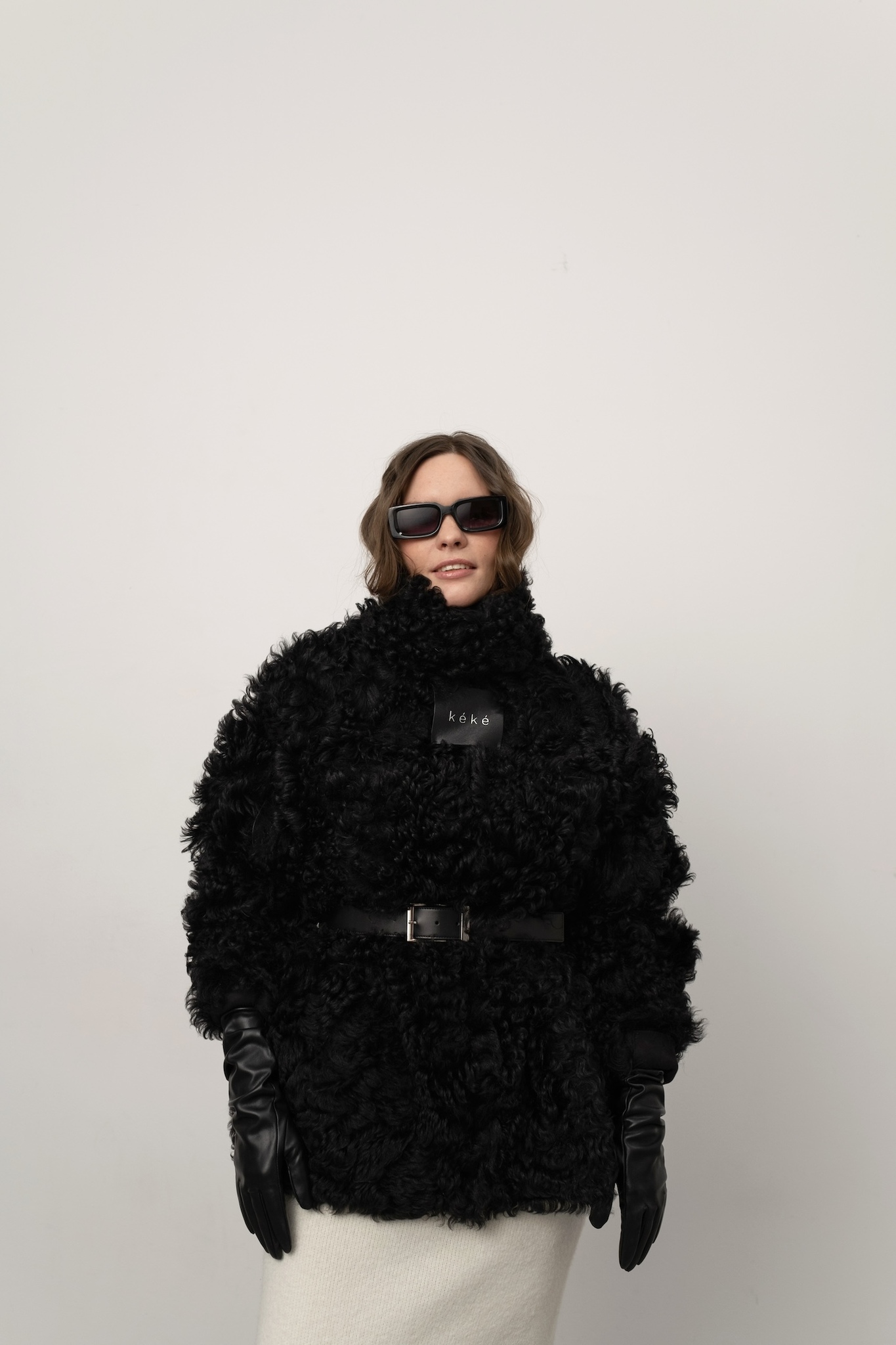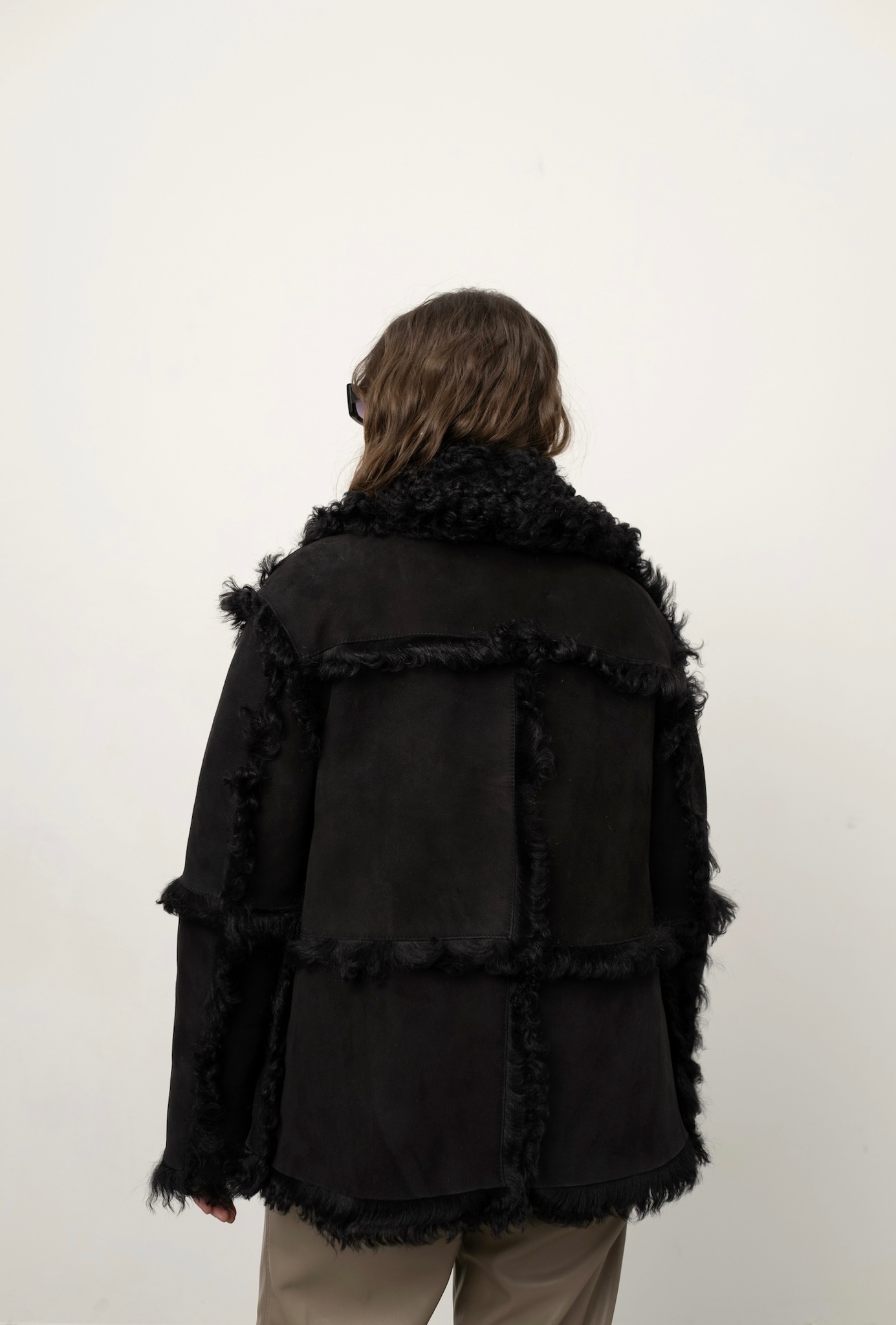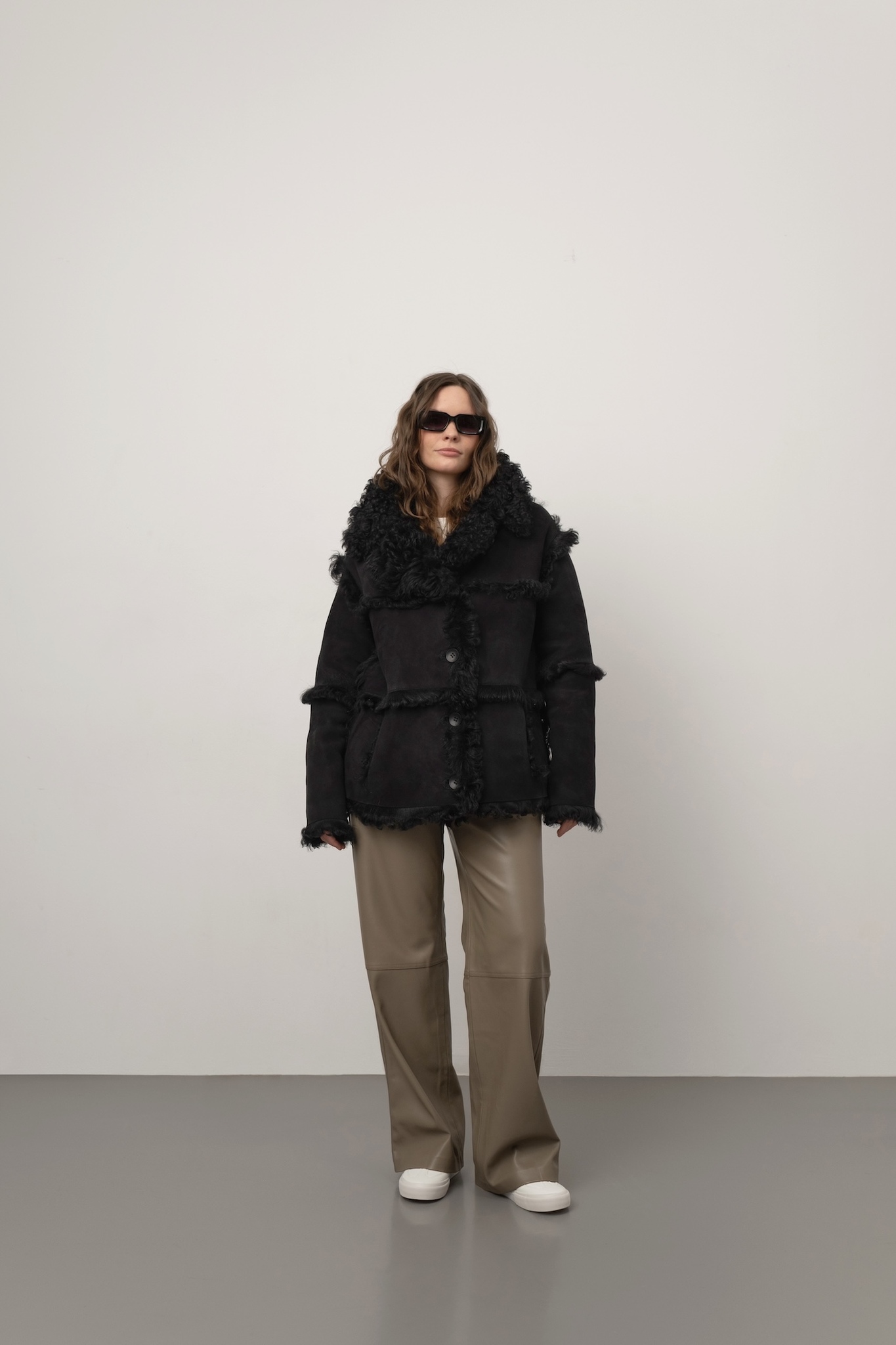 Двусторонняя шуба-дубленка из натуральной овчины. Английский воротник. Застёгивается на пуговицы. Длину рукавов можно регулировать, подгибая их.