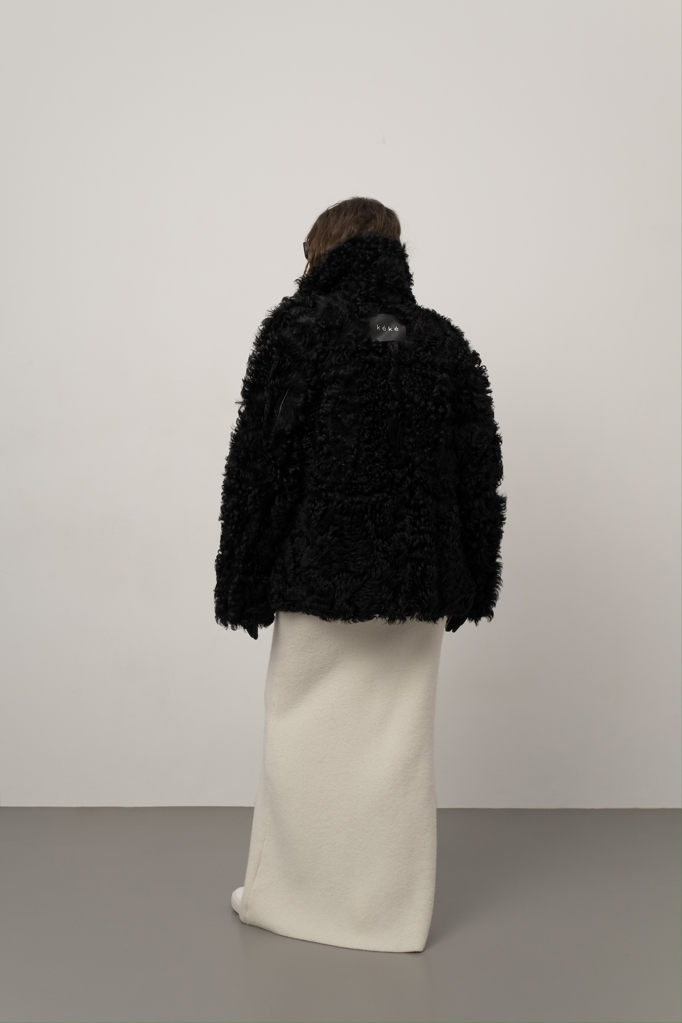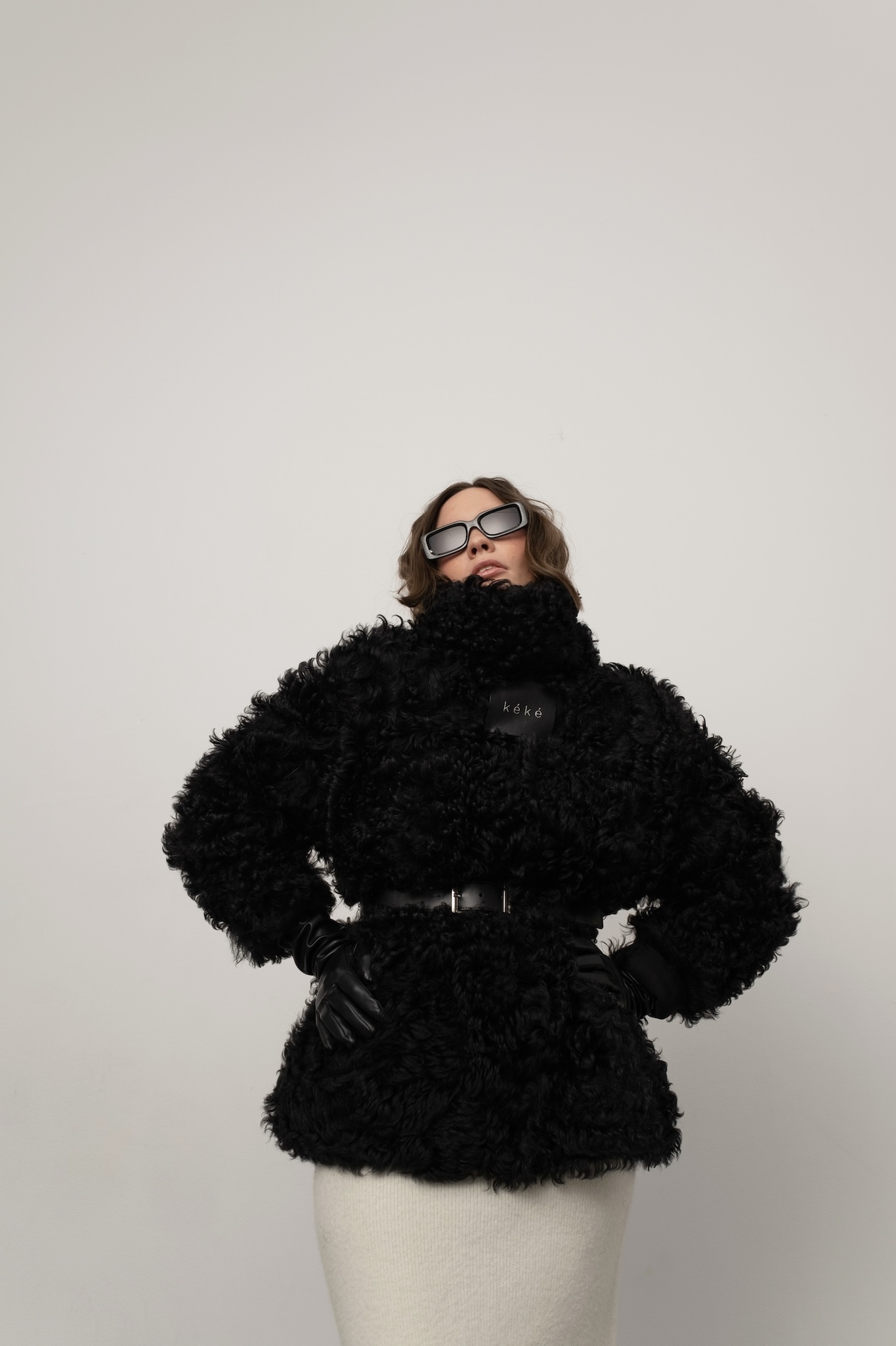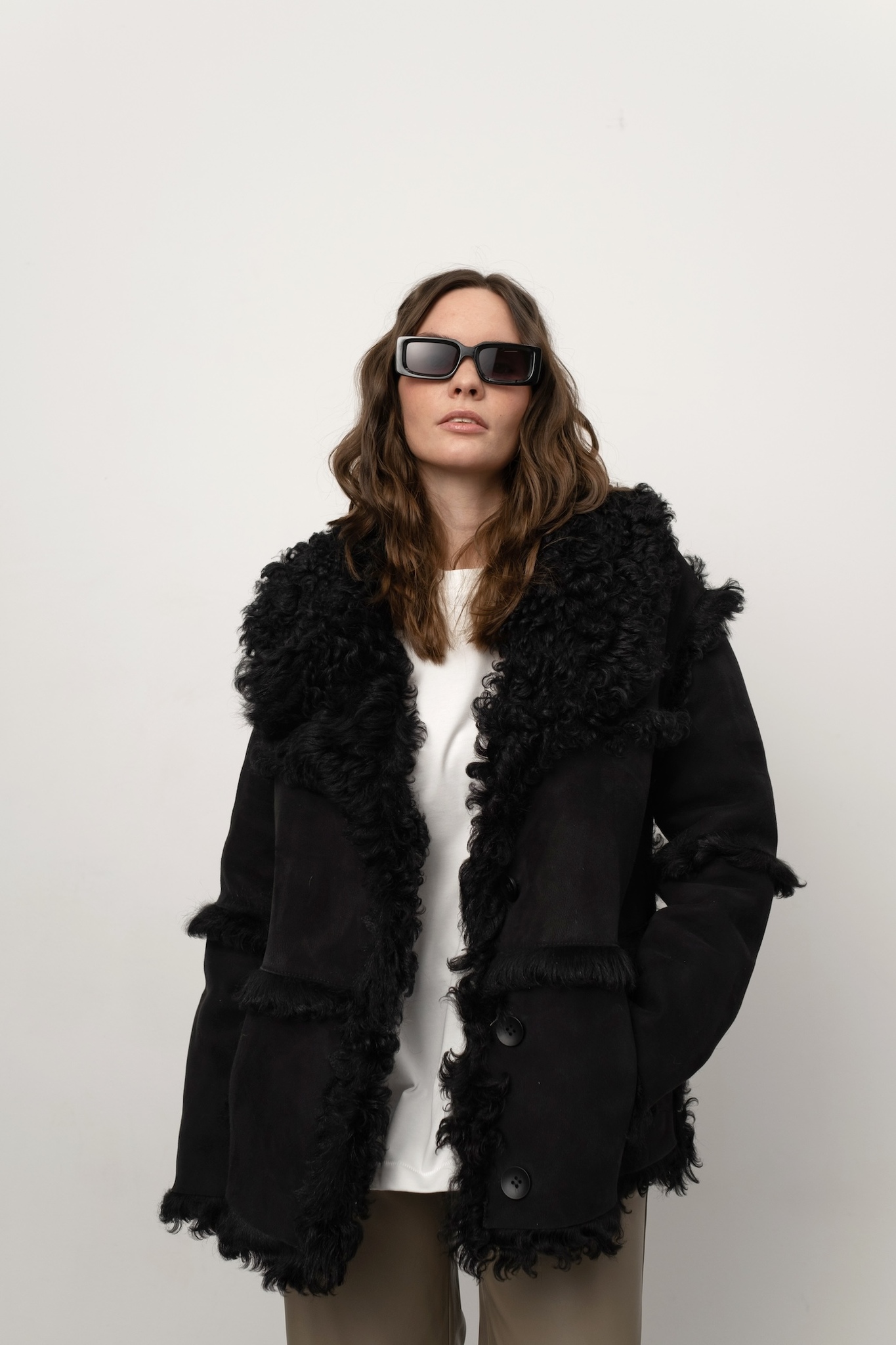Двусторонняя шуба-дубленка из натуральной овчины. Английский воротник. Застёгивается на пуговицы. Длину рукавов можно регулировать, подгибая их.