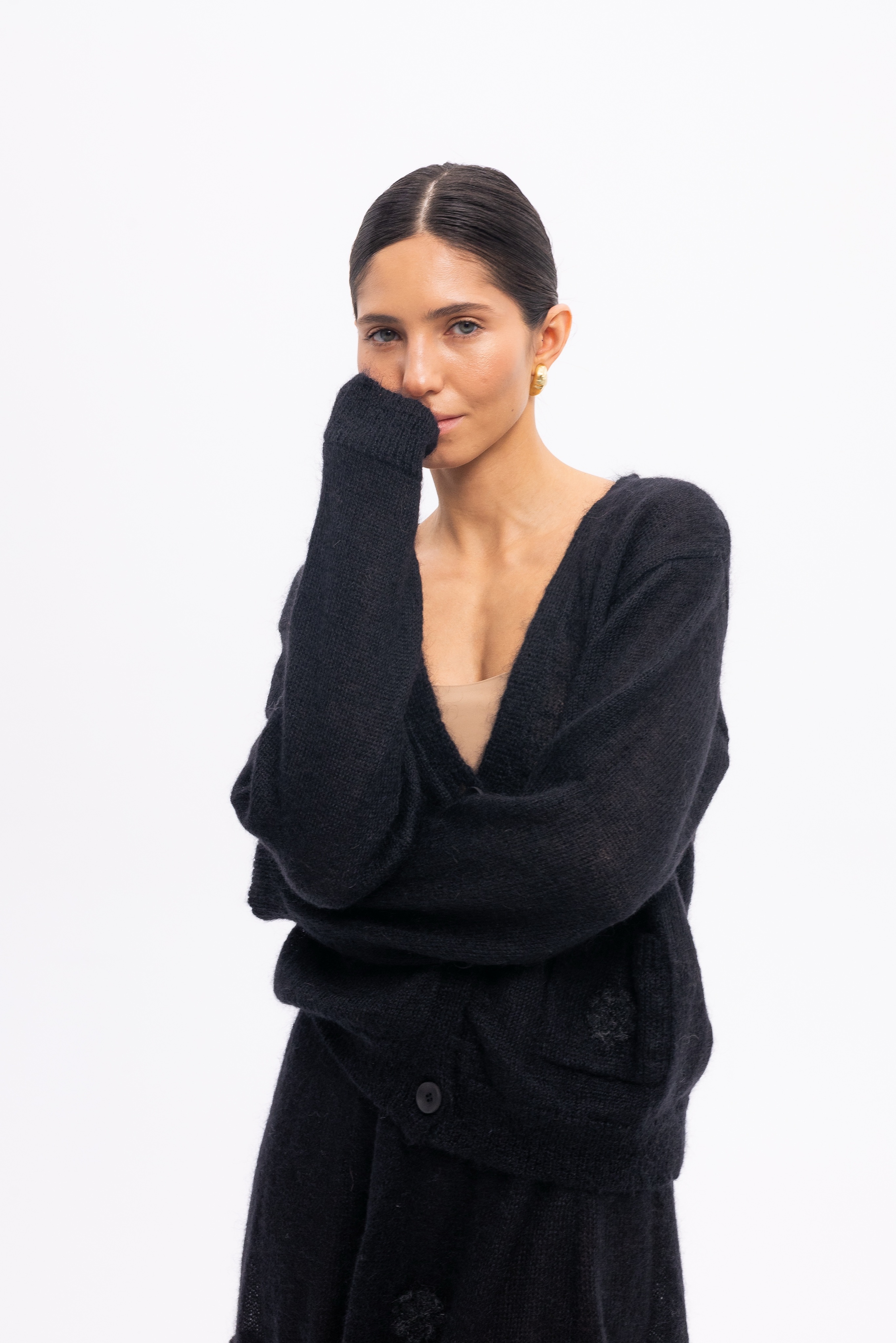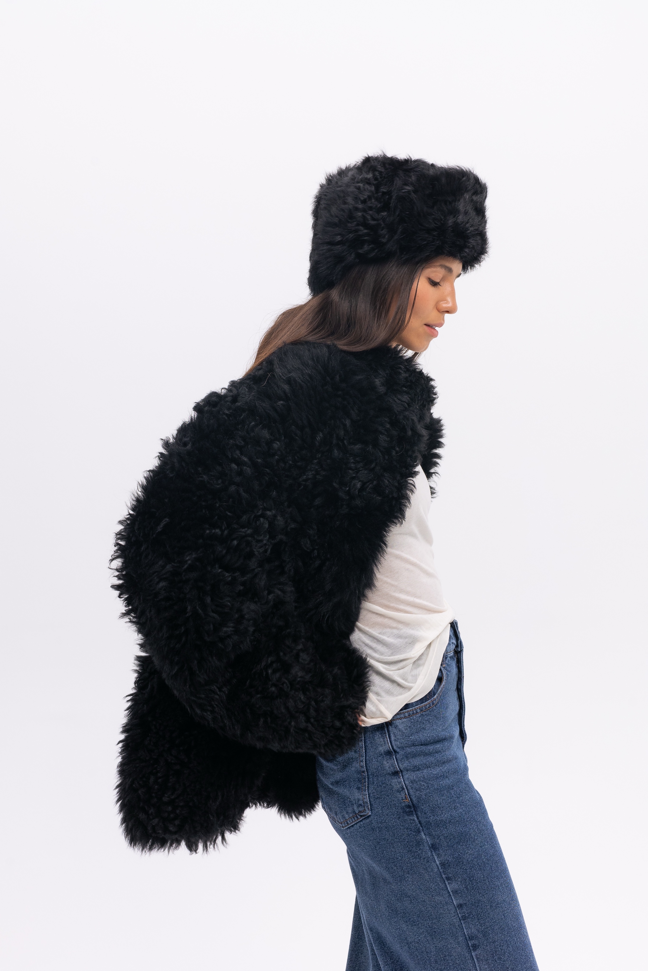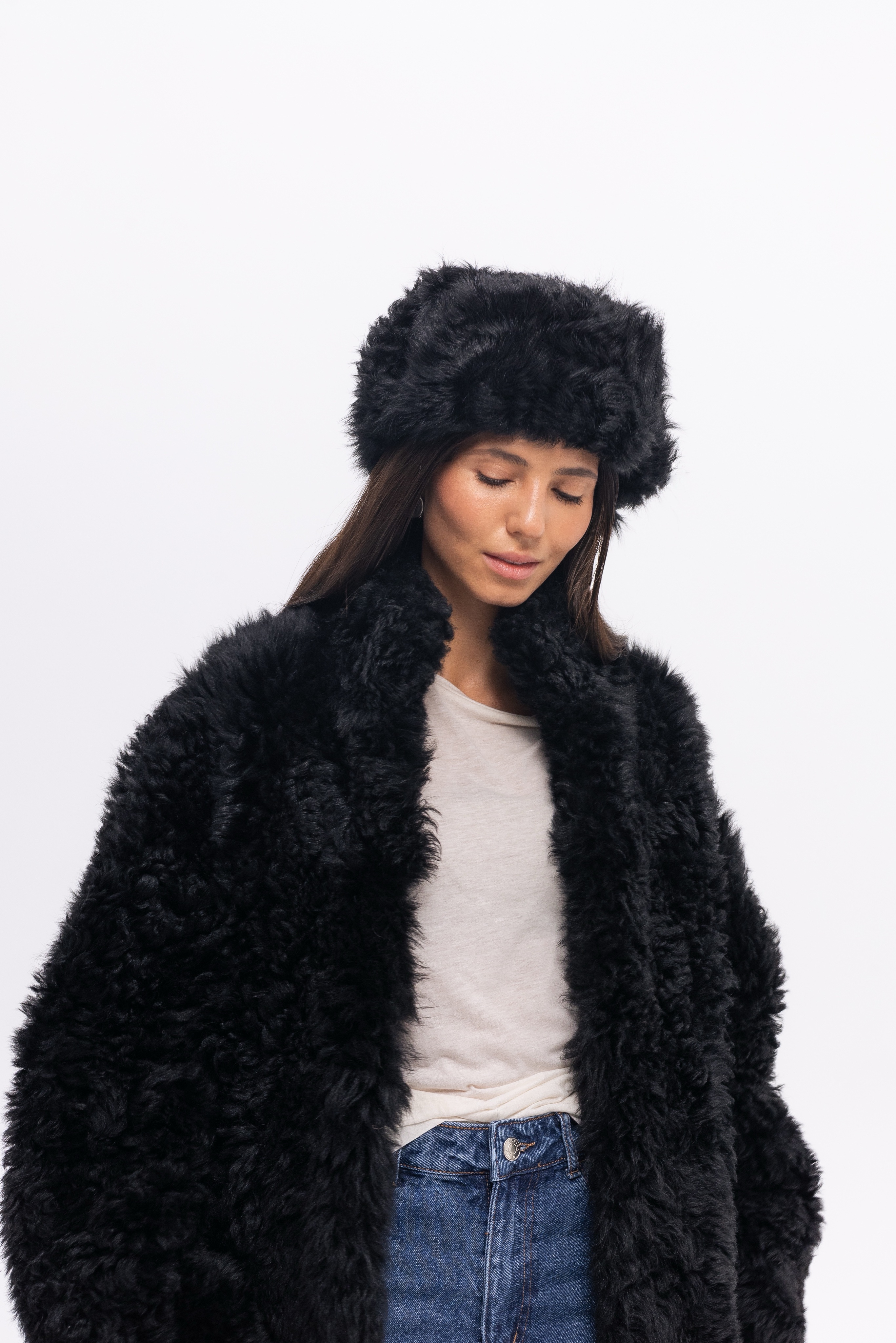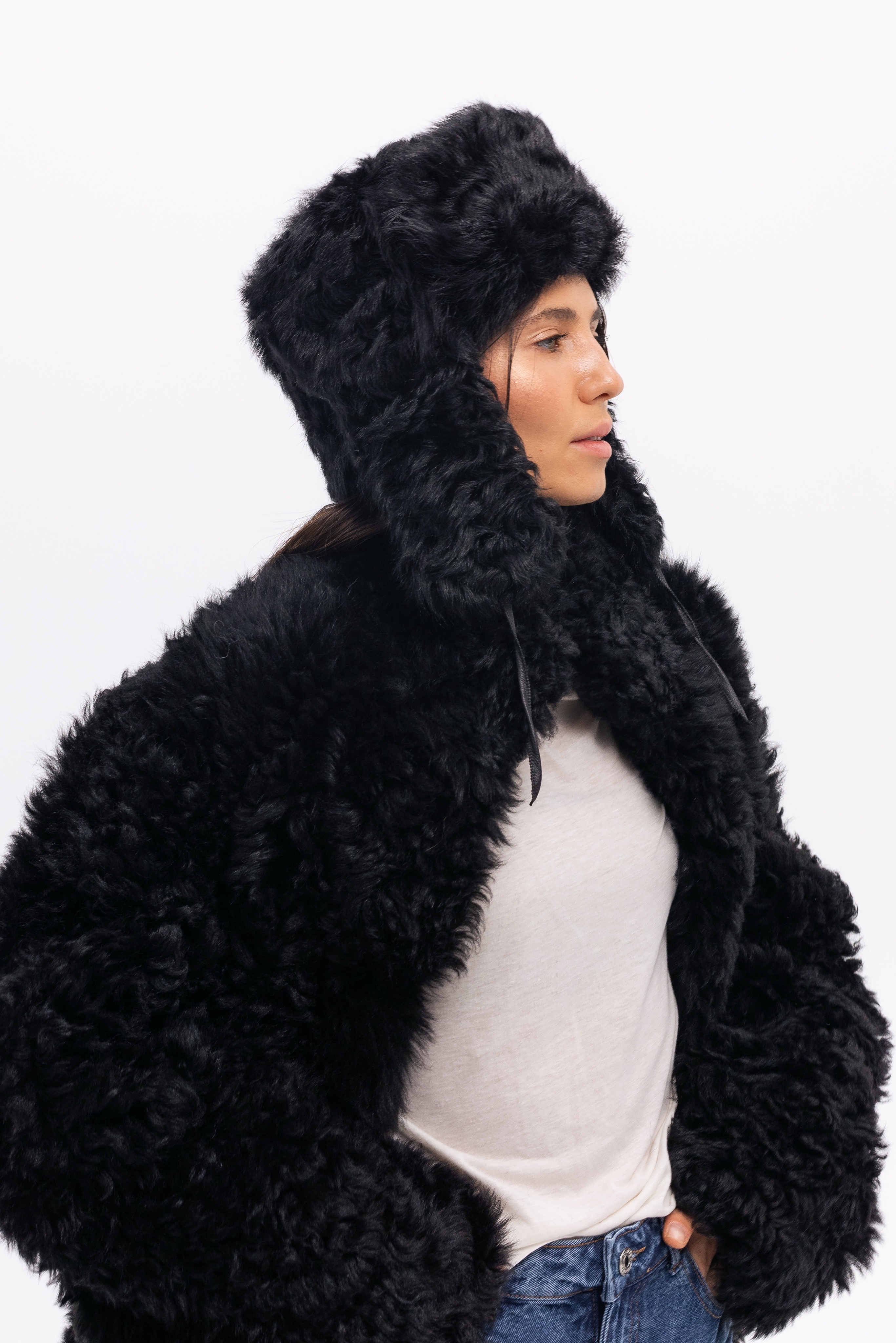 Шуба из кучерявой испанской овчины тиградо с накладными карманами. Английский воротник, положение которого регулируется. В подкладке есть потайной карман.