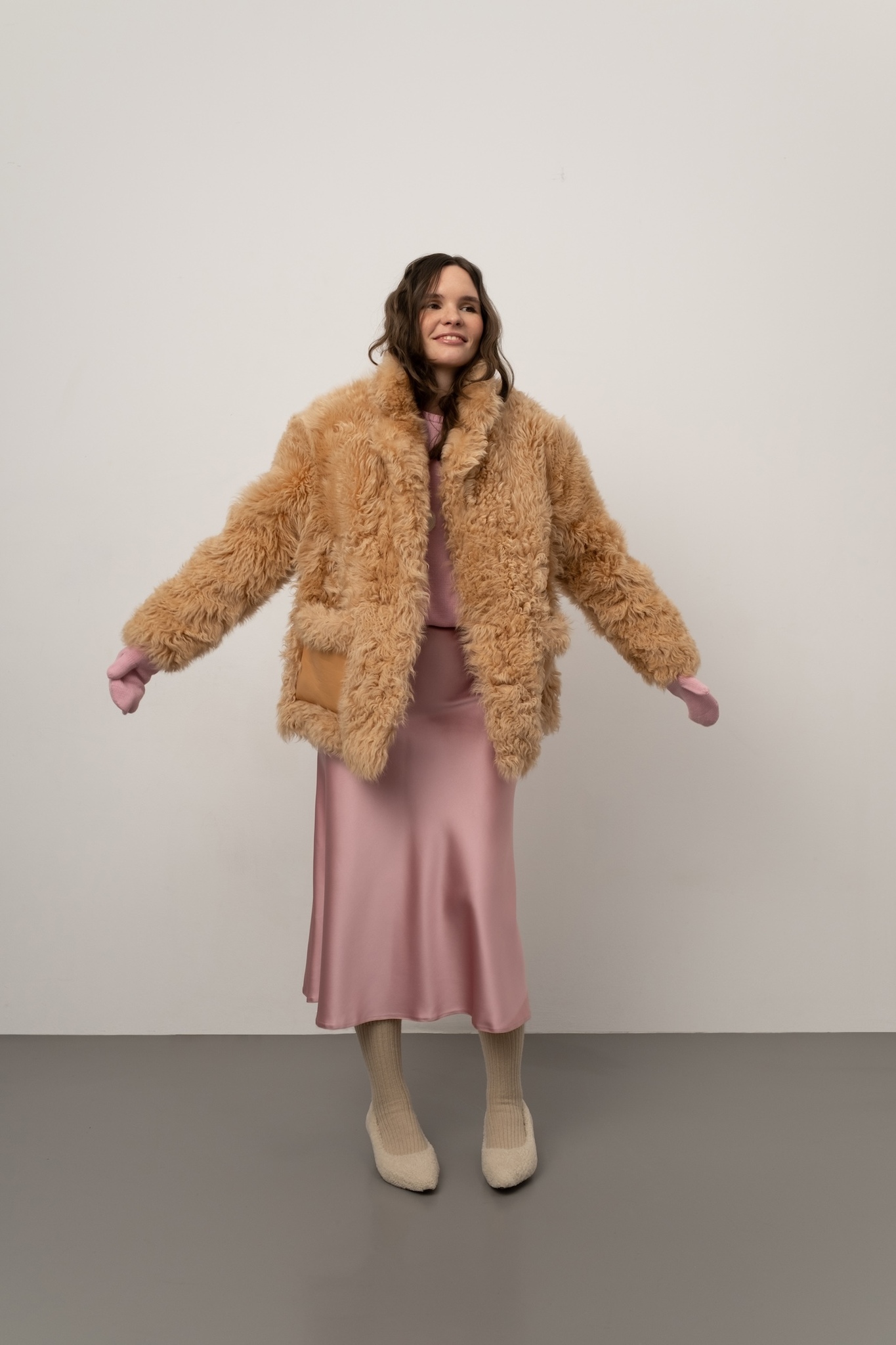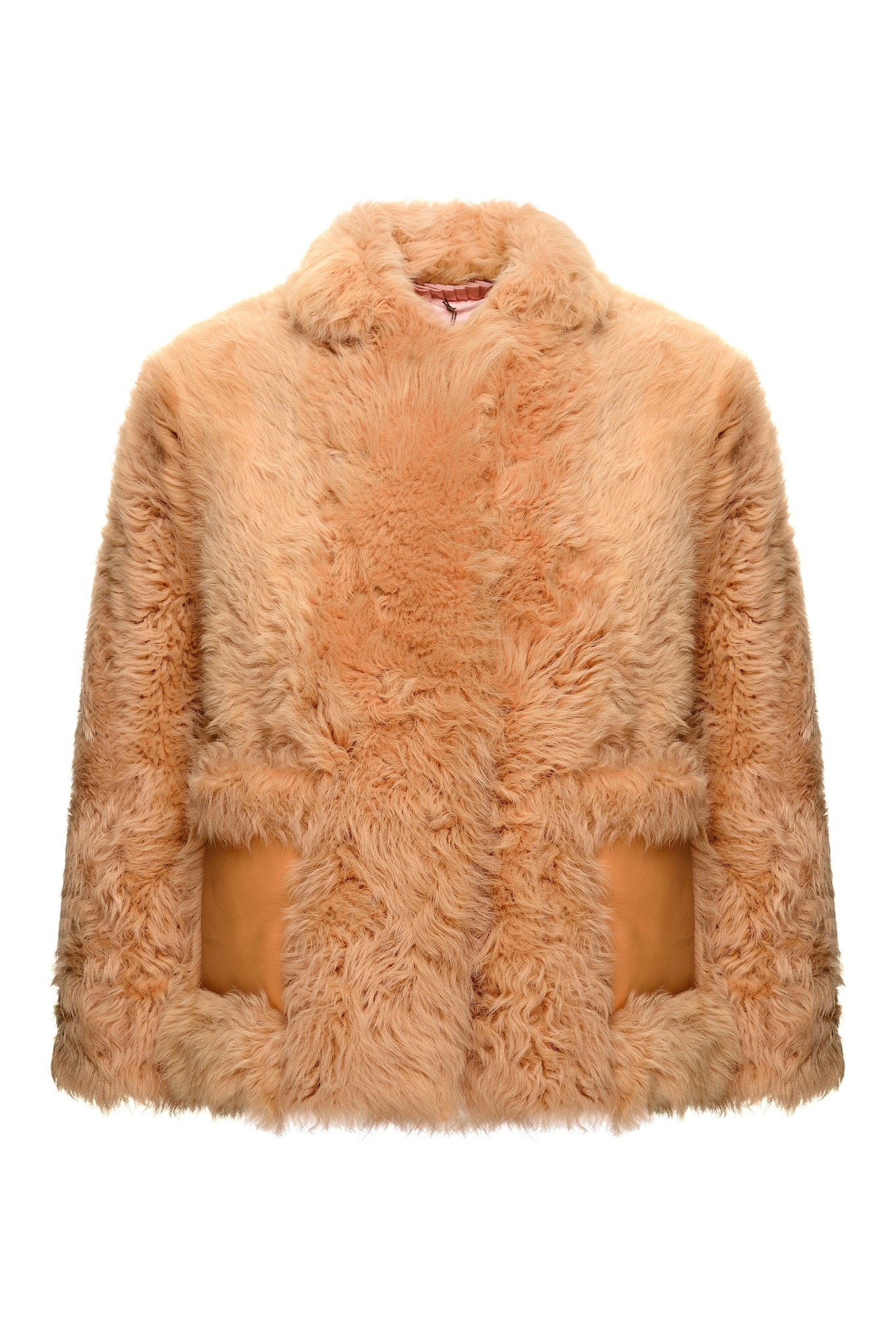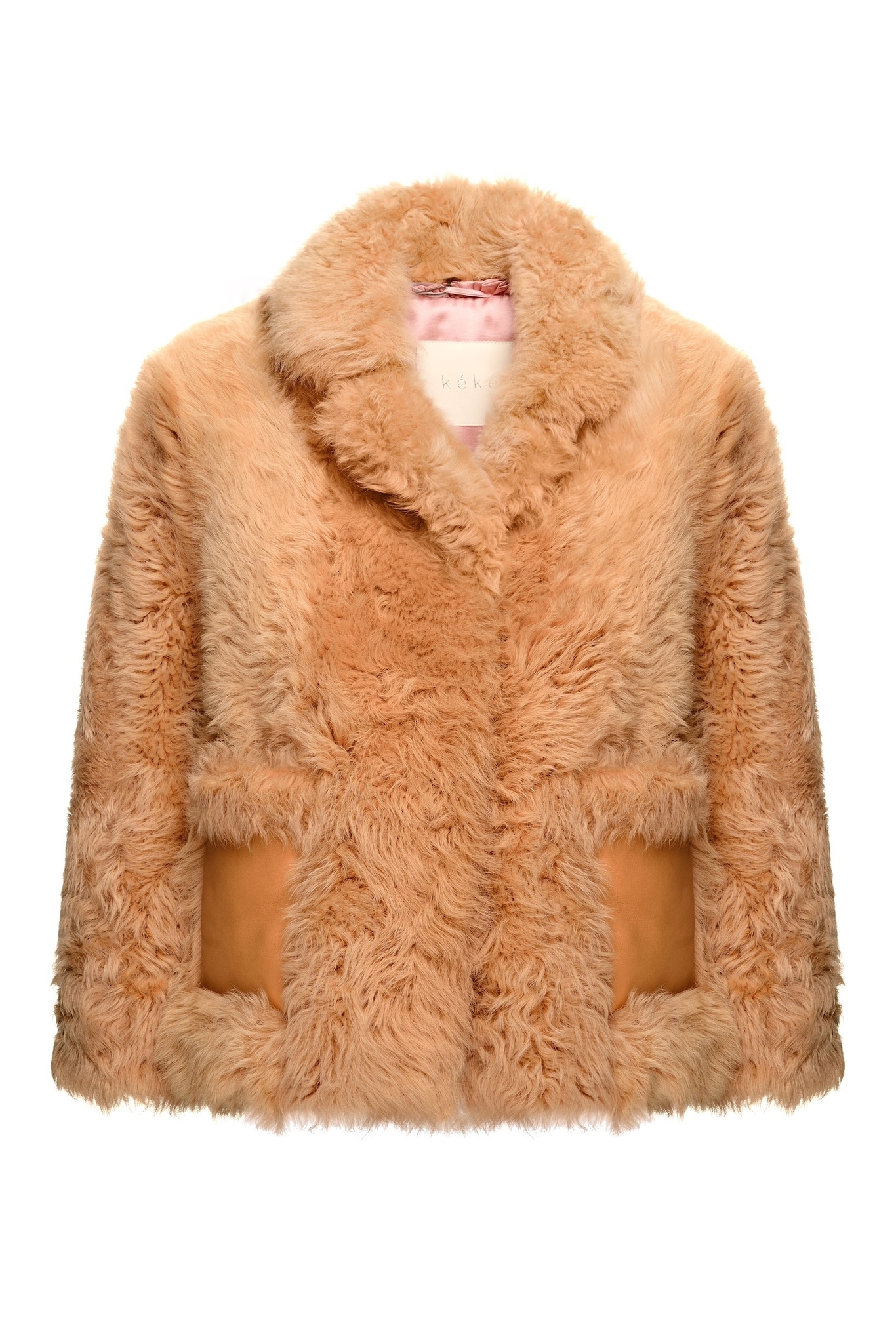 Шуба из кучерявой длинношерстной овчины тиградо с накладными карманами. Английский воротник, положение которого регулируется. В подкладке есть потайной карман.