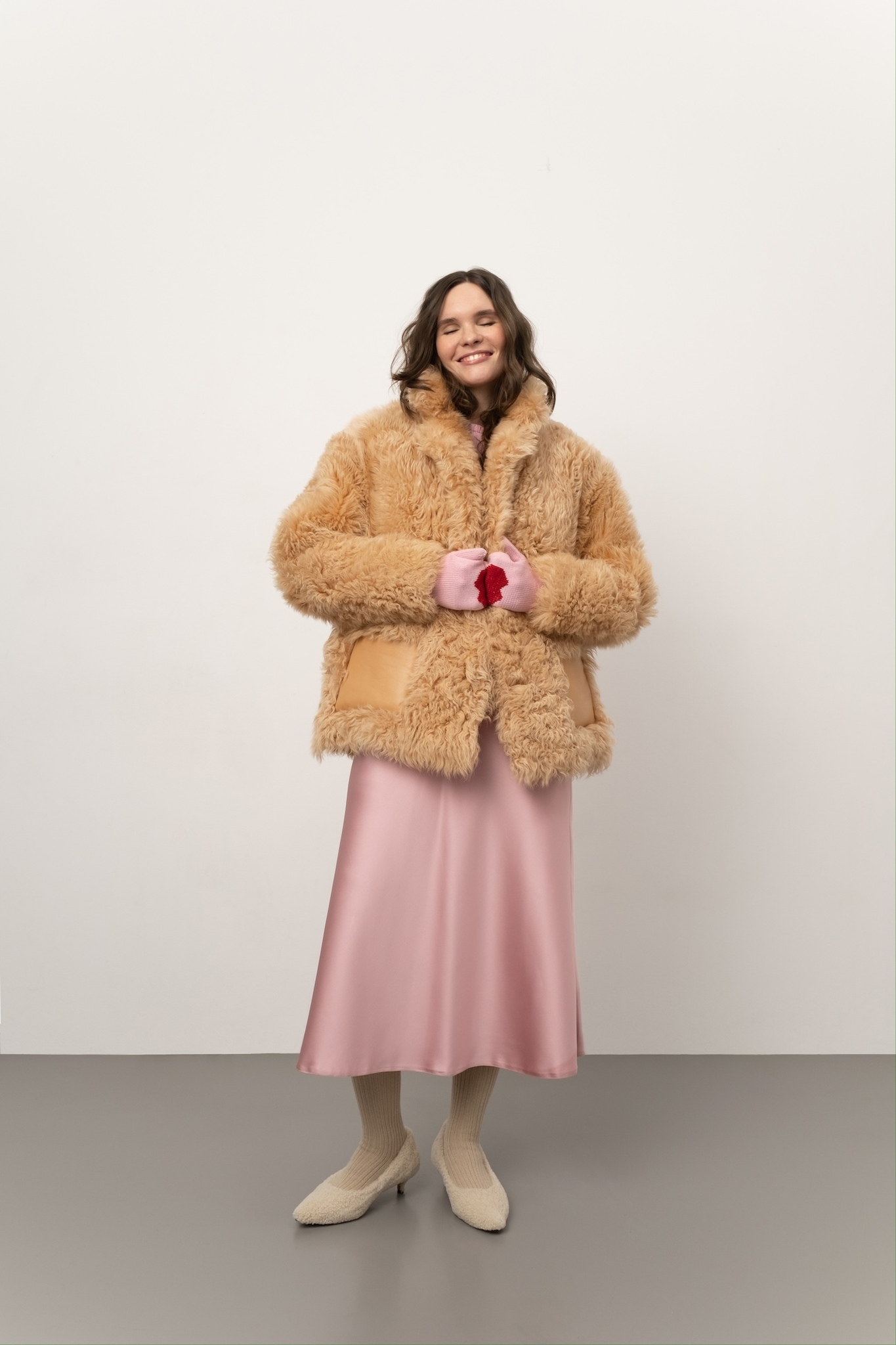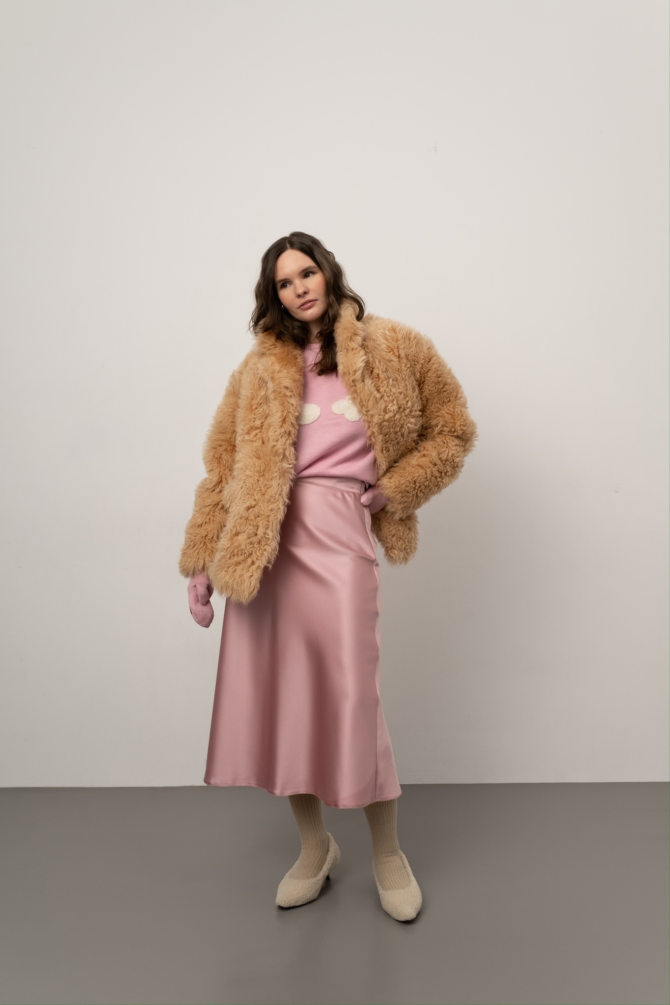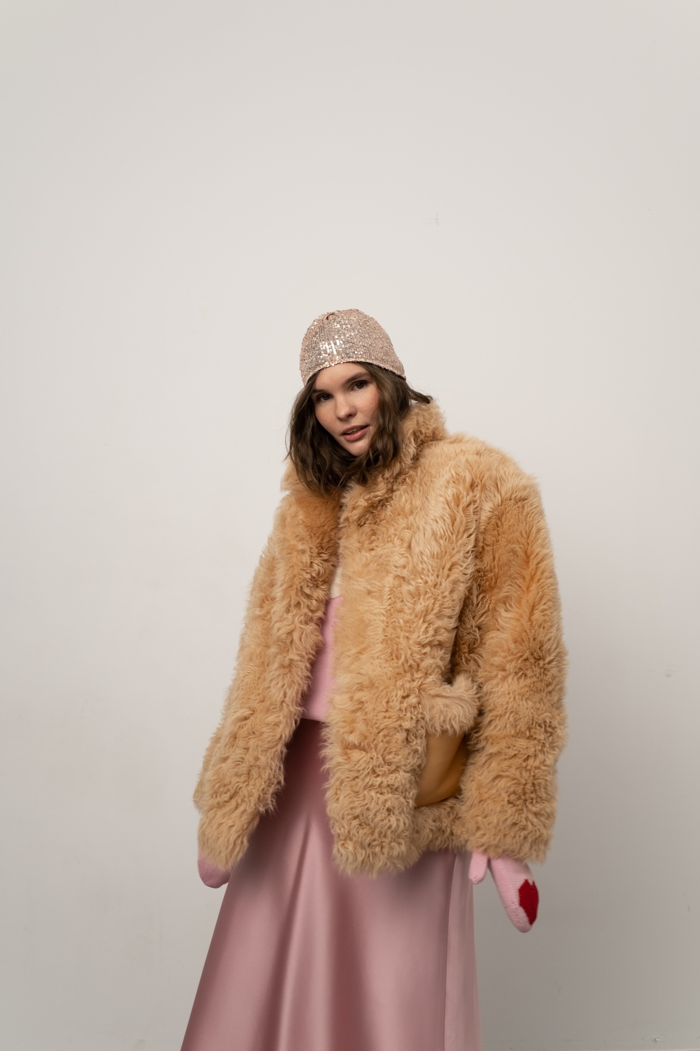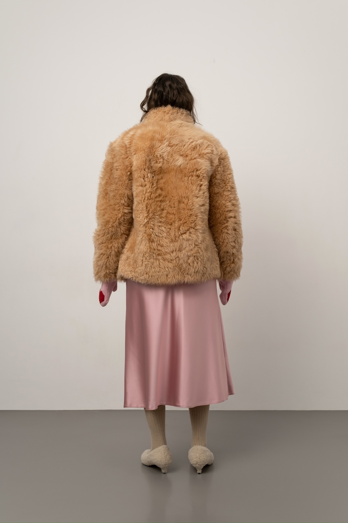Шуба из кучерявой длинношерстной овчины тиградо с накладными карманами. Английский воротник, положение которого регулируется. В подкладке есть потайной карман.