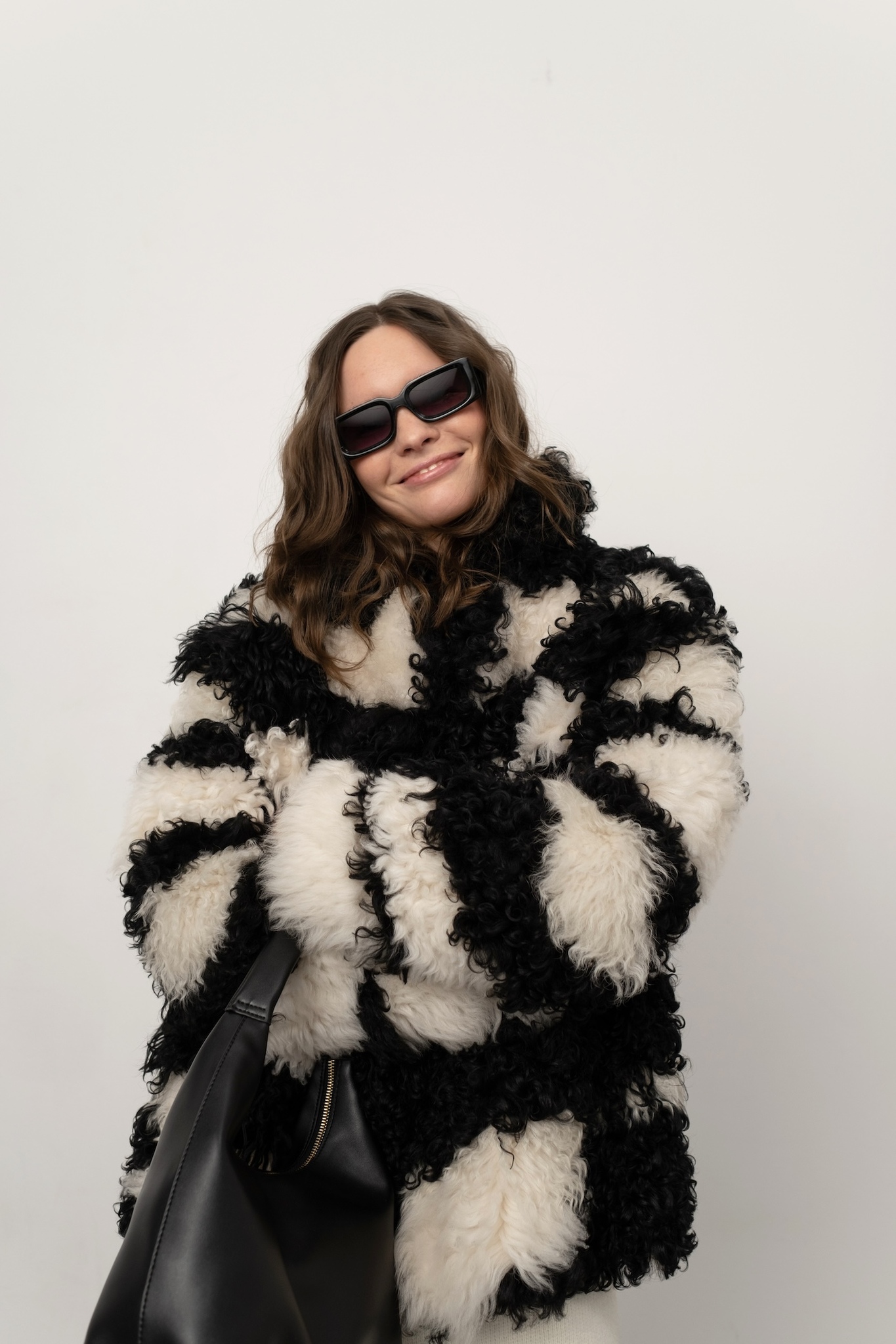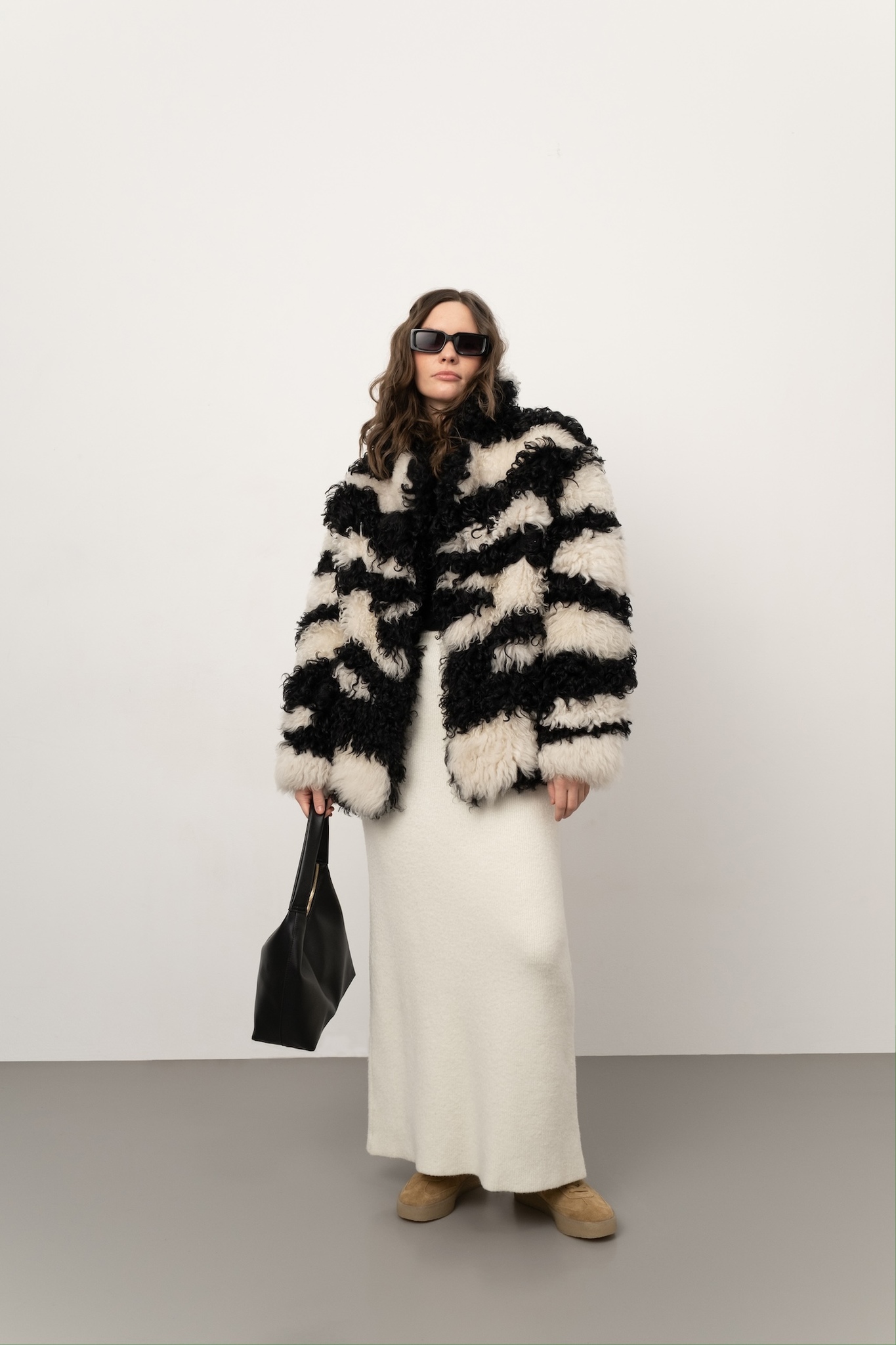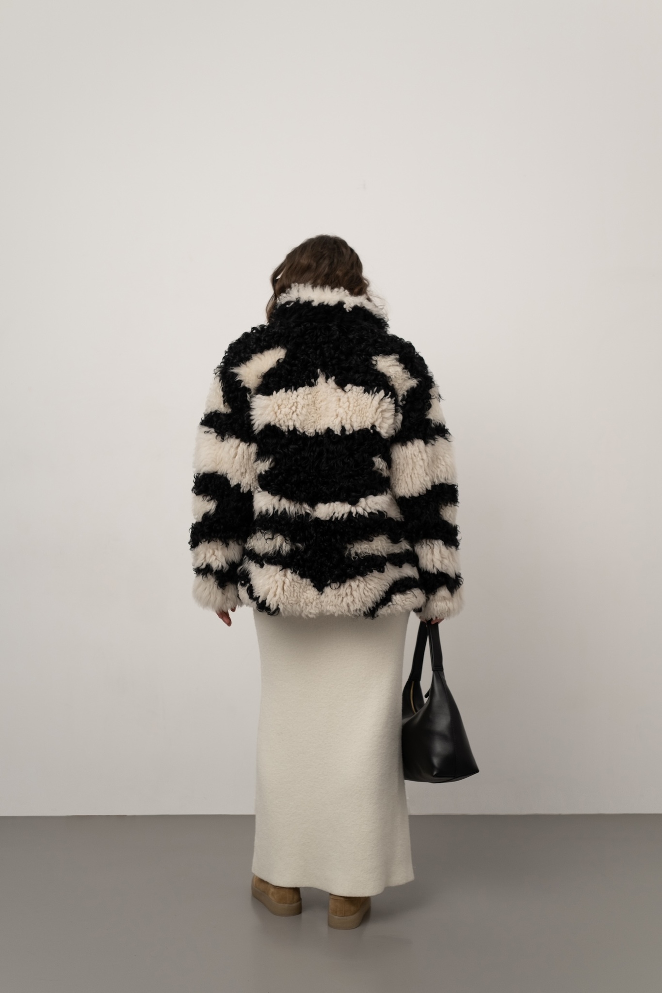Шуба из кучерявой длинношерстной овчины тиградо с прорезными карманами. Английский воротник, положение которого регулируется. Застёгивается на шубные крючки. Два прорезных кармана спереди и потайной карман в подкладке.