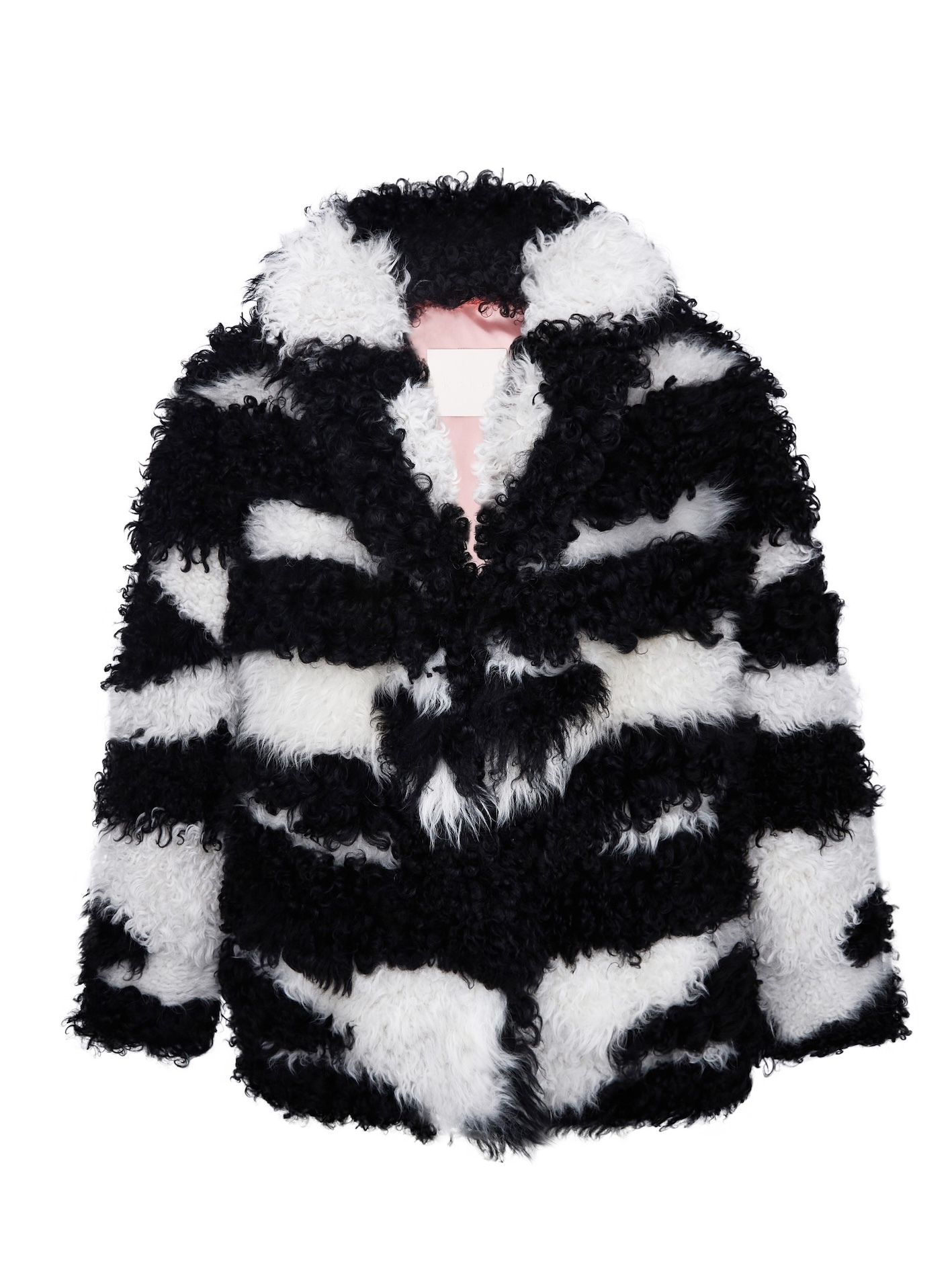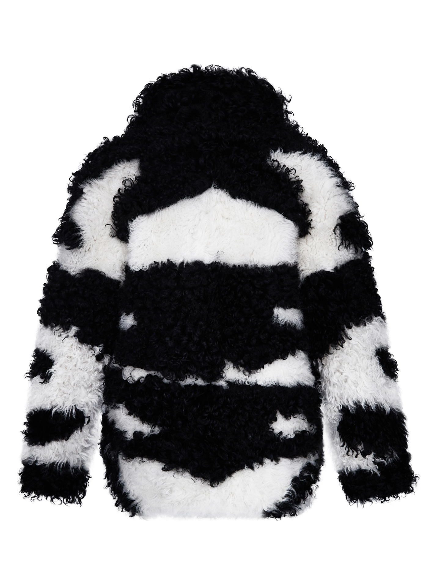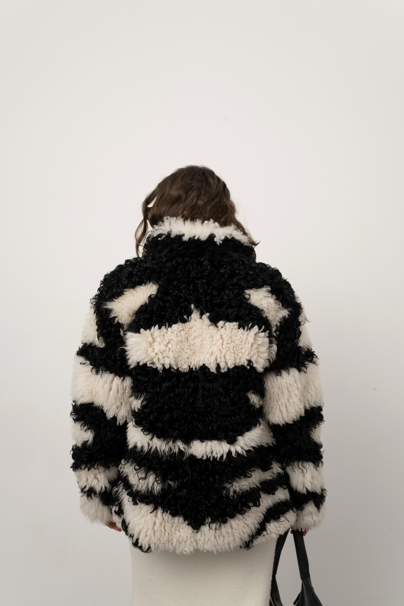 Шуба из кучерявой длинношерстной овчины тиградо с прорезными карманами. Английский воротник, положение которого регулируется. Застёгивается на шубные крючки. Два прорезных кармана спереди и потайной карман в подкладке.